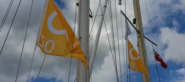 Zondagmorgen 10:00u palaver. Uitleg werd gegeven over de wedstrijd die om 11:00 uur zou starten voor de ingang van de haven. Er moeten daarna 2 boeien worden gerond en de finish was voor de haven van Falmouth. I.v.m. de te verwachten zwakke wind en sterke stroming was het waarschijnlijk dat de wedstrijd zou worden ingekort. Trossen los en de hele vloot verplaatste zich, onder weer een heerlijk zonnetje, naar de Solent. Omdat de meeste deelnemers kennelijk toch niet zo goed op de hoogte waren van de plaatselijke situatie en omstandigheden (en waarschijnlijk ook geen wedstrijdzeilers zijn) bleek een groot deel van de vloot ten tijden van het 5 minuten sein nog ver verwijderd te zijn van de startlijn. Zelfs met vol gas was het onmogelijk tegen de sterke stroming in op tijd te starten. Via de marifoon werd uitgelegd dat een ieder dan maar zijn eigen starttijd moets noteren en ook de finishtijd. Dat werd dan ook direct maar de eerste boei, want er was vrijwel geen wind. Geen echte wedstrijd dus deze keer.