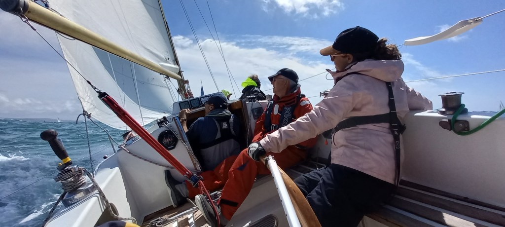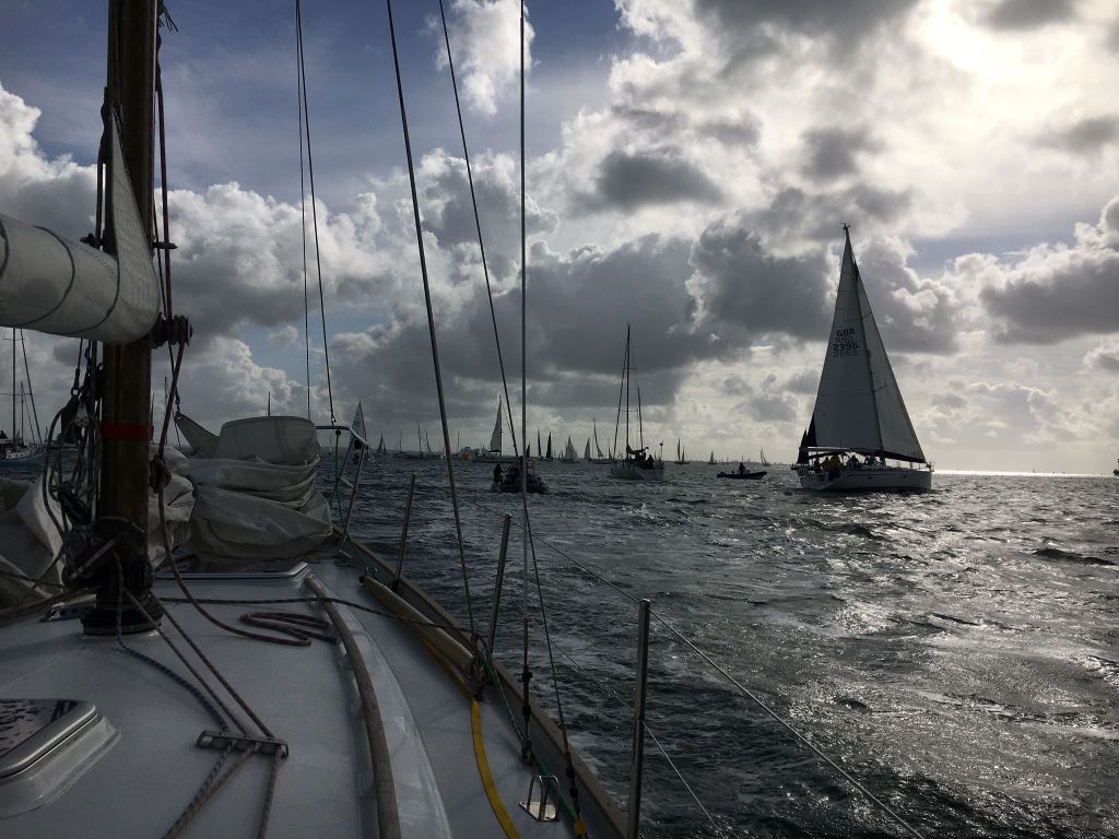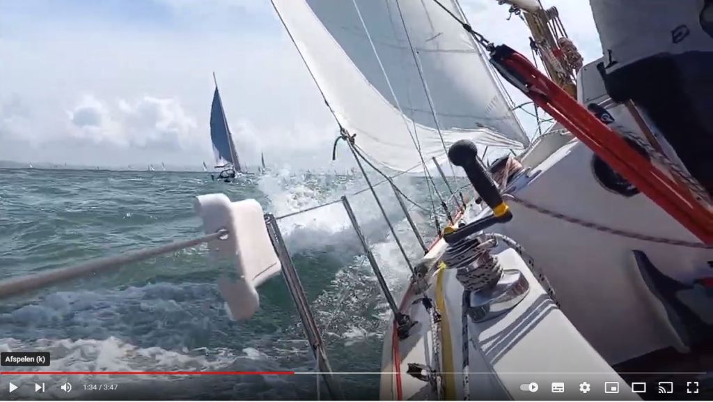 Na de Needles 60gr. Aan de wind, tegen tij, tot St. Catherines. We hebben een goed bootsnelheid, varen gelijk op met andere Contessa’s die dezelfde koers volgen. Enkele andere Contessa’s hebben ervoor gekozen de langere weg langs het eiland te volgen omdat ze aan het einde even tij mee zouden gaan krijgen. Zij komen bedrogen uit omdat op dat moment de wind meer naar het zuiden krimpt en ze een paar slagen moeten maken. Bij het rond van St Catherines (rond 13:30uur) kan de spi er nog niet op. Wel is de wind wat in kracht afgenomen en wij wisselen genua 2 voor de reacher. Zo blijven we twee andere Contessa’s, die wel met Genua 1 zijn gestart, waar we samen mee opvaren voor. Na Ventor kan de spi er wel op. Even lijkt de wind wat te minderen maar ze trek toch weer aan tot de verwachte 13-15kn. Bij Bembridge de boei ronden en gijpen. (15:30 uur) Dat is nog even spannend met deze windkracht en een andere Contessa Starstreak dichtbij aan stuurboord, die ons geen ruimte geeft om even pal voor de wind te varen. Rond 16:30uur we gaan zo krap mogelijk over de ondiepte van Ryde Sands. De ogen van Koert wijken geen moment van de plotter. 2 of 3 andere schepen doen dat minder goed en lopen aan de grond.