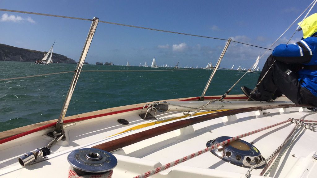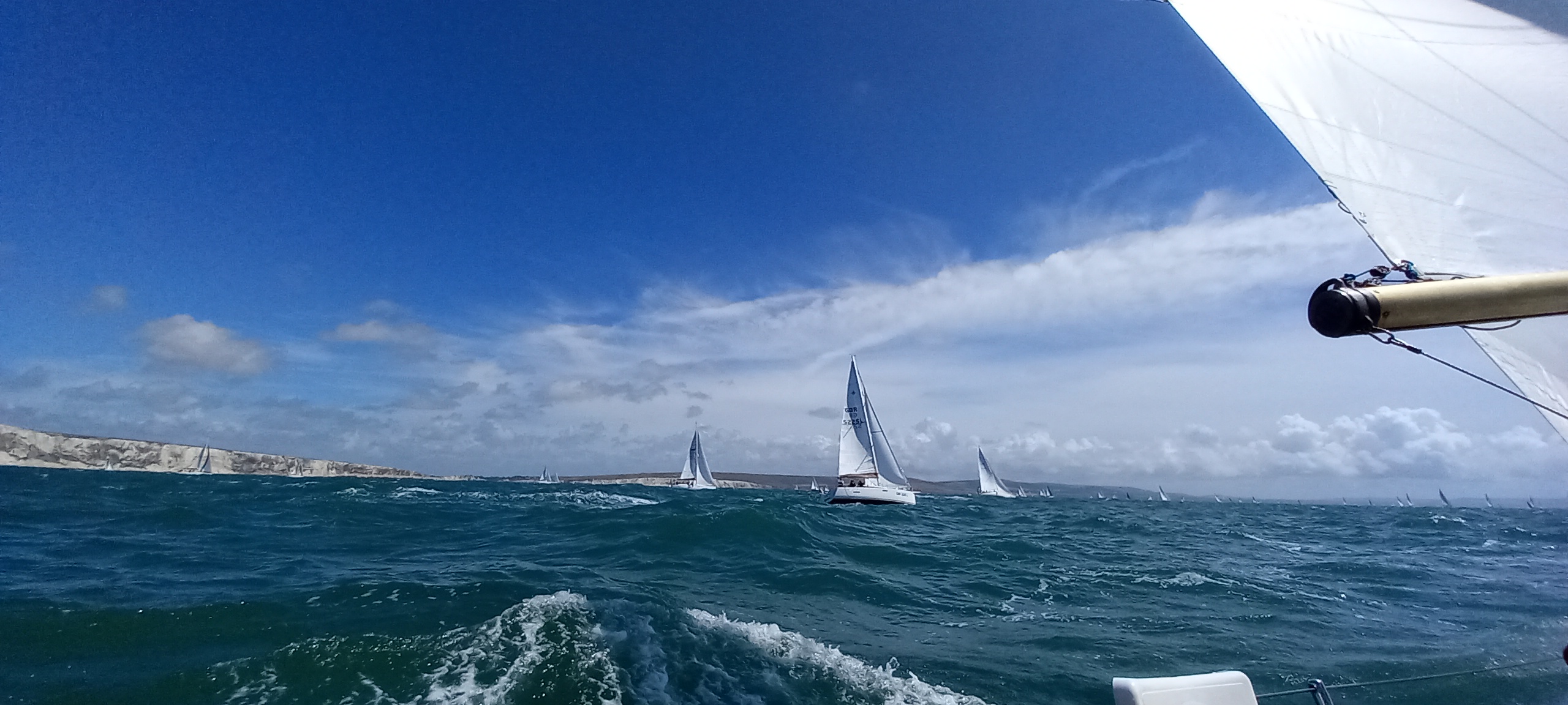 Zaterdag 25 juni. In totaal ca 1100 deelnemers met vanaf 08:00uur elke 10 minuten een start. Onze start om 09:20 uur. De voorlaatste Group. In totaal 45 schepen, waaronder 23 Contessa’s 32. Windverwachting 15kn ZZW. Tij mee. Een erg lange startlijn. Wij kiezen voor de bovenzijde. Dat doen de meeste deelnemers, dus het duurt even voordat we vrije wind hebben. Genua 2, vol grootzeil. Lange rakken tot aan de Needles. Wind regen tij. Vooral aan de noordzijde lage kant behoorlijk steile golven. Onze navigator Koert heeft vooraf exact bepaald waar we telkens het beste overstag kunnen gaan, op basis van de heersende wind en de plaatselijke stroomrichting en -snelheid. (Boekje Winning Tides, speciaal besteld in Engeland) Volgens de thuisblijvers die ons op internet via de tracker kunnen volgen, liggen we op dat moment 5e of 6e in de subgroep Contessa 32. 11:10uur de Needles gerond. Het blijft altijd een gok waar het wrak precies ligt, je wil het uiteraard niet raken, maar je wil er ook niet te ruim omheen gaan.