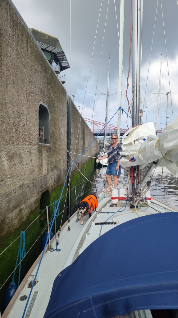 Aldaar kijken we of de voorspellingen nog steeds ongunstig zijn, en dat blijkt het geval. De komende dagen wordt het Zuiderwind en vrij hard (5-6bft). We hebben geen zin om het nauw van Calais onder die omstandigheden voor het eerst te gaan verkennen en ook heeft ons derde bemanningslid, scheepshond Beau, wat last van haar poten. Dit willen we ook haar niet aandoen en we besluiten weer naar boven te verhuizen. Naderhand bleek dit een goede beslissing, we zouden moeite hebben gehad om weer onder redelijke omstandigheden naar het Noorden terug te komen. Nogmaals, het moet voor iedereen aan boord leuk zijn en vakantie blijven.