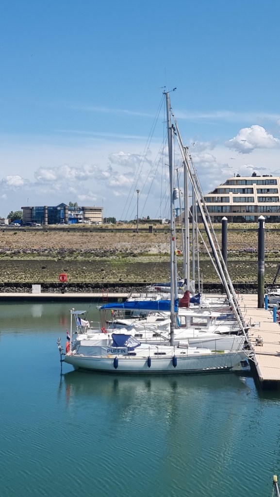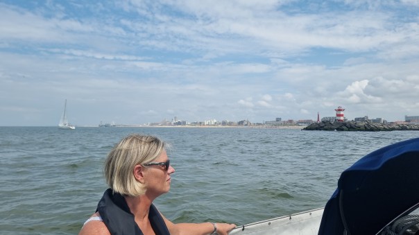De Roompot en Westerschelde hebben we al eerder bevaren, maar de oversteek naar België is nieuw: het gastenvlaggetje mag voor de eerste keer uit de verpakking en het want in. Enige zorg had ik wel over de aanloop van Blankenberge vanwege de verzanding van de ingang, maar dat blijkt volslagen onterecht: de dieptemeter gaf op zijn minst 7,9m diepte aan (wel met HW). De ontvangst in Blankenberge door de dienstdoende havenmeester is allerhartelijkst en we eten mosselen in De Sloepe, op de hoek van de haven. Dat restaurant kennen we van een eerder bezoek aan het stadje, maar toen als landrotten.