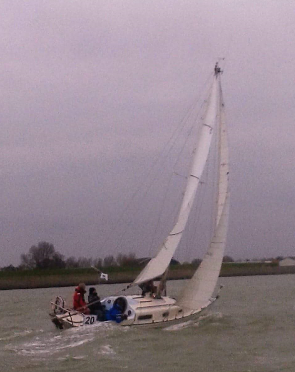 De wedstrijden 1e zaterdag van december konden geen doorgang vinden i.v.m. de dichte mist. Iedereen is dus erg enthousiast om deze 1e zaterdag van januari weer het water op te gaan. Het heeft de gehele week hard gewaaid, woensdag zelfs zeer hard gestormd. De weersverwachting voor zaterdagochtend, geen wind, vanaf 13:00uur 8kn oplopend naar 11kn Dat bleek tegen te vallen. Om 13:00 uur als iedereen i.v.m. de lage waterstand al buiten is, is er totaal geen wind. De start wordt 2x een half uur uitgesteld. Dan kan er toch gestart worden. Op het tijdstip van de start is er net voldoende wind om de wedstrijd te starten. Omdat de wind gaandeweg de wedstrijd toch iets toeneemt tot een mooi zeilwindje werd het nog een mooie zeildag. Vanwege de aanvankelijke onzekerheid over de wind is er voor een betrekkelijk kort baantje gekozen. Door de windrichting had de baan voor het zeilen wel een bijzonder vorm: zoals je kan zien op de foto’s is ongeveer 75% van de baan met spinaker gezeild. Dit keer twee Contessa’s aan de start. Lecas en Ondine. Ondine is tijdig aan de start, Lecas iets te traag. 1e rak is een reach rak, tegen tij, Lecas hijst direct de spinaker, Ondine twijfelt en wordt voorbijgelopen. Toch de spinaker maar gehesen en dat blijkt een goede keuze. De achterstand op de concurrenten wordt niet groter. Bij de bovenboei spi naar beneden en aan de wind, tij mee, naar de overzijde van het vaarwater. Daar kan de spi er weer op, richting Oosterscheldebrug SVK11. Lecas is in een strijd gewikkeld met twee concurenten. Tot overmaat van ramp breekt het spiblok. Ondine heeft vrije wind. Bij SVK 11 gijpen met de spinaker en direct naar de finishlijn. Ondine gijpt direct bij de boei en kan aan de hoge kant van het vaarwater blijven. Lecas moet, om een aanvaring met één van de concurrenten te vermijden, niet gepland nogmaals gijpen en verliest daardoor terrein. Lecas en Ondine komen daardoor vrijwel gelijktijdig over de finishlijn. Uitslag van de dag, Ondine 3, Lecas 5. (Lecas heeft een andere rating o.a. ivm de vaanstandschroef).