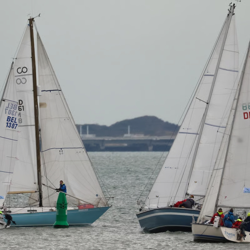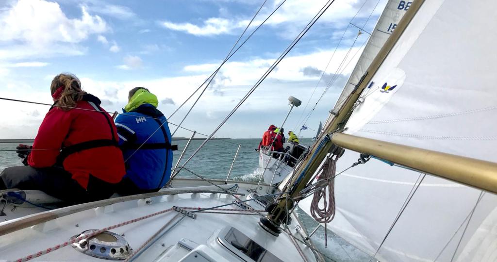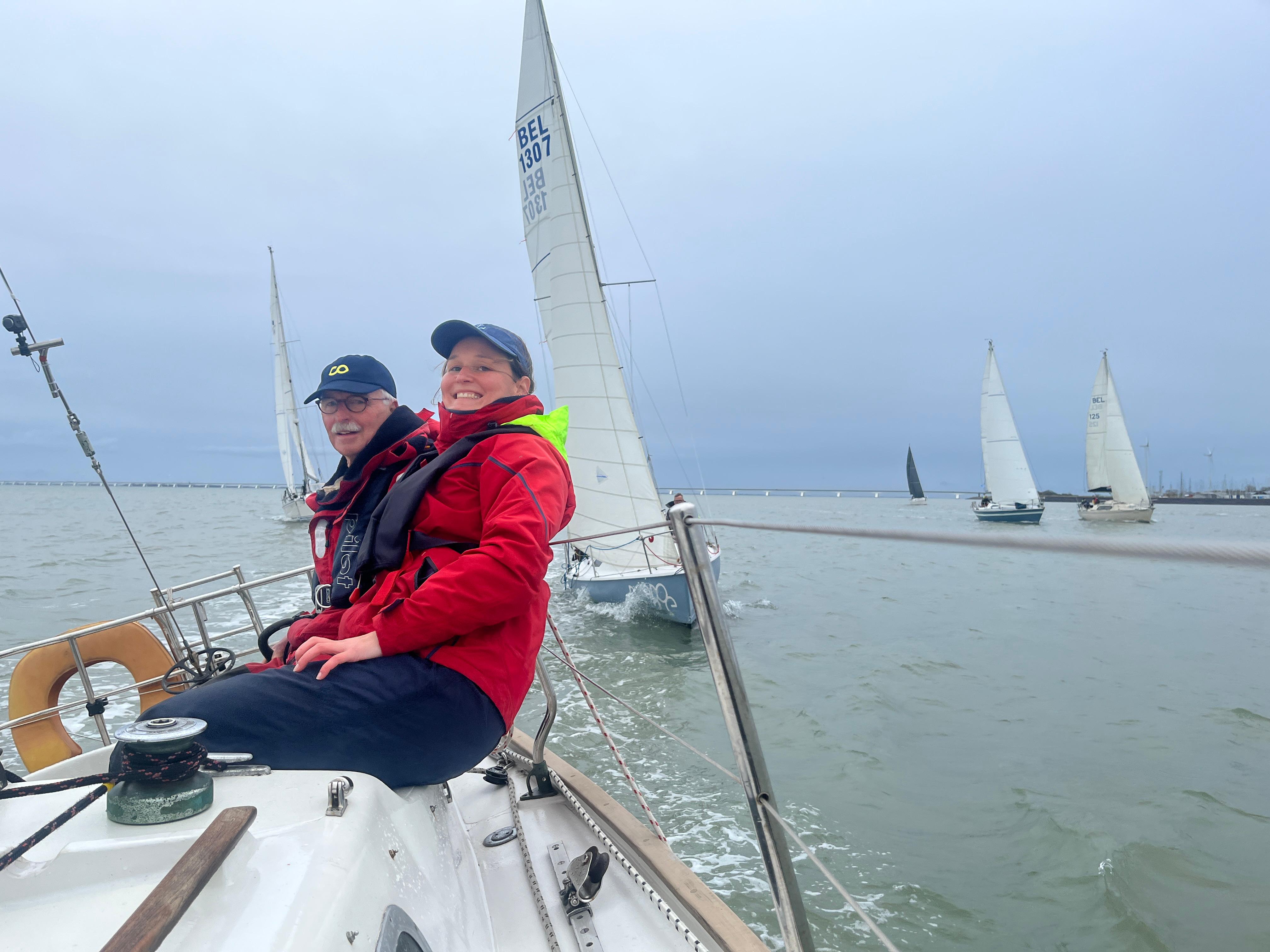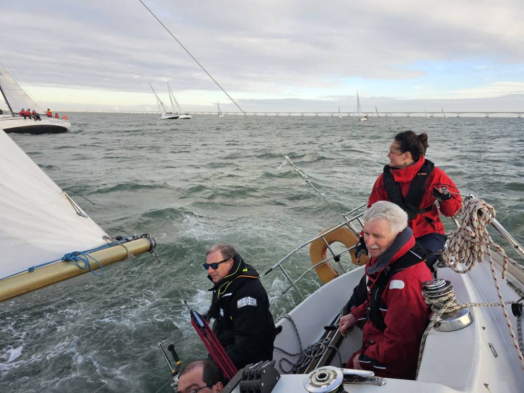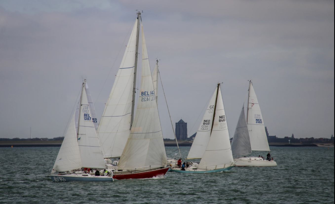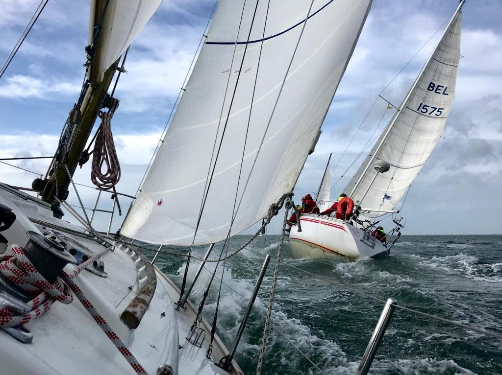 Iedereen is vroeg aanwezig en de boot is snel klaar voor vertrek. In de kuip koffie met de gebruikelijk Vlaamse koffiekoeken. We schrijven op tijd in en halen de gegevens van de baan op. Start naar het westen! Tij en wind mee. Dat wordt weer een uitdaging. We gaan op tijd naar buiten om de zeilen te trimmen en de startlijn te verkennen.