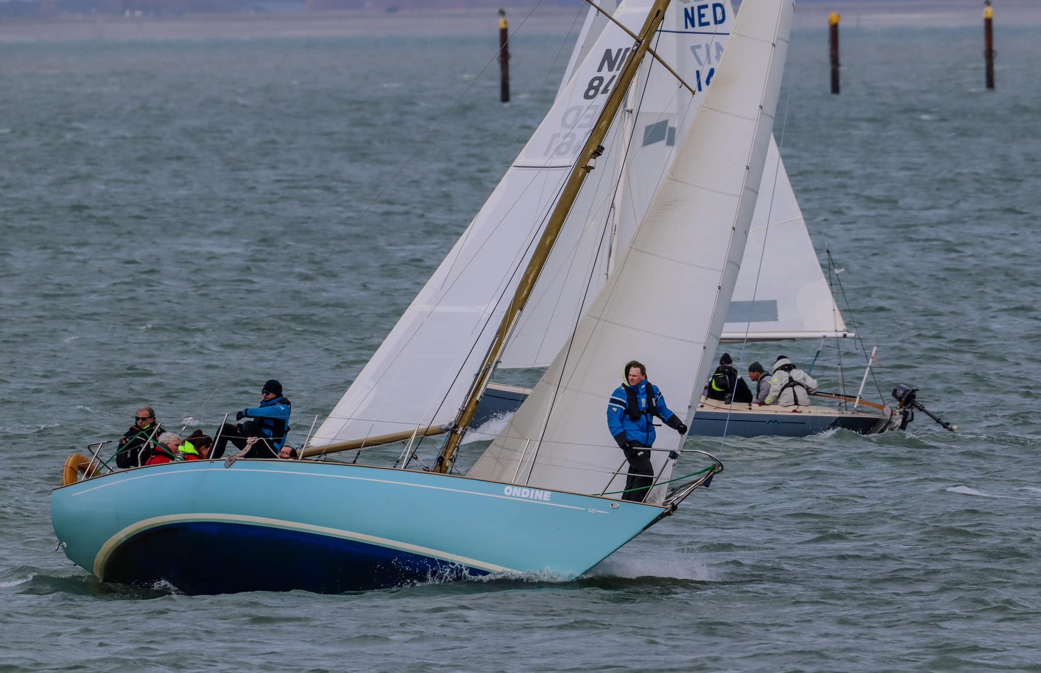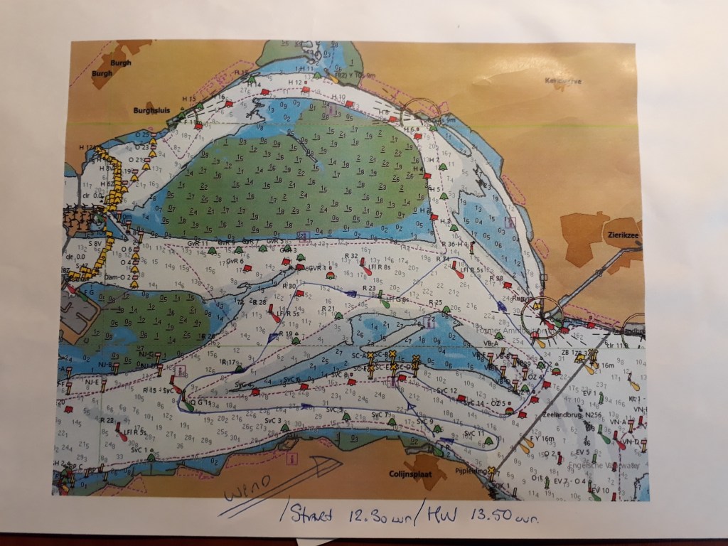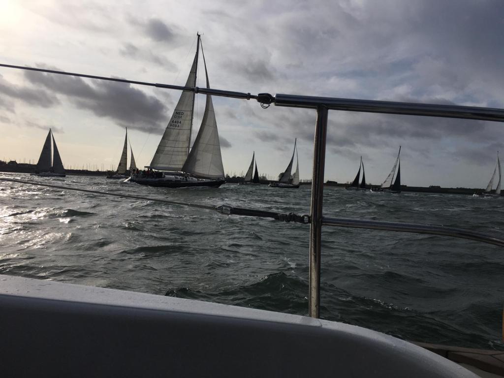 Start naar het oosten, tij mee. Het voordeel is dat de startlijn nu vrij is voor onze groep en we dus enkele malen vanaf ca 500m naar de startlijn kunnen varen om de tijd in te schatten die hiervoor nodig is. Wij zijn met in totaal 6 schepen aan de start, waaronder natuurlijk Boeboe en Shamrock onze concurrenten voor het algemeen klassement. De windkracht (NO) is nu minimaal 8kn, soms zelfs iets meer. Goed voor ons, dan kunnen we mee met de lichtere boten. Alle deelnemers kiezen positie zo dicht mogelijk bij de groene boei , om zoveel mogelijk van het opkomende tij te kunnen profiteren. Deze boei (SvC9) ligt door de stroming een 10tal meters achter de startlijn, die bepaald wordt door de 2 lichtpalen op de pier. Boeboe weet dat niet, is dus te vroeg gestart en wordt teruggeroepen. Voor ons is er geen ruimte en we starten dus iets later dan Shamrock en Vintage. Volgens de app waren we op het moment dat het startsein werd gegeven maar 10 meter achter de lijn, dus niet slecht. Direct nadat we de boei zijn gepasseerd maken we een slag over bakboord, naar het midden van het vaarwater, waar we nog meer tij mee verwachten.