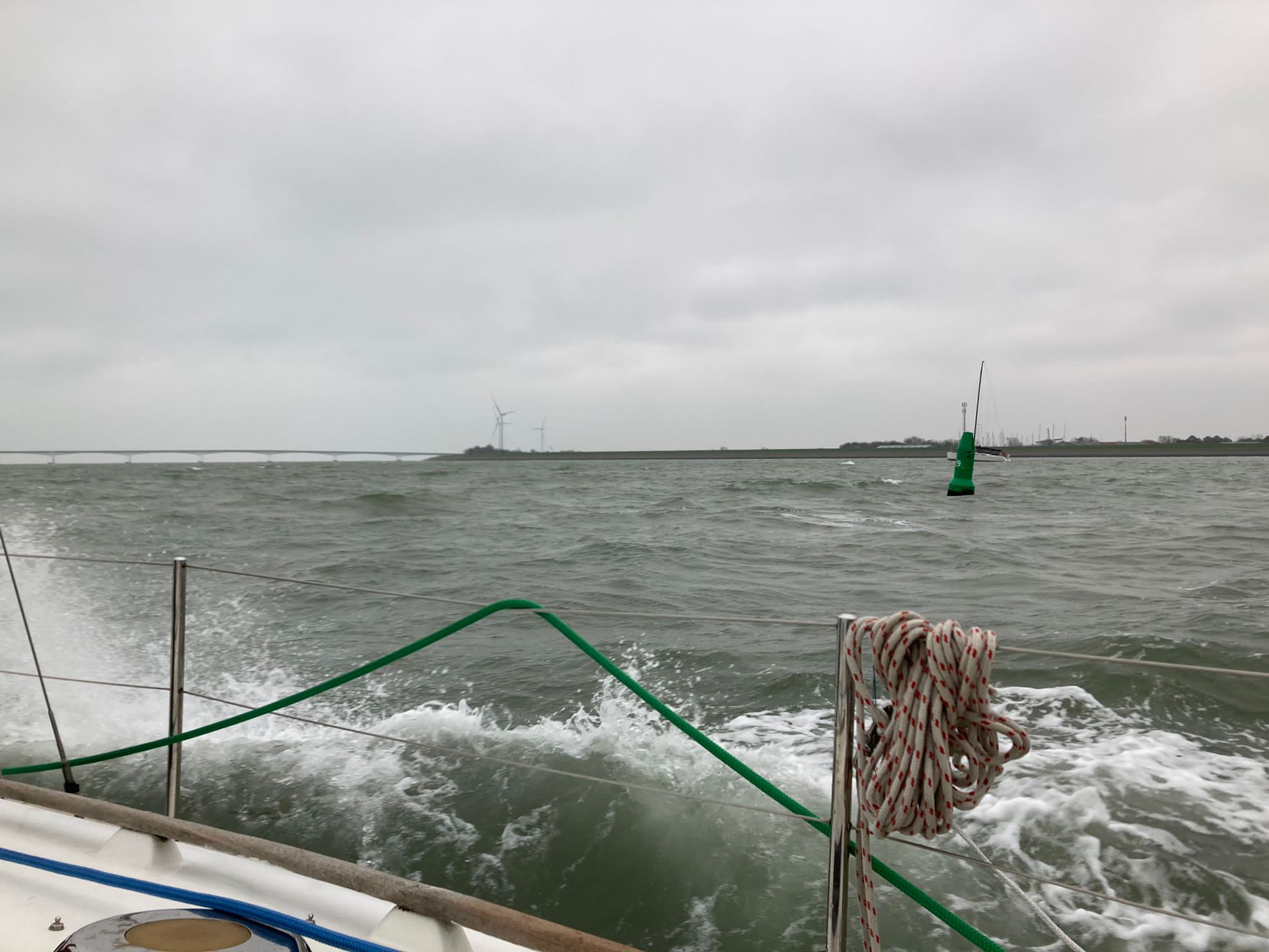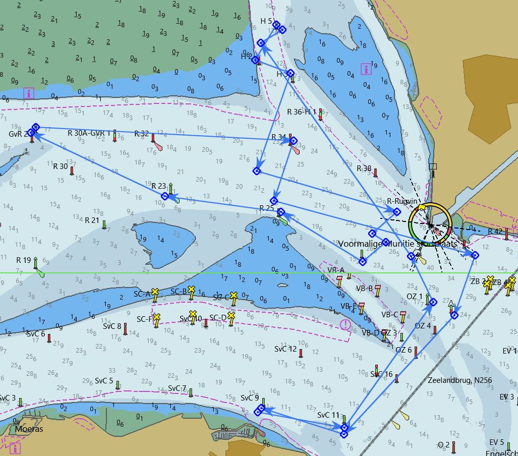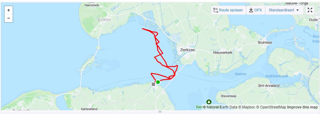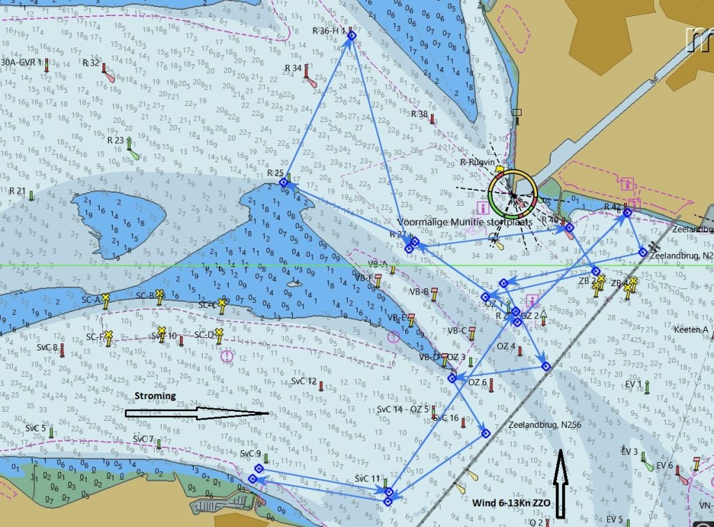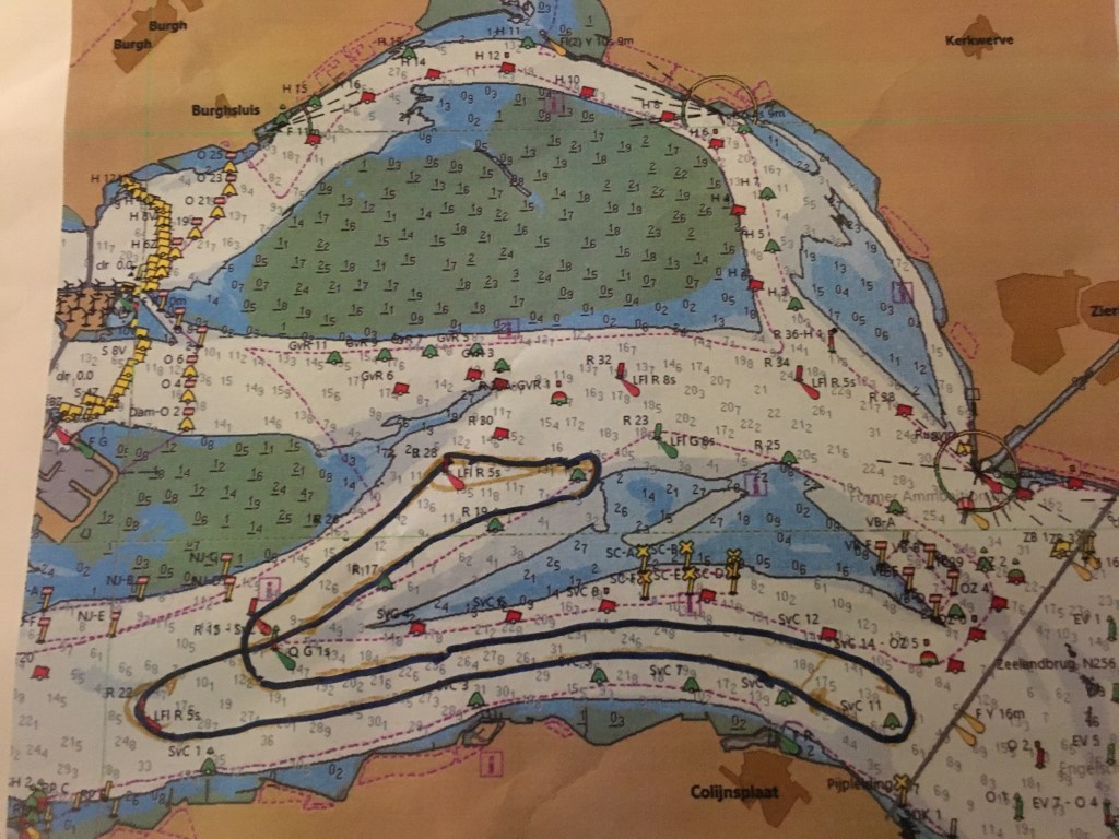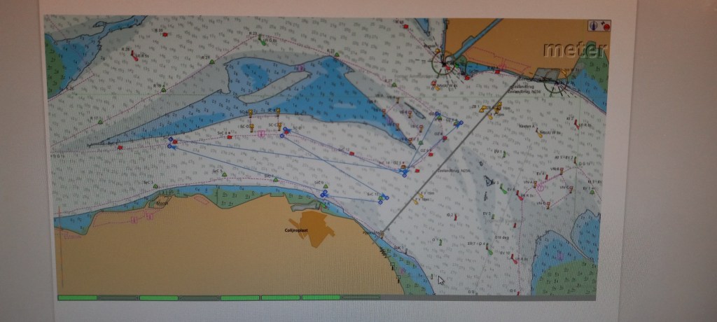 Probleem is dat mijn reguliere anker te groot is om op te bergen in de ankerbak en het dus vrij lang duurt voordat het aan de ketting zit. Dat gaan we voor de volgende keer oplossen door een kleiner anker te installeren. (Dat heb ik nog in de schuur liggen nu). Deze drijfpartij duurt zeker 15 á 20 minuten , zodat we weer bijna terug zijn bij de startlijn. (Ik heb ik inmiddels willen gisteren controleren via RaceQs, maar deze app stopt kennelijk uit zichzelf als een schip géén of nauwelijks voorgang maakt én start dan niet weer op, zoals Strava. ) Wind trekt weer iets aan, uit het zuiden nu, de lichte schepen lopen nu vrij rap van de zwaardere weg. Dat hebben wij (Ondine en Hygieia) niet meer goed kunnen maken. We hebben de gehele wedstrijd samen opgevaren zonder elkaar te hoeven hinderen. De baan was verder zeer interessant. Eerst naar SVK8 (onder Spi, eerst ruim uit het oosten dus en daarna reachend uit ZZW-ZW),) naar de groene boei (SVK5) aan de wind. Daarna aan de wind (wind nu iets zuidelijker) richting Zeelandbrug.