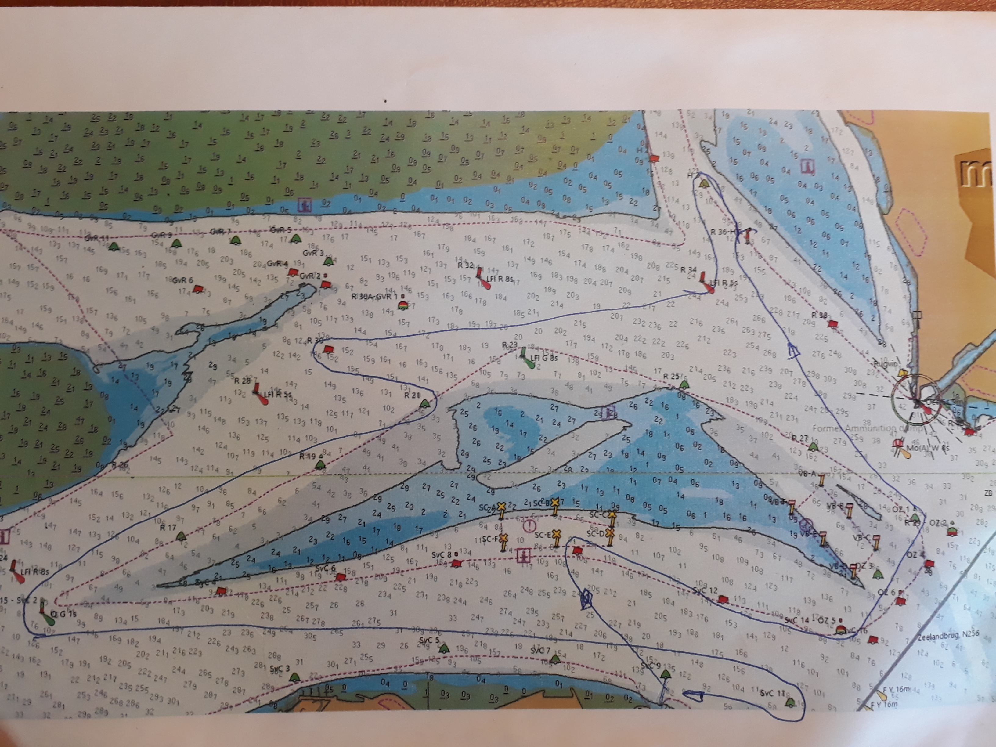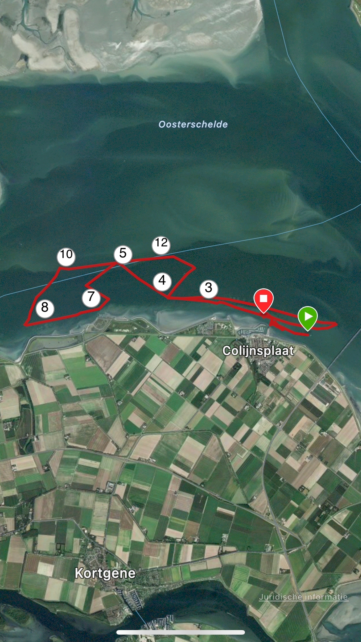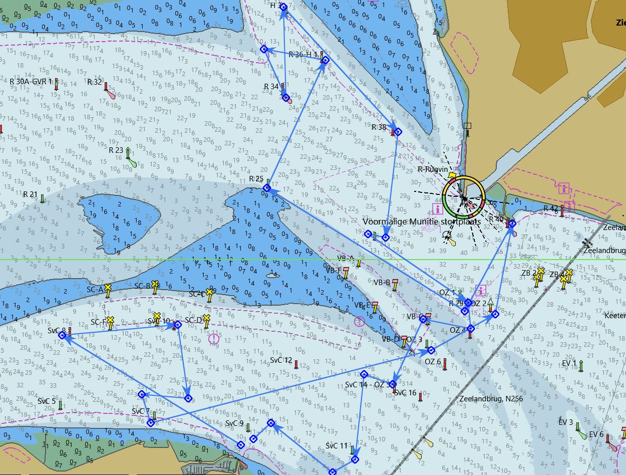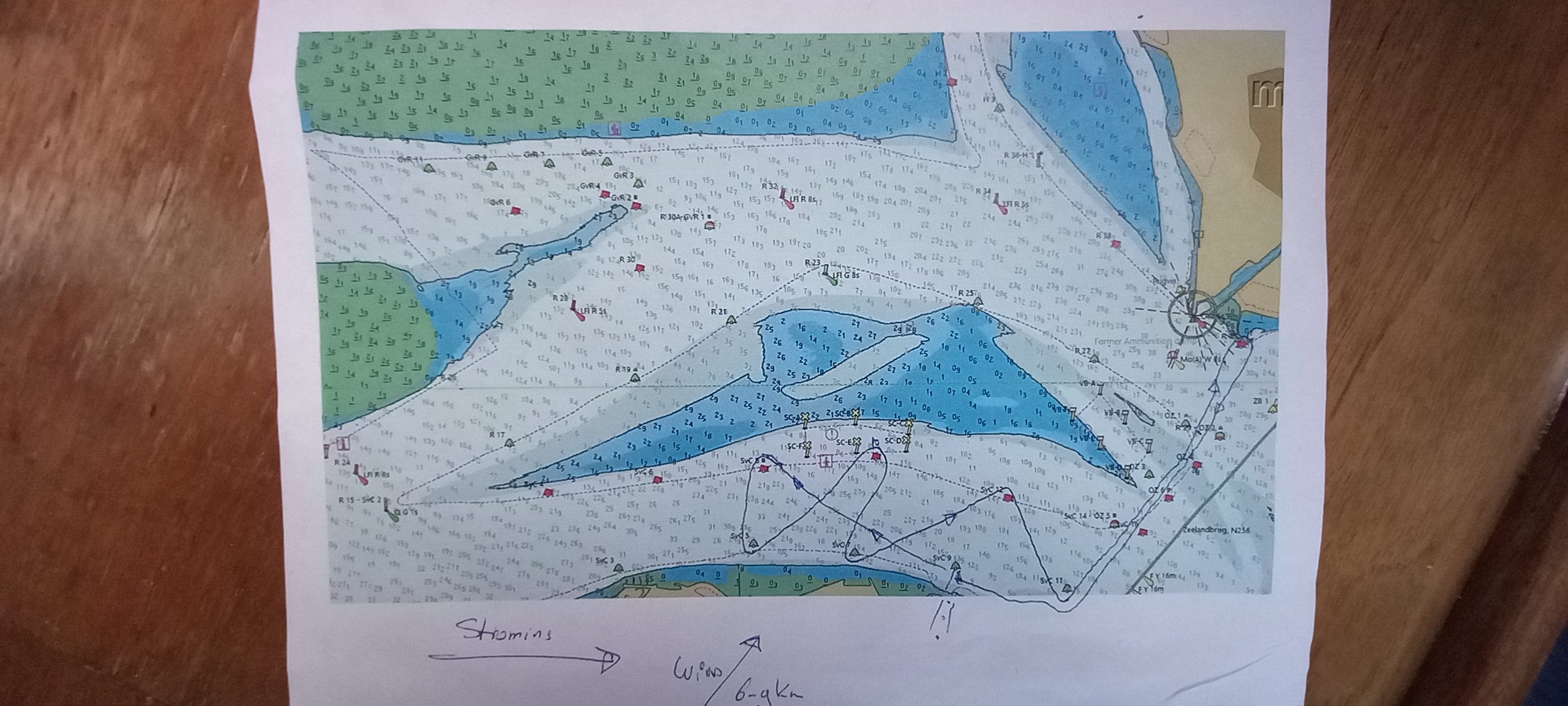 Probleem is dat mijn reguliere anker te groot is om op te bergen in de ankerbak en het dus vrij lang duurt voordat het aan de ketting zit. Dat gaan we voor de volgende keer oplossen door een kleiner anker te installeren. (Dat heb ik nog in de schuur liggen nu). Deze drijfpartij duurt zeker 15 á 20 minuten , zodat we weer bijna terug zijn bij de startlijn. (Ik heb ik inmiddels willen gisteren controleren via RaceQs, maar deze app stopt kennelijk uit zichzelf als een schip géén of nauwelijks voorgang maakt én start dan niet weer op, zoals Strava. ) Wind trekt weer iets aan, uit het zuiden nu, de lichte schepen lopen nu vrij rap van de zwaardere weg. Dat hebben wij (Ondine en Hygieia) niet meer goed kunnen maken. We hebben de gehele wedstrijd samen opgevaren zonder elkaar te hoeven hinderen. De baan was verder zeer interessant. Eerst naar SVK8 (onder Spi, eerst ruim uit het oosten dus en daarna reachend uit ZZW-ZW),) naar de groene boei (SVK5) aan de wind. Daarna aan de wind (wind nu iets zuidelijker) richting Zeelandbrug.