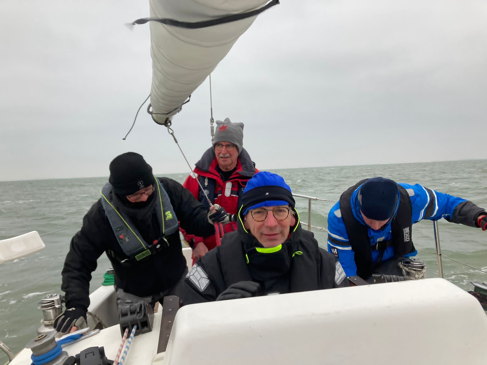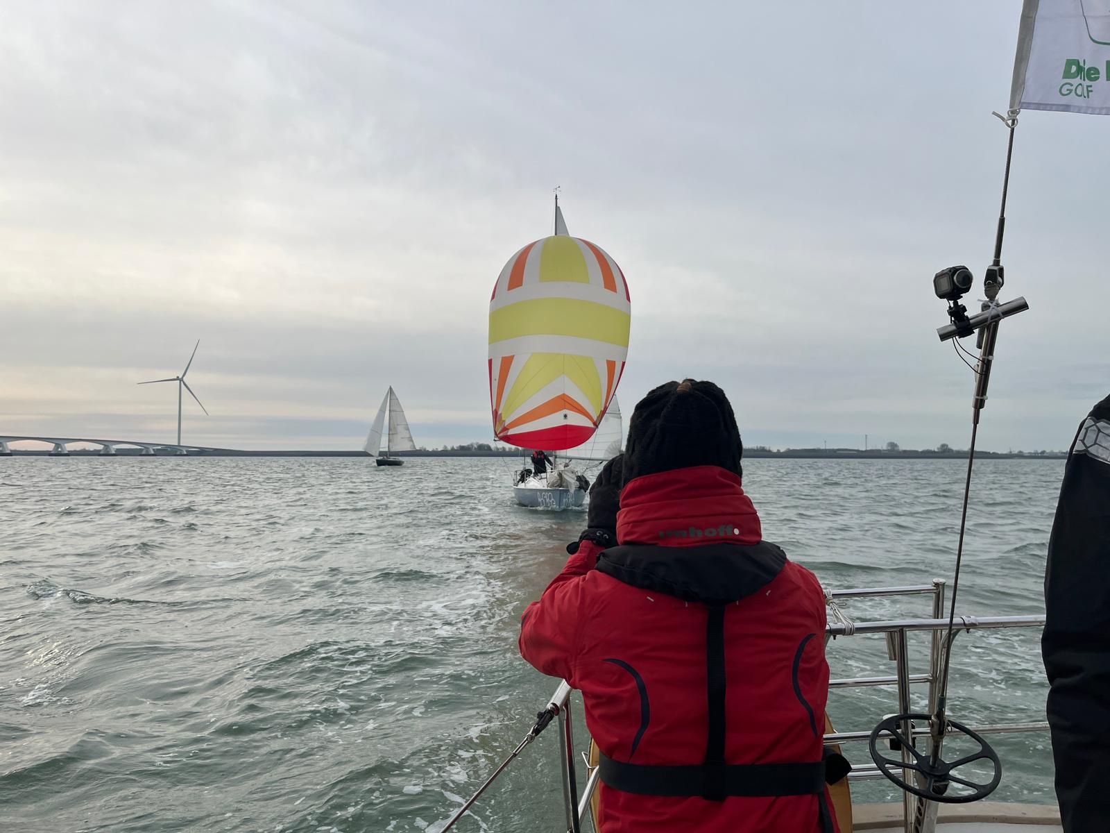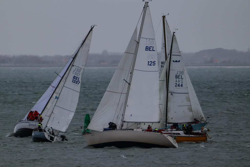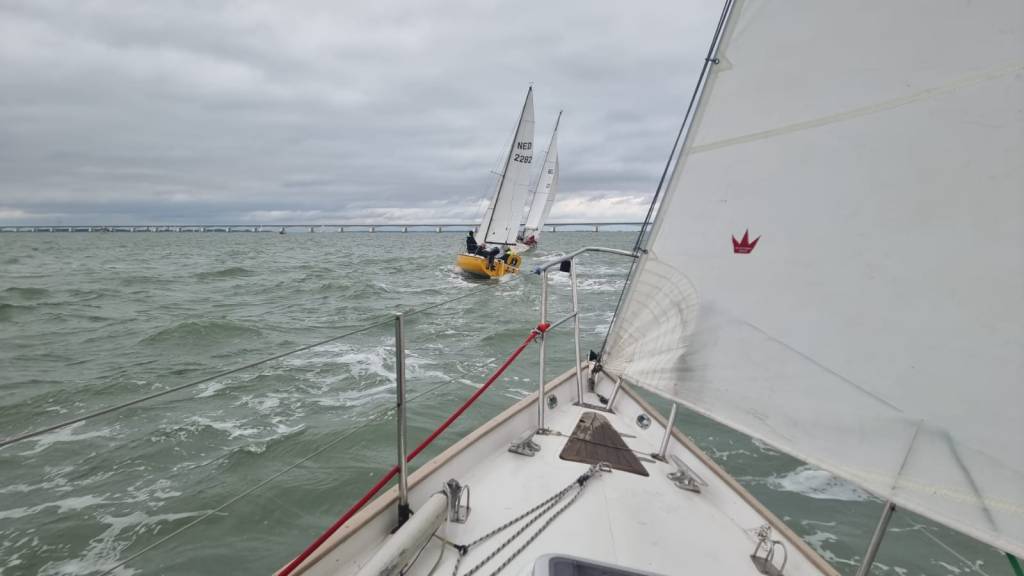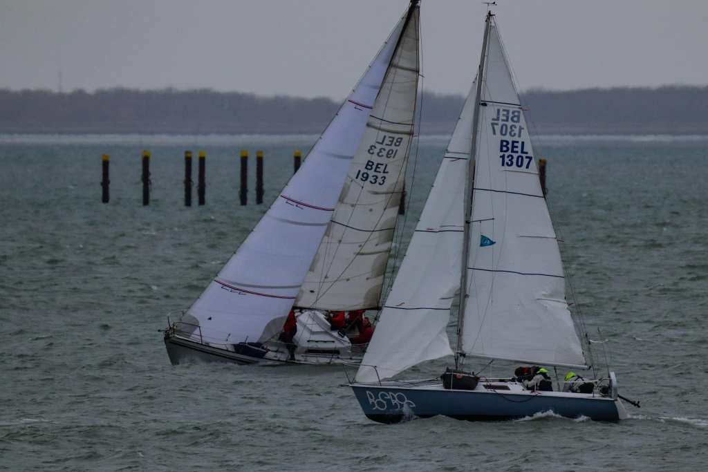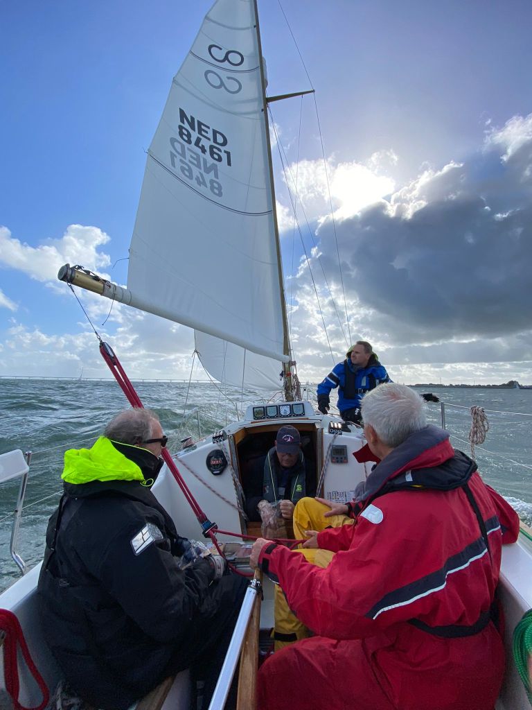 Wedstrijd 5 (6 februari) – Veel wind verwacht 5-6 bft met flinke uitschieters tot 35 knopen, geen neerslag en niet koud. Wij (Bijou) met deze keer een bemanning van slechts vier, hebben een goed start, we gaan als eerste over de startlijn, halve wind, tij tegen naar de eerste ton. Al snel worden we voorbijgelopen door “Safran” een rappe JOD24, we weten haar hekgolf te grijpen en minutenlang kleven we aan haar spiegel. Dan worden we ingehaald door “Jeetje” een nog rappere J-24 en proberen die truc ook bij haar uit te halen, maar dat mislukt. Bij de keerton zitten we er nog kort bij. Dan wederom halve wind over de andere boeg richting Zeelandbrug. Vervolgend bakboorduit, vóór de wind richting Zierikzee en de Hammen in. Niemand in onze klasse waagt het de spinaker te trekken. Echt te veel wind, geen twijfel mogelijk. Bij de grotere schepen zijn er wel enkelen die het doen. Inmiddels horen over de marifoon dat er enkele schepen roerbladen hebben verloren en vragen assistentie om teruggesleept te worden naar de thuishaven. Bij de verste ton (H3) zitten we niet ver achter de schepen die later als 3e en 4e eindigen. Dan aan de wind en tegen stroom terug richting Colijnsplaat, met een klein lusje vóór Zierikzee. In deze fase lopen de meeste tegenstanders ver van ons weg, met als uiteindelijke resultaat dat we als 7e worden geklasseerd. Mogelijk dat we met een grotere genua maar met gereefd grootzeil beter presteren op de aandewindse rakken ondere deze zware omstandigheden. Iets om uit te proberen. “Lecas” is vandaag buitencategorie. Ondanks een zwakke start presteren zij het om als eerste over de finishlijn te gaan en dus ook weer als eerste te worden geklasseerd. Proficiat! Weinig foto’s deze keer. Iedereen had beide handen nodig om staande/zittende te blijven onder deze omstandigheden.