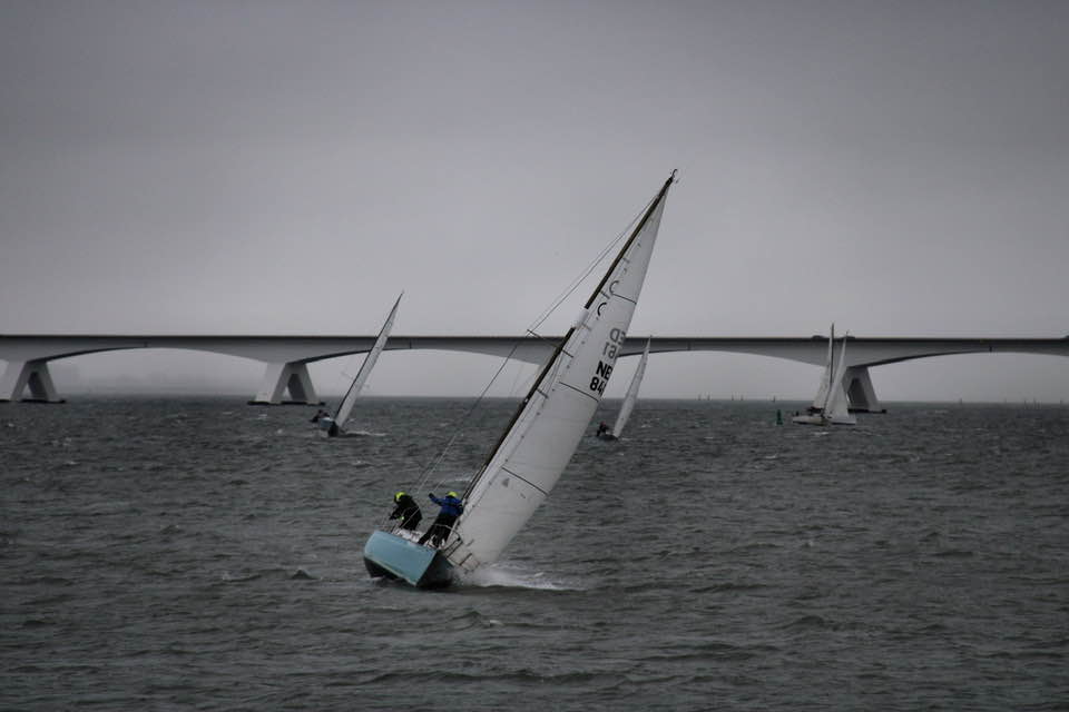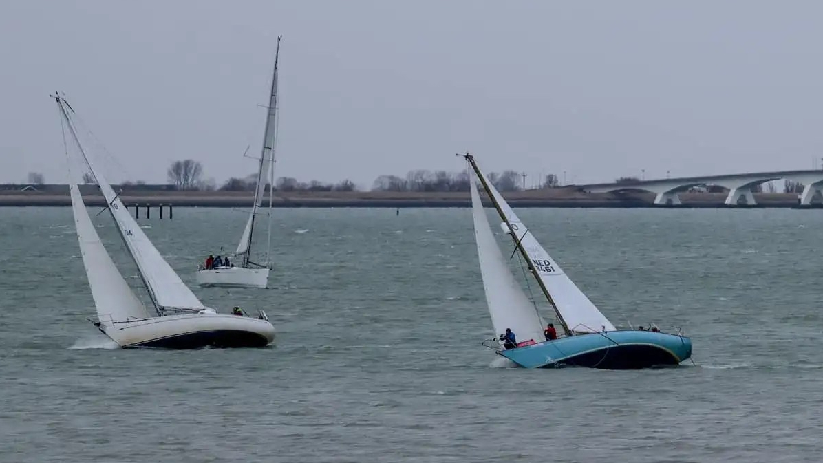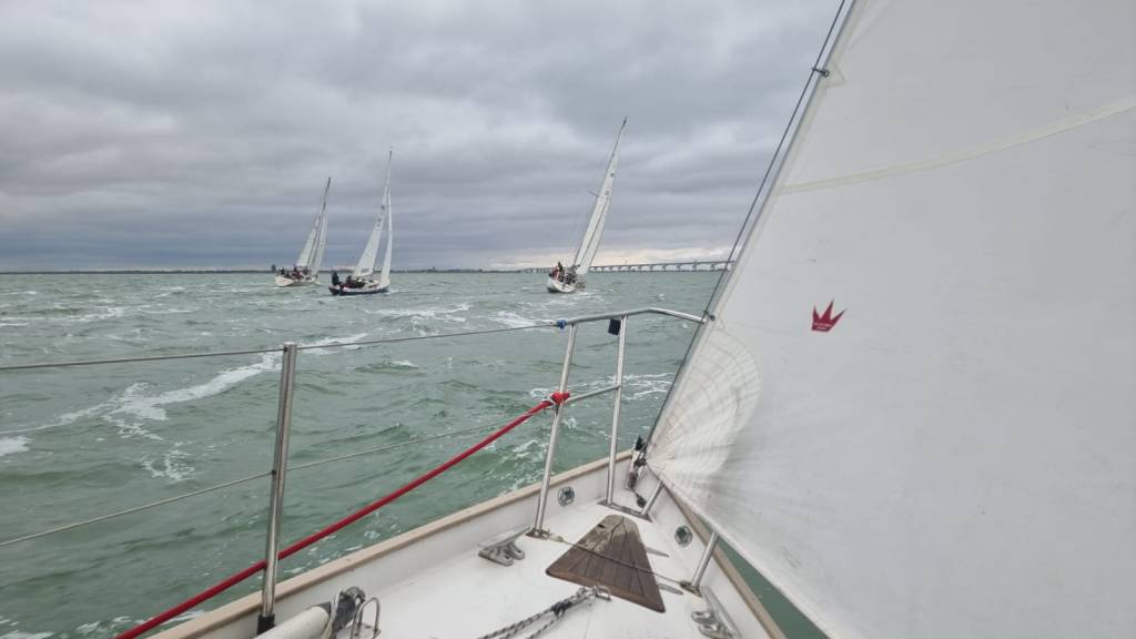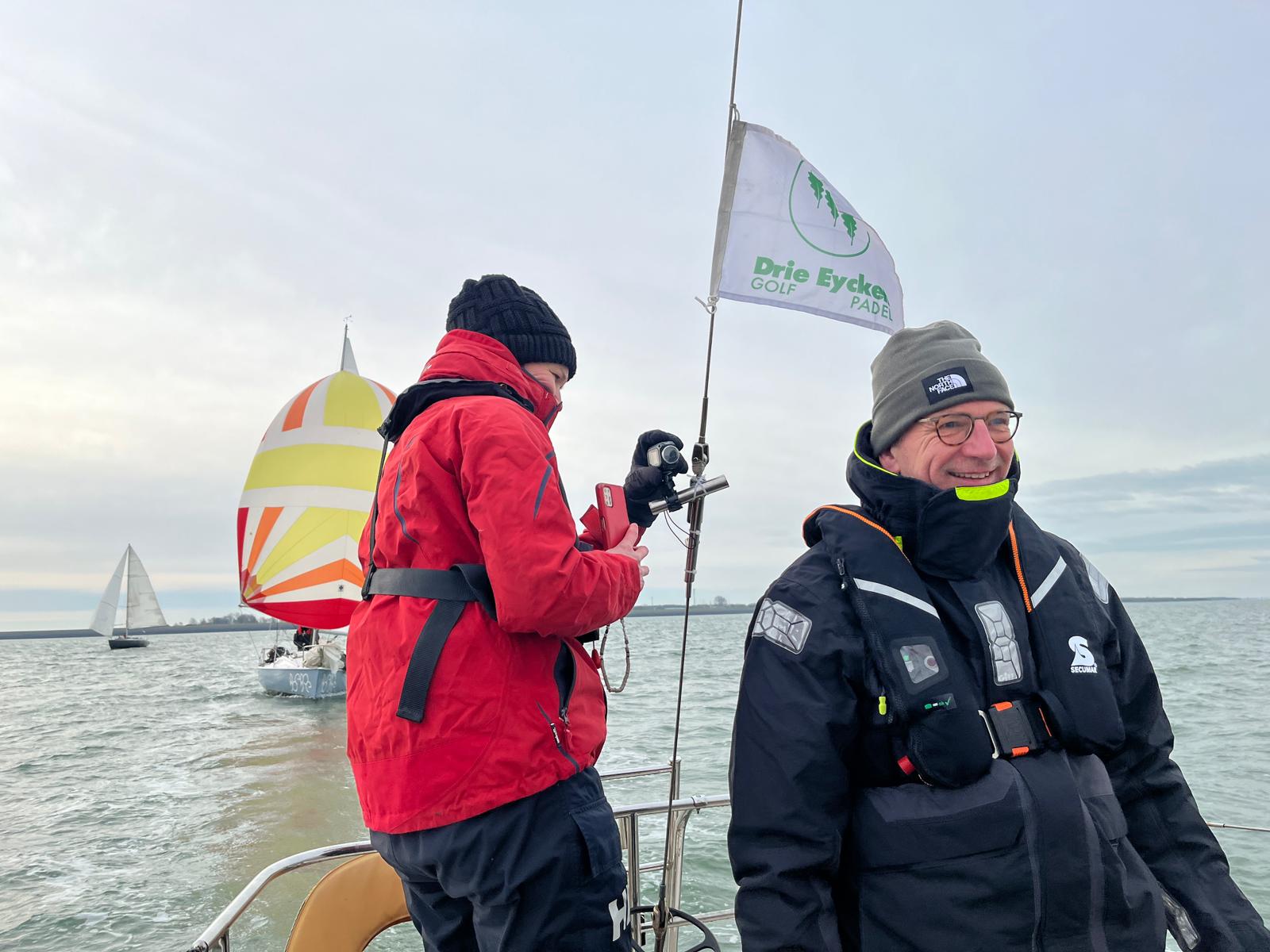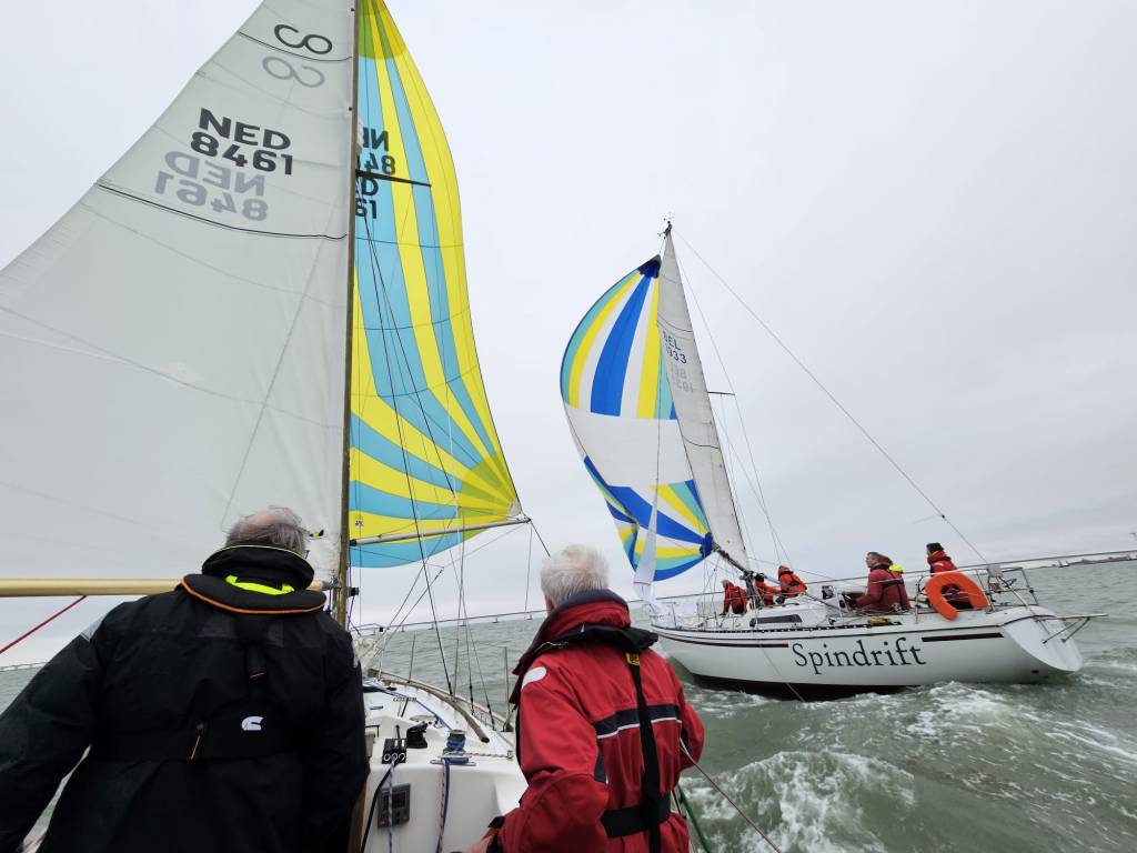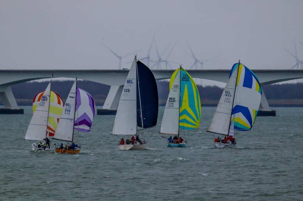 Wedstrijd 5 (6 februari) – Veel wind verwacht 5-6 bft met flinke uitschieters tot 35 knopen, geen neerslag en niet koud. Wij (Bijou) met deze keer een bemanning van slechts vier, hebben een goed start, we gaan als eerste over de startlijn, halve wind, tij tegen naar de eerste ton. Al snel worden we voorbijgelopen door “Safran” een rappe JOD24, we weten haar hekgolf te grijpen en minutenlang kleven we aan haar spiegel. Dan worden we ingehaald door “Jeetje” een nog rappere J-24 en proberen die truc ook bij haar uit te halen, maar dat mislukt. Bij de keerton zitten we er nog kort bij. Dan wederom halve wind over de andere boeg richting Zeelandbrug. Vervolgend bakboorduit, vóór de wind richting Zierikzee en de Hammen in. Niemand in onze klasse waagt het de spinaker te trekken. Echt te veel wind, geen twijfel mogelijk. Bij de grotere schepen zijn er wel enkelen die het doen. Inmiddels horen over de marifoon dat er enkele schepen roerbladen hebben verloren en vragen assistentie om teruggesleept te worden naar de thuishaven. Bij de verste ton (H3) zitten we niet ver achter de schepen die later als 3e en 4e eindigen. Dan aan de wind en tegen stroom terug richting Colijnsplaat, met een klein lusje vóór Zierikzee. In deze fase lopen de meeste tegenstanders ver van ons weg, met als uiteindelijke resultaat dat we als 7e worden geklasseerd. Mogelijk dat we met een grotere genua maar met gereefd grootzeil beter presteren op de aandewindse rakken ondere deze zware omstandigheden. Iets om uit te proberen. “Lecas” is vandaag buitencategorie. Ondanks een zwakke start presteren zij het om als eerste over de finishlijn te gaan en dus ook weer als eerste te worden geklasseerd. Proficiat! Weinig foto’s deze keer. Iedereen had beide handen nodig om staande/zittende te blijven onder deze omstandigheden.