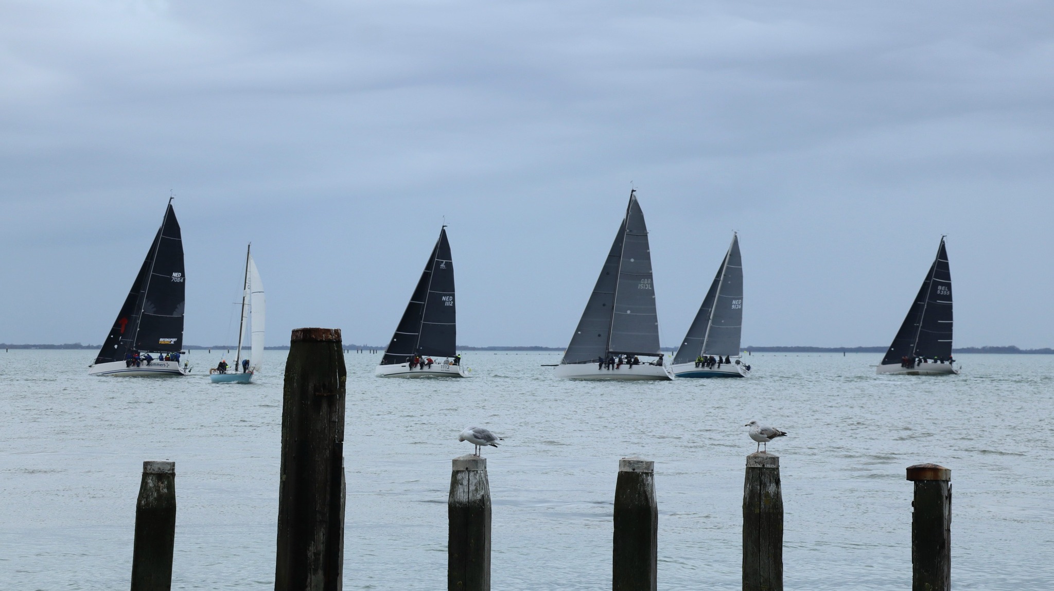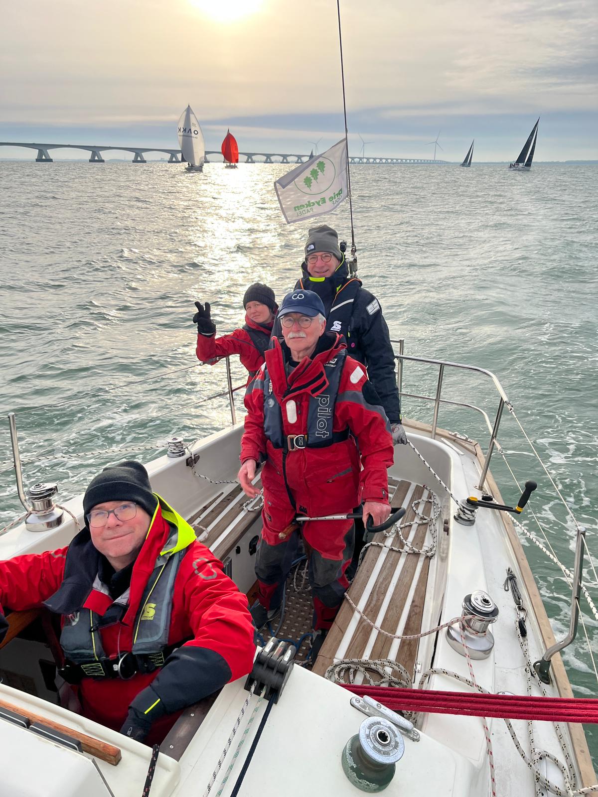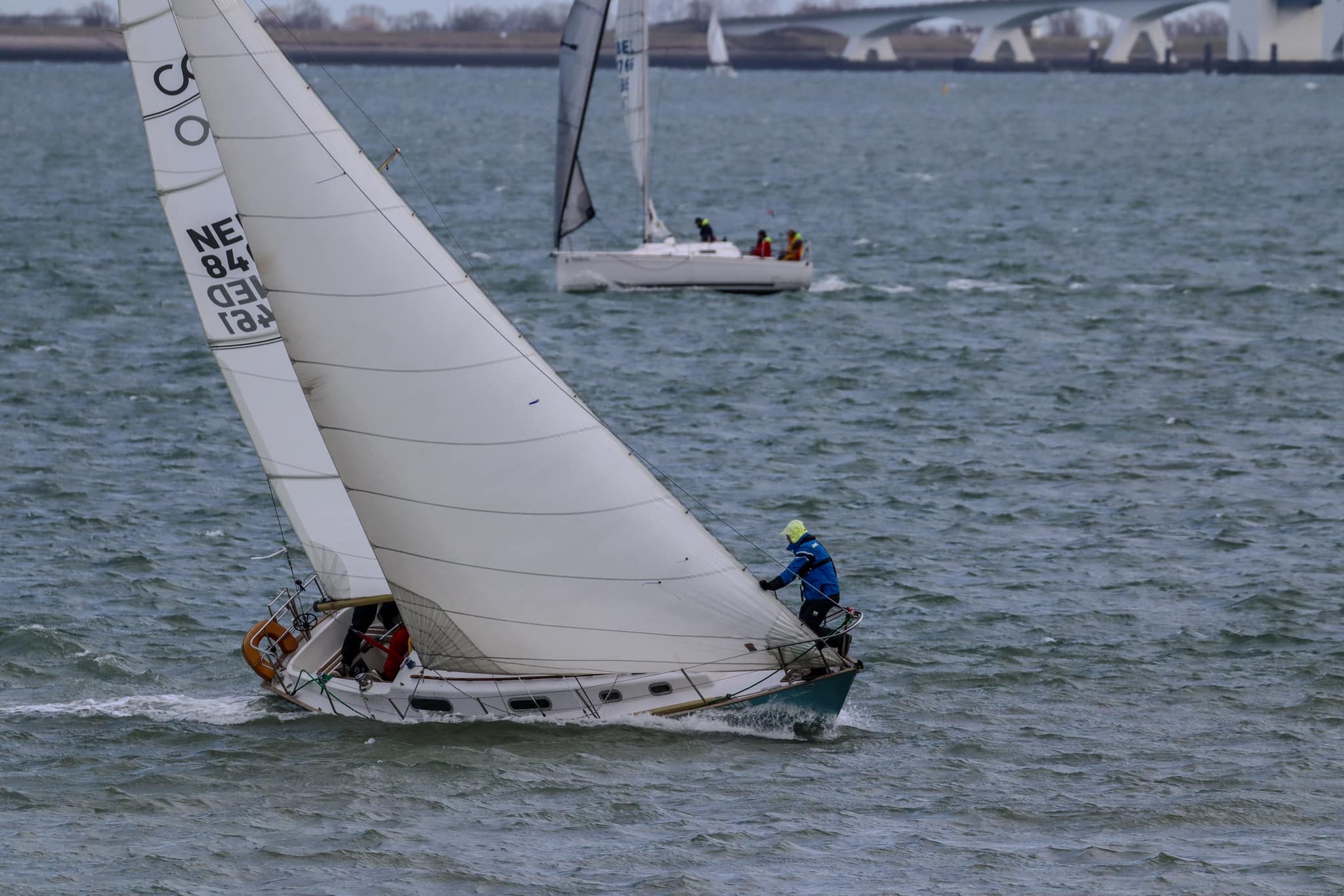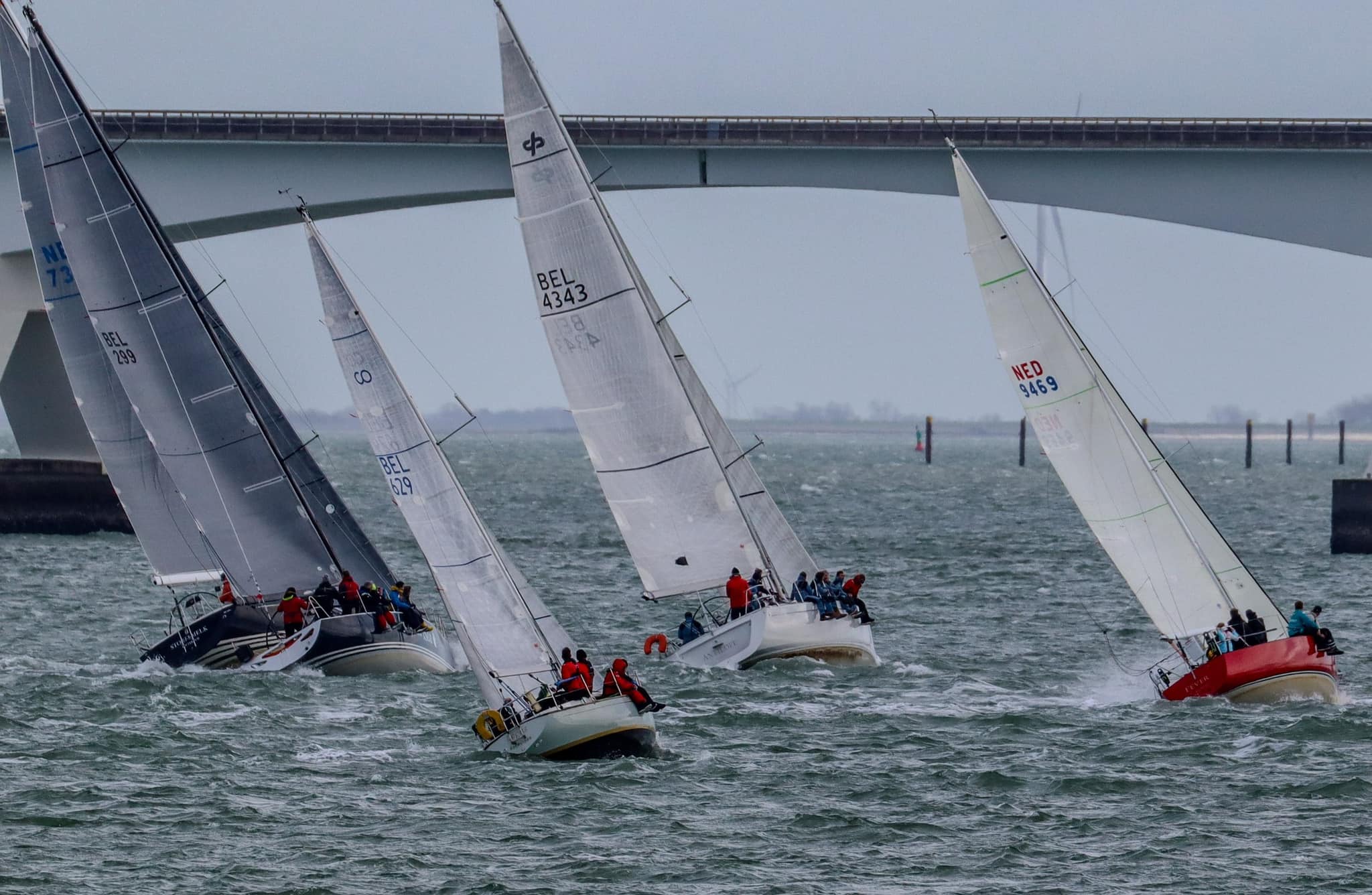 Wedstrijd 5 (6 februari) – Veel wind verwacht 5-6 bft met flinke uitschieters tot 35 knopen, geen neerslag en niet koud. Wij (Bijou) met deze keer een bemanning van slechts vier, hebben een goed start, we gaan als eerste over de startlijn, halve wind, tij tegen naar de eerste ton. Al snel worden we voorbijgelopen door “Safran” een rappe JOD24, we weten haar hekgolf te grijpen en minutenlang kleven we aan haar spiegel. Dan worden we ingehaald door “Jeetje” een nog rappere J-24 en proberen die truc ook bij haar uit te halen, maar dat mislukt. Bij de keerton zitten we er nog kort bij. Dan wederom halve wind over de andere boeg richting Zeelandbrug. Vervolgend bakboorduit, vóór de wind richting Zierikzee en de Hammen in. Niemand in onze klasse waagt het de spinaker te trekken. Echt te veel wind, geen twijfel mogelijk. Bij de grotere schepen zijn er wel enkelen die het doen. Inmiddels horen over de marifoon dat er enkele schepen roerbladen hebben verloren en vragen assistentie om teruggesleept te worden naar de thuishaven. Bij de verste ton (H3) zitten we niet ver achter de schepen die later als 3e en 4e eindigen. Dan aan de wind en tegen stroom terug richting Colijnsplaat, met een klein lusje vóór Zierikzee. In deze fase lopen de meeste tegenstanders ver van ons weg, met als uiteindelijke resultaat dat we als 7e worden geklasseerd. Mogelijk dat we met een grotere genua maar met gereefd grootzeil beter presteren op de aandewindse rakken ondere deze zware omstandigheden. Iets om uit te proberen. “Lecas” is vandaag buitencategorie. Ondanks een zwakke start presteren zij het om als eerste over de finishlijn te gaan en dus ook weer als eerste te worden geklasseerd. Proficiat! Weinig foto’s deze keer. Iedereen had beide handen nodig om staande/zittende te blijven onder deze omstandigheden.