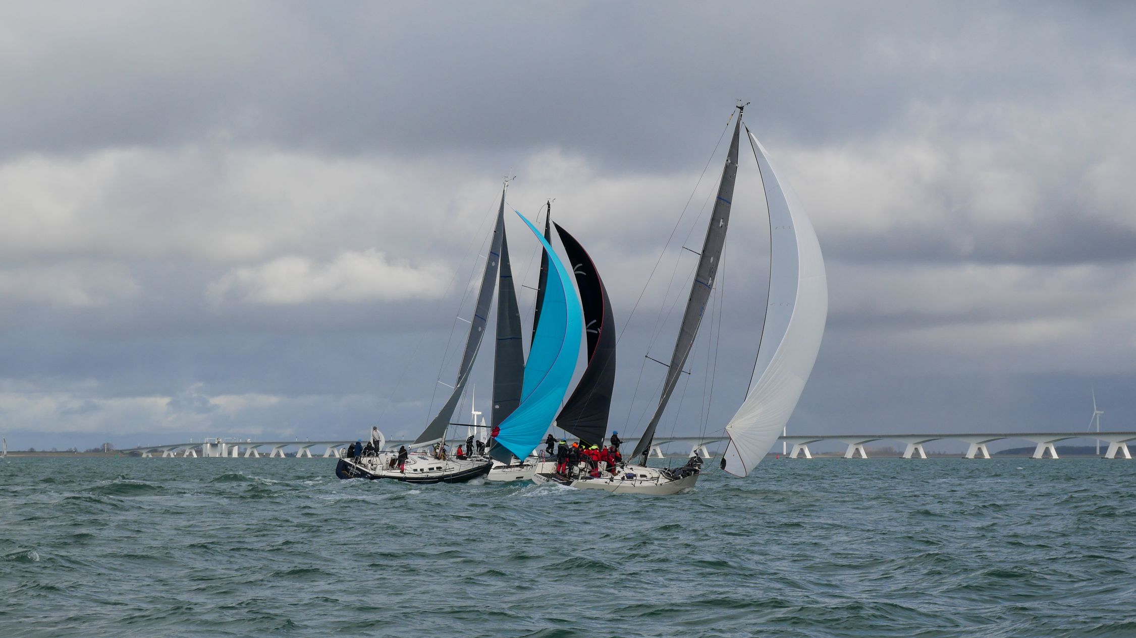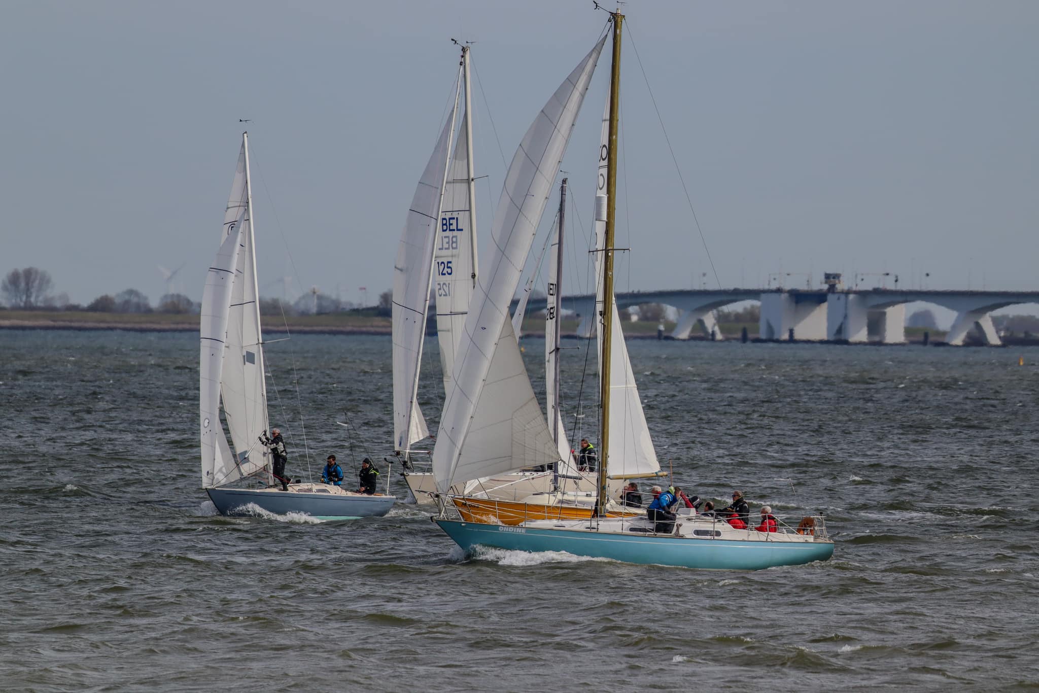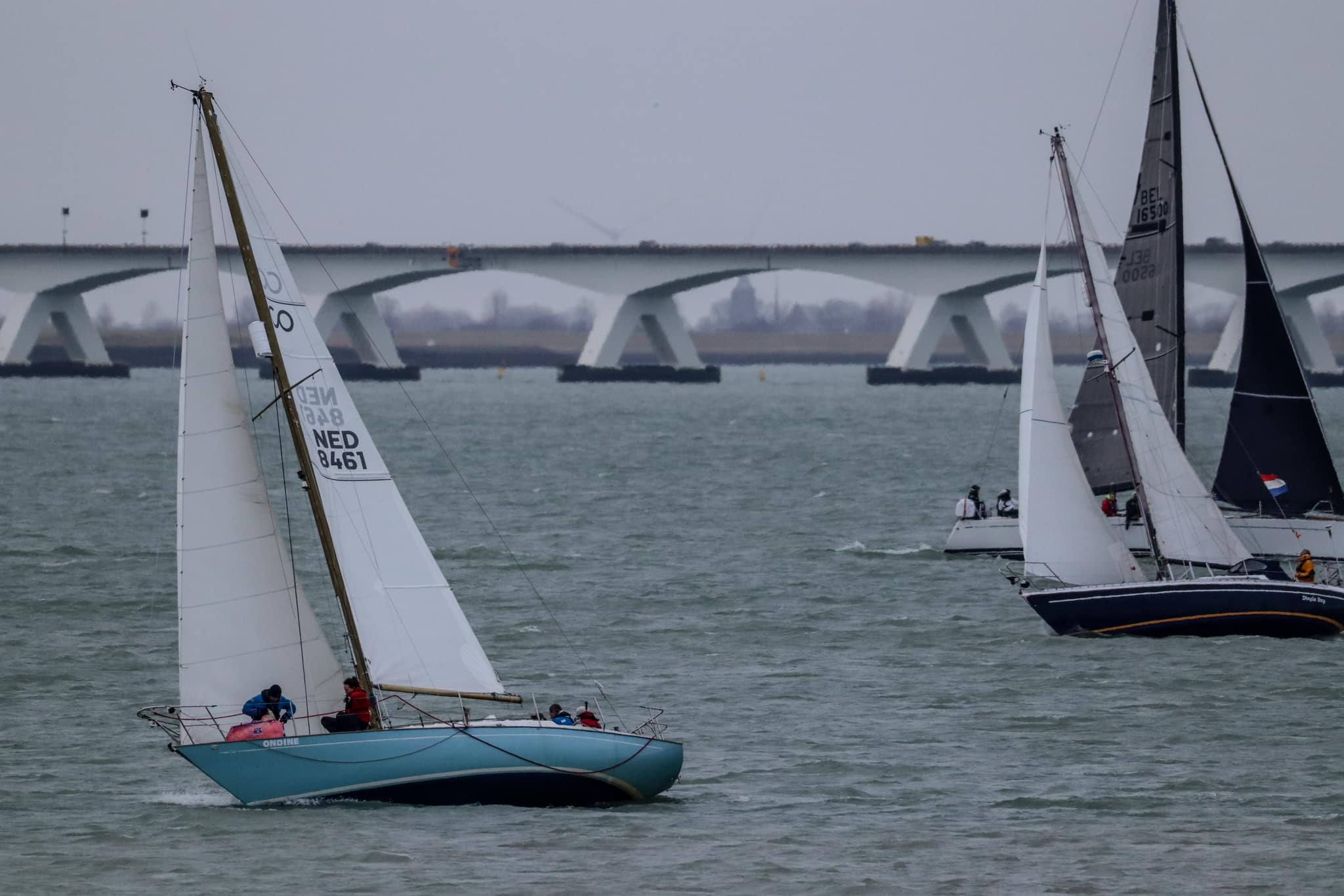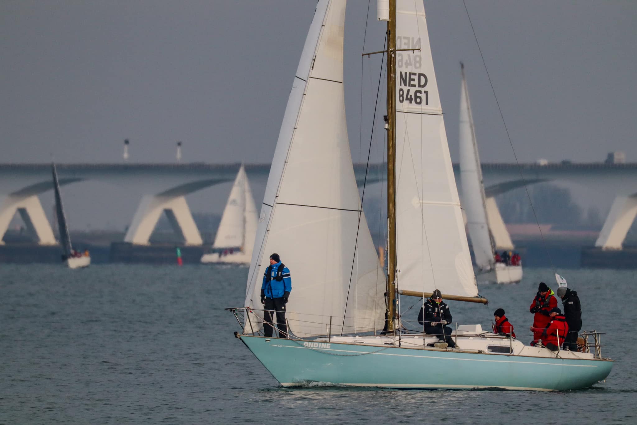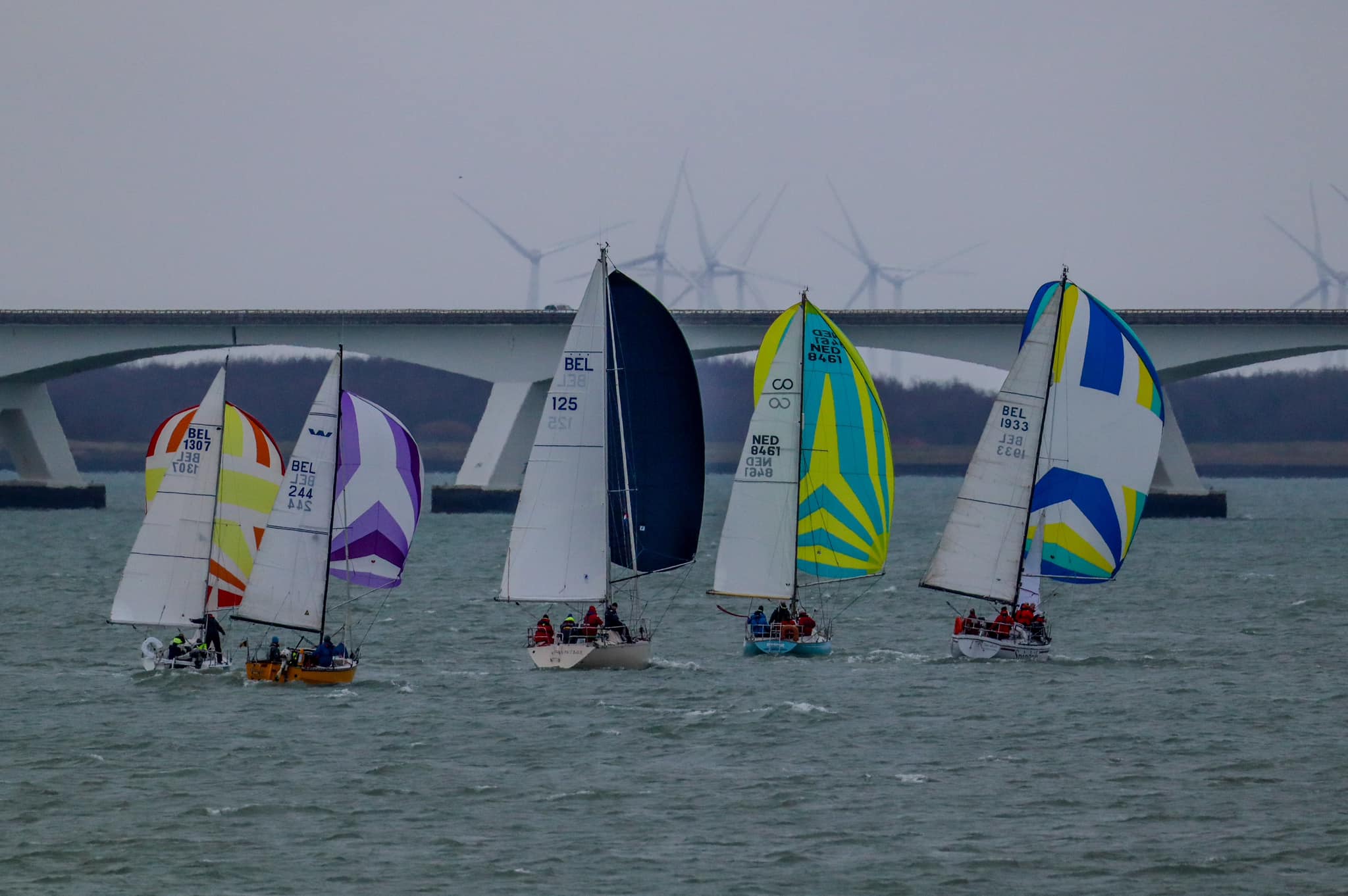 Wedstrijd 5 (6 februari) – Veel wind verwacht 5-6 bft met flinke uitschieters tot 35 knopen, geen neerslag en niet koud. Wij (Bijou) met deze keer een bemanning van slechts vier, hebben een goed start, we gaan als eerste over de startlijn, halve wind, tij tegen naar de eerste ton. Al snel worden we voorbijgelopen door “Safran” een rappe JOD24, we weten haar hekgolf te grijpen en minutenlang kleven we aan haar spiegel. Dan worden we ingehaald door “Jeetje” een nog rappere J-24 en proberen die truc ook bij haar uit te halen, maar dat mislukt. Bij de keerton zitten we er nog kort bij. Dan wederom halve wind over de andere boeg richting Zeelandbrug. Vervolgend bakboorduit, vóór de wind richting Zierikzee en de Hammen in. Niemand in onze klasse waagt het de spinaker te trekken. Echt te veel wind, geen twijfel mogelijk. Bij de grotere schepen zijn er wel enkelen die het doen. Inmiddels horen over de marifoon dat er enkele schepen roerbladen hebben verloren en vragen assistentie om teruggesleept te worden naar de thuishaven. Bij de verste ton (H3) zitten we niet ver achter de schepen die later als 3e en 4e eindigen. Dan aan de wind en tegen stroom terug richting Colijnsplaat, met een klein lusje vóór Zierikzee. In deze fase lopen de meeste tegenstanders ver van ons weg, met als uiteindelijke resultaat dat we als 7e worden geklasseerd. Mogelijk dat we met een grotere genua maar met gereefd grootzeil beter presteren op de aandewindse rakken ondere deze zware omstandigheden. Iets om uit te proberen. “Lecas” is vandaag buitencategorie. Ondanks een zwakke start presteren zij het om als eerste over de finishlijn te gaan en dus ook weer als eerste te worden geklasseerd. Proficiat! Weinig foto’s deze keer. Iedereen had beide handen nodig om staande/zittende te blijven onder deze omstandigheden.