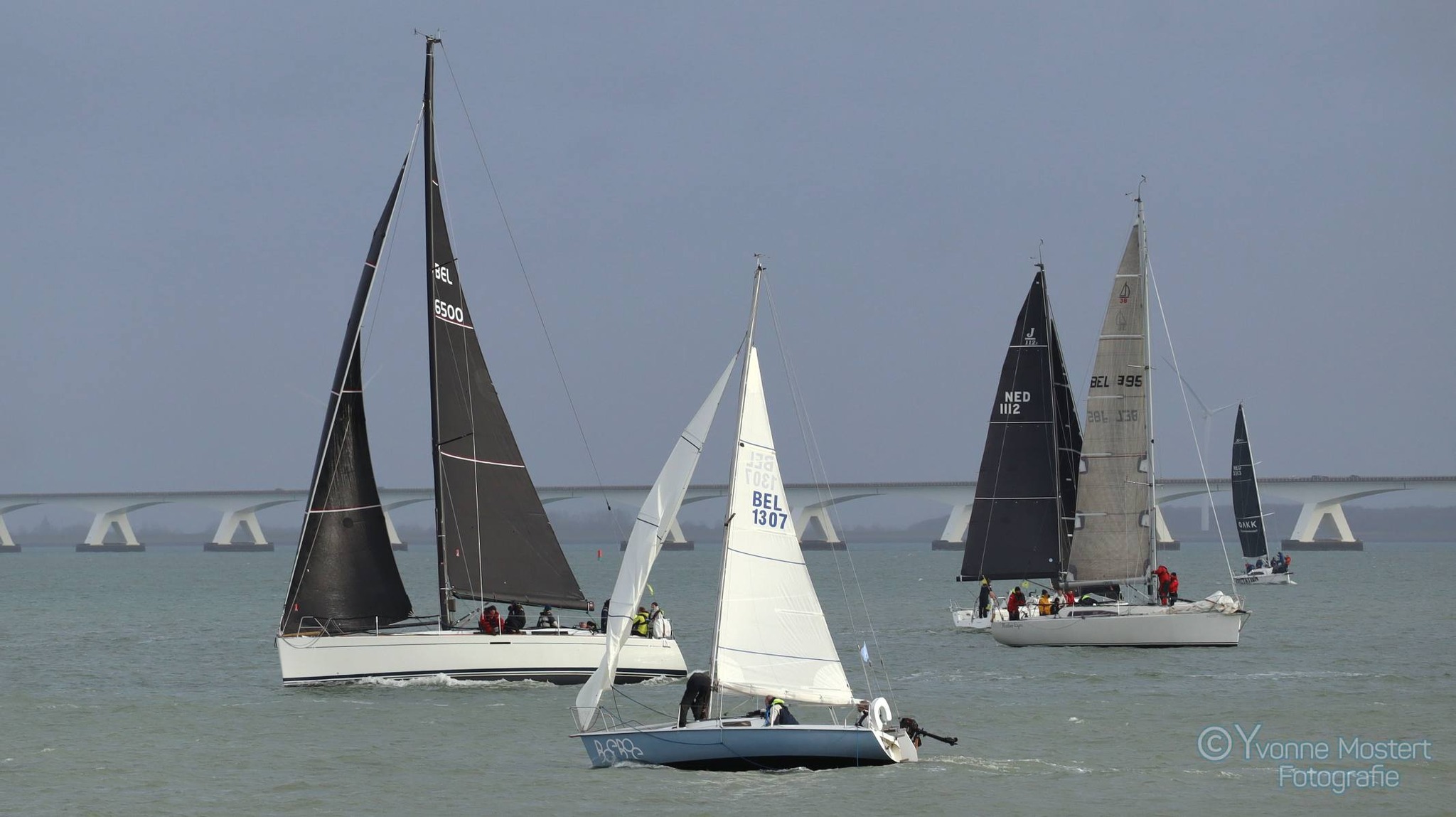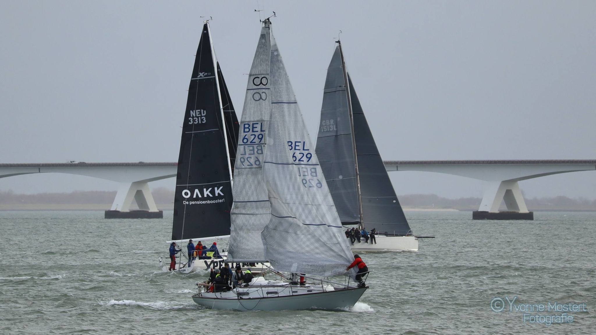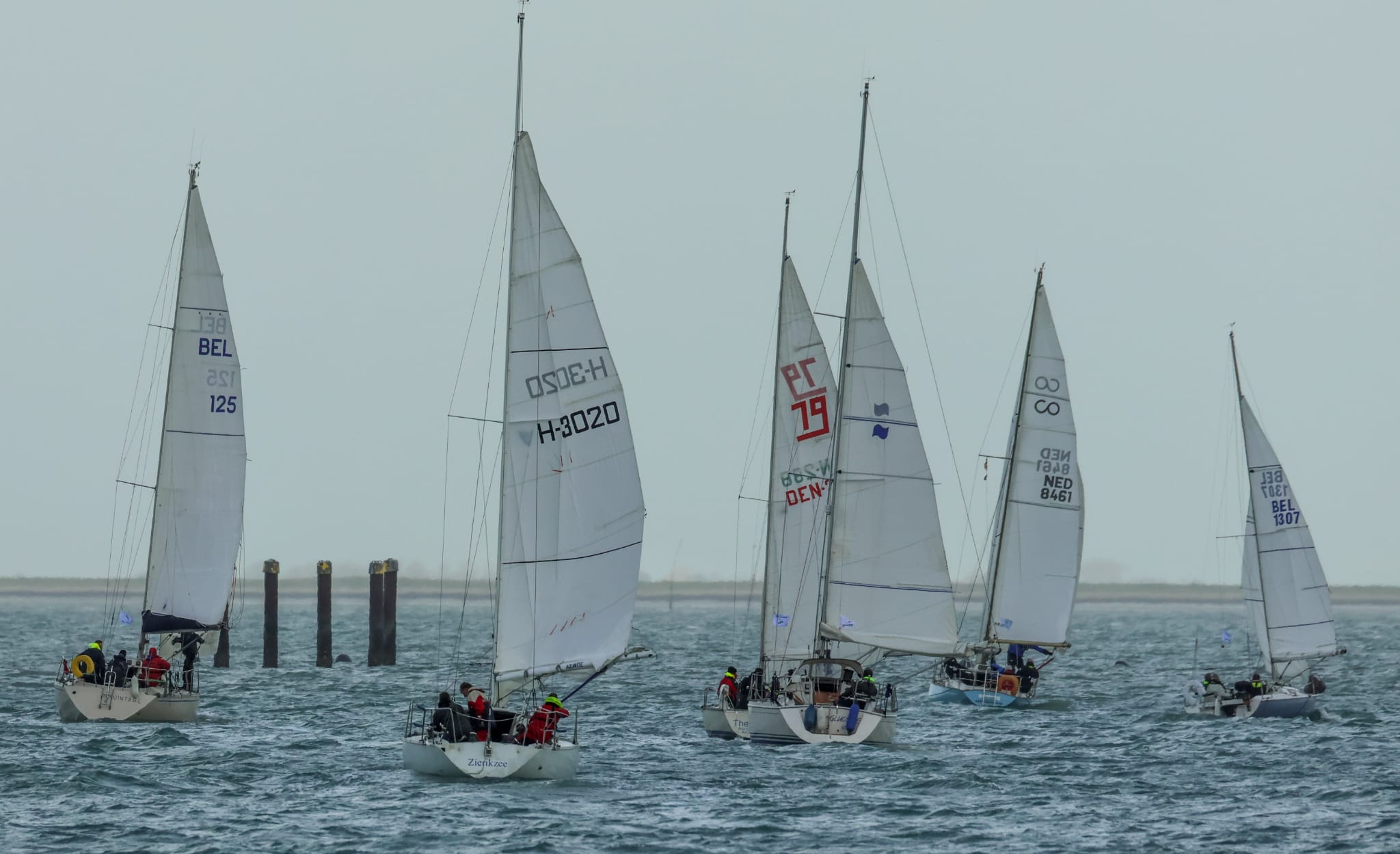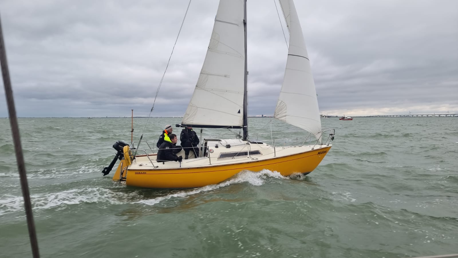 Wedstrijd 5 (6 februari) – Veel wind verwacht 5-6 bft met flinke uitschieters tot 35 knopen, geen neerslag en niet koud. Wij (Bijou) met deze keer een bemanning van slechts vier, hebben een goed start, we gaan als eerste over de startlijn, halve wind, tij tegen naar de eerste ton. Al snel worden we voorbijgelopen door “Safran” een rappe JOD24, we weten haar hekgolf te grijpen en minutenlang kleven we aan haar spiegel. Dan worden we ingehaald door “Jeetje” een nog rappere J-24 en proberen die truc ook bij haar uit te halen, maar dat mislukt. Bij de keerton zitten we er nog kort bij. Dan wederom halve wind over de andere boeg richting Zeelandbrug. Vervolgend bakboorduit, vóór de wind richting Zierikzee en de Hammen in. Niemand in onze klasse waagt het de spinaker te trekken. Echt te veel wind, geen twijfel mogelijk. Bij de grotere schepen zijn er wel enkelen die het doen. Inmiddels horen over de marifoon dat er enkele schepen roerbladen hebben verloren en vragen assistentie om teruggesleept te worden naar de thuishaven. Bij de verste ton (H3) zitten we niet ver achter de schepen die later als 3e en 4e eindigen. Dan aan de wind en tegen stroom terug richting Colijnsplaat, met een klein lusje vóór Zierikzee. In deze fase lopen de meeste tegenstanders ver van ons weg, met als uiteindelijke resultaat dat we als 7e worden geklasseerd. Mogelijk dat we met een grotere genua maar met gereefd grootzeil beter presteren op de aandewindse rakken ondere deze zware omstandigheden. Iets om uit te proberen. “Lecas” is vandaag buitencategorie. Ondanks een zwakke start presteren zij het om als eerste over de finishlijn te gaan en dus ook weer als eerste te worden geklasseerd. Proficiat! Weinig foto’s deze keer. Iedereen had beide handen nodig om staande/zittende te blijven onder deze omstandigheden.