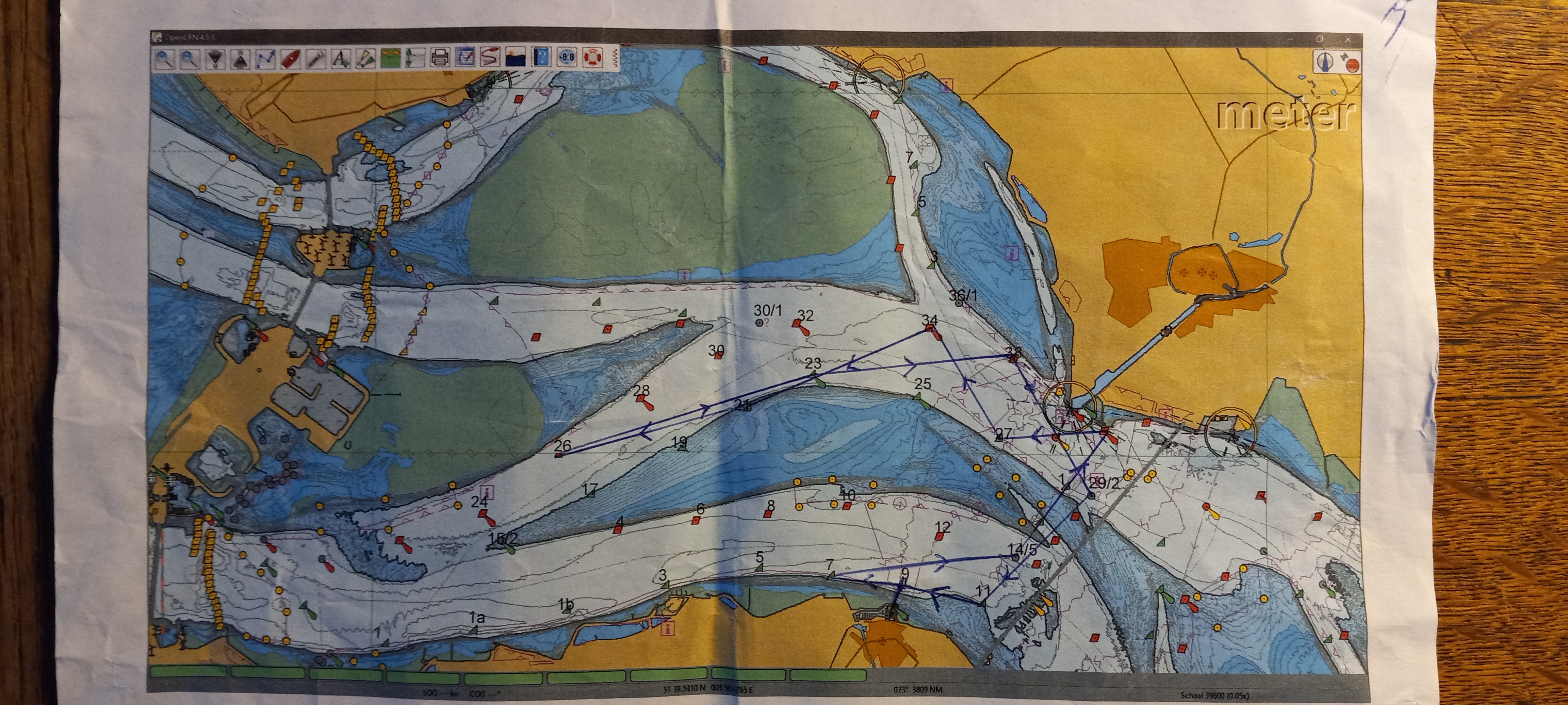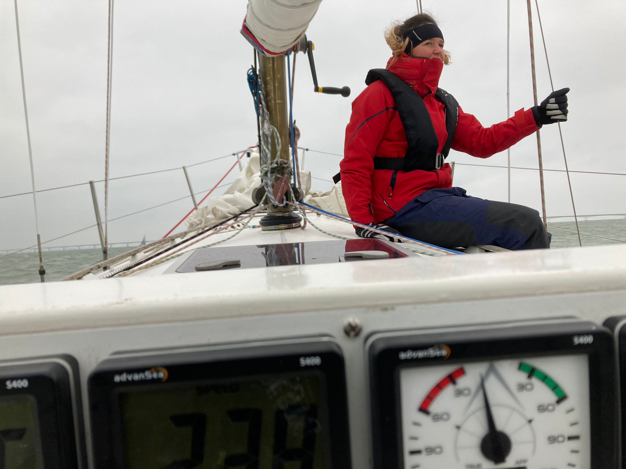 Daar door de wind richting SVK11, vervolgens onder spi naar SVK9, gijpen en reachend naar SVK12, spi drop en weer aan de wind naar de brug. Wederom door de wind en naar SVK11, spi op en naar de finish, tij tegen, dus dicht onder de dijk, ook omdat we worden ingelopen door veel schepen in Ongemeten A, Die moeten we onder ons houden. Zeer leerzaam! Windsterkte 8-10 knopen.