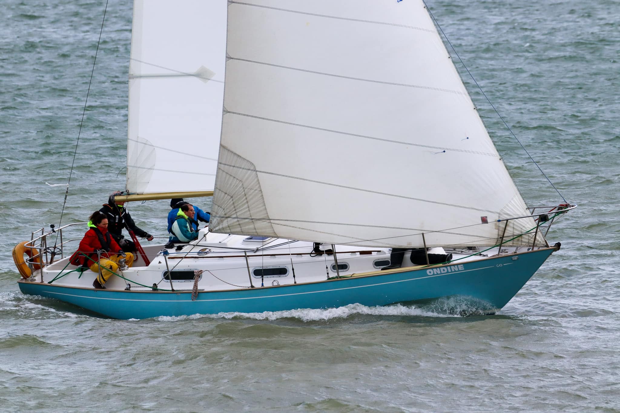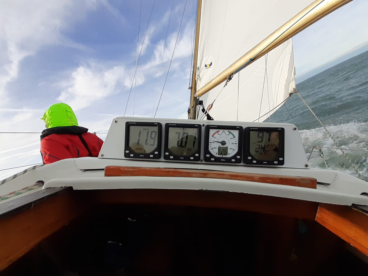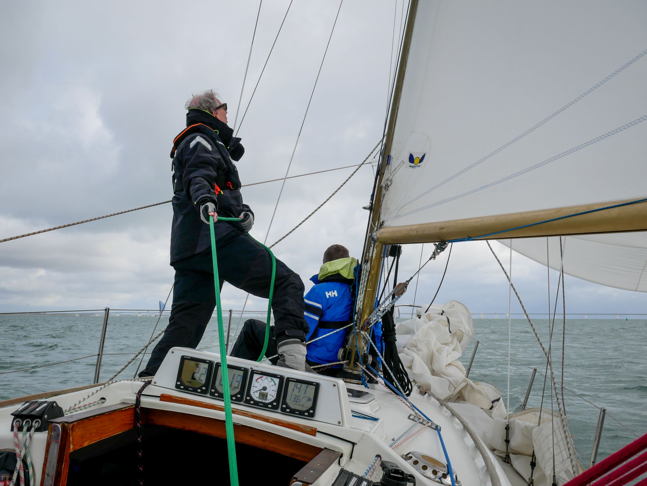 We behouden onze eerste positie, maar dan slaat het noodlot toe. Bij een gijp bij het ronden van SvC10, waar we vrijwel gelijktijdig met Vintage aankomen, breekt het blokje van de onderlijkspanner los en ontstaat er een scheur in het grootzeil. De eerste gedachte is motor starten, zeilen laten zakken en terug naar de haven. Maar we weten dat Vintage ver voor ons moet aankomen, gezien haar handicap en we hebben zo’n grote voorsprong op de rest van het veld dat we besluiten op alleen de genua de laatste 3 mijl van het parcours te varen. Vintage ligt inmiddels voor ons. Snel het grootzeil binnen gehaald en halve wind, dus alleen op de genua naar SvC14/OZ5, daarna ruime wind naar OZ6. Daar zien wij dat Vintage de stroming zwaar onderschat en ze missen de boei. Ze moeten dus terugdraaien om alsnog de boei te ronden en we lopen weer op hen in. Na het ronden van de OZ6, nog 1x overstag en over stuurboord naar het westen. Met vaak meer dan 20Kn wind lopen we nog meer dan 4Kn over de grond, alleen op de genua, tegen tij! Die sterke stroming zorgt er ook voor dat we precies uitkomen bij de SvC11, de laatste boei voor de finish. Daar kunnen we schoot iets lossen. Vintage is nauwelijks op ons uitgelopen. We passeren de lijn dus als tweede. Het resultaat op handicap: 1. Ondine 2. Aquavite (First 28) 3. Vintage (First 32)
