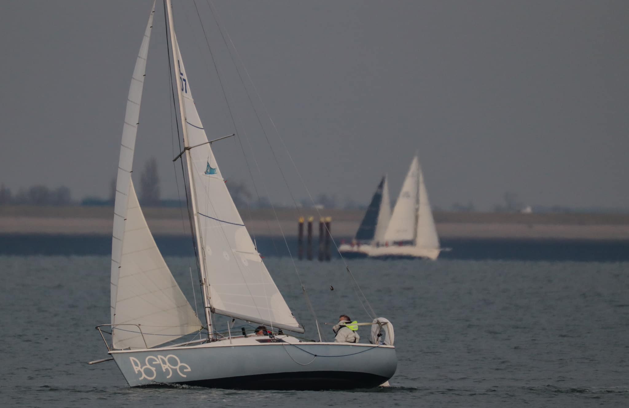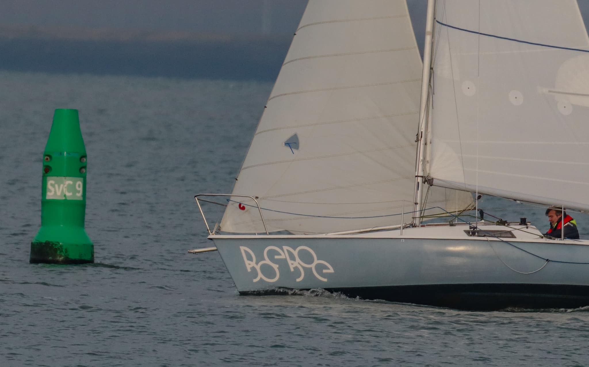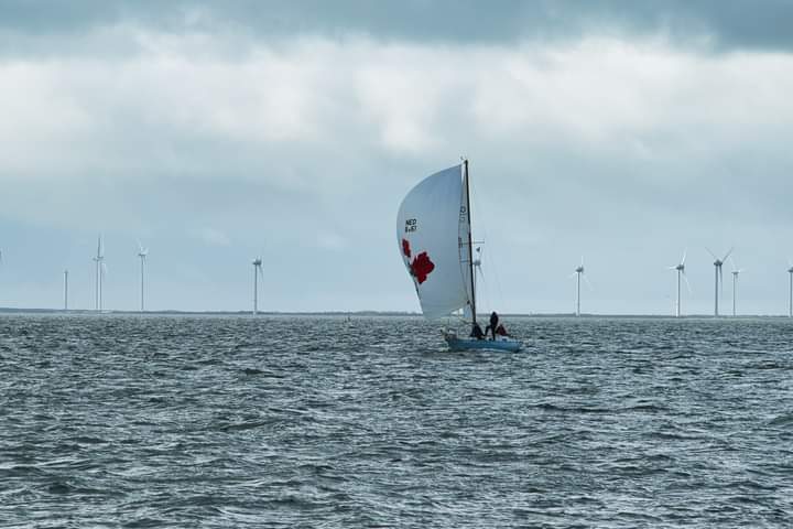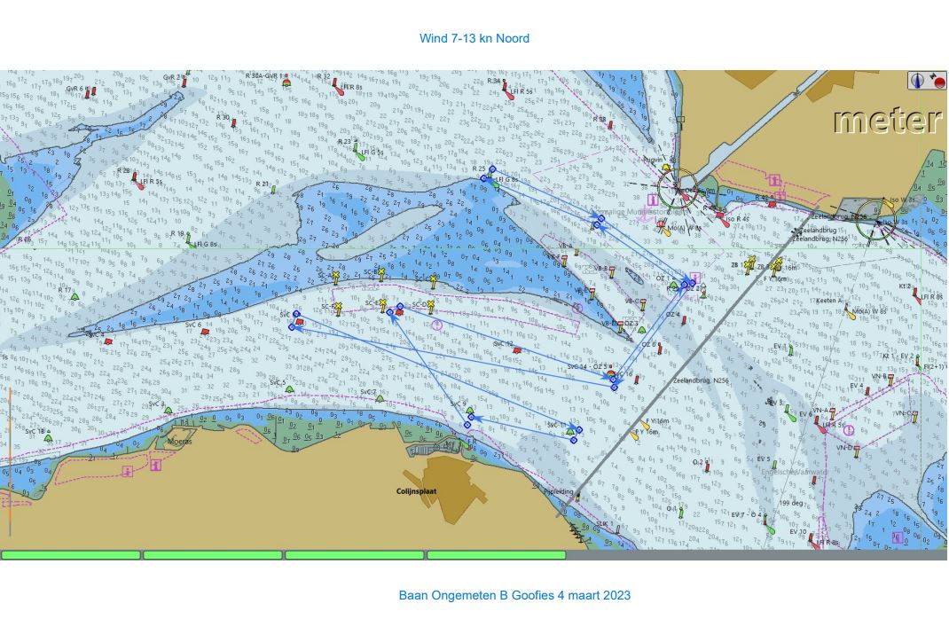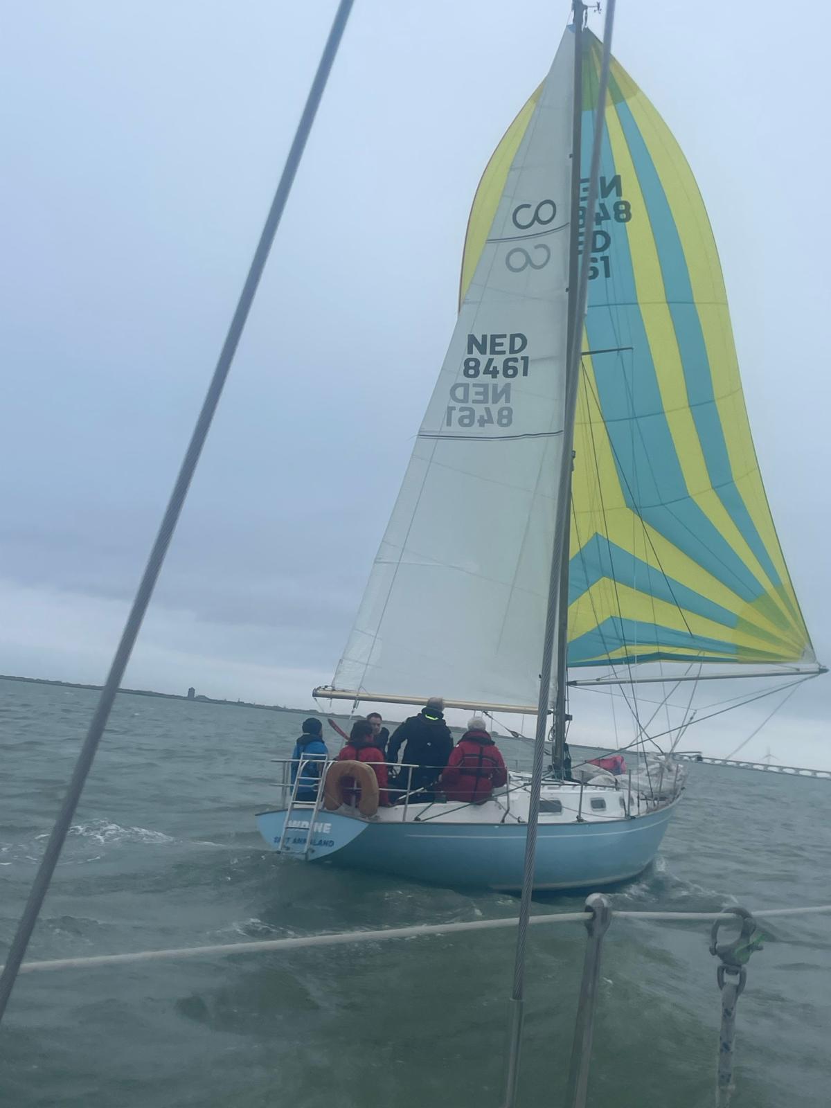 Zaterdag 1 April 2023. Zoals altijd de gehele week de weersverwachting nauwlettend in de gaten gehouden. Wij moeten voldoende wind hebben om ons te kunnen meten met de concurrentie. Deze laatste wedstrijd is extra spannend omdat we nog klans maken 2e te worden in het algemeen klassement. We moeten daartoe Victoire 933 “Spindrift” achter ons houden in de uitslag van vandaag. Marieholm “Spotgaai” is met al haar 1e plaatsen al verzekerd van de eindoverwinning, maar wij staan exact gelijk met “Spindrift” volgens onze berekeningen. Het weer is druilerig, maar de windverwachting is goed, 14-18Kn NW, draaiend naar N. We hebben een lange baan, start naar het westen tot SvC 8, aan de wind, tegen stroom en dan terug oostwaarts voor een rondje plaat. Onze start is goed, maar bij een poging een langer rak stuurboord uit naar de plaat moeten we overstag in een bakboord/stuurboord situatie met “Spindrift” we worden daardoor gedwongen wat langer in het midden te blijven (dieper water dus meer stroom tegen) “Spotgaai”, “Boeboe”en “Spindrift” zijn daardoor iets eerder bij de ScV8. Daar kan de spi erop en zetten we de achtervolging in. Bij de SvC14/OZ5 liggen we kort achter “Spotgaai”. We nemen alle risico’s en droppen de spi zo laat mogelijk. Dat gaat goed en kort na de boei lopen de “Spotgaai” voorbij. Bij R29/OZ2 ligt “Spindrift” nog maar 45 sec. voor. Nu aan de wind via Roompot en Groot Vuilbaard richting R15 SvC2. We komen nu ook in de baan van de andere klassen, dus het is zaak zo veel mogelijk vrije wind te houden. Het lijkt erop dat “Spindrift” iets is uitgelopen als we bij R15/SvC2 aankomen, maar niet veel. De Spi kan weer op. Het is inmiddels afgaand water. Zij kiezen voor het midden/stuurboord zijde van het vaarwater. Wij kiezen voor de bakboord zijde. Iets langer, maar mogelijk minder stroom tegen.