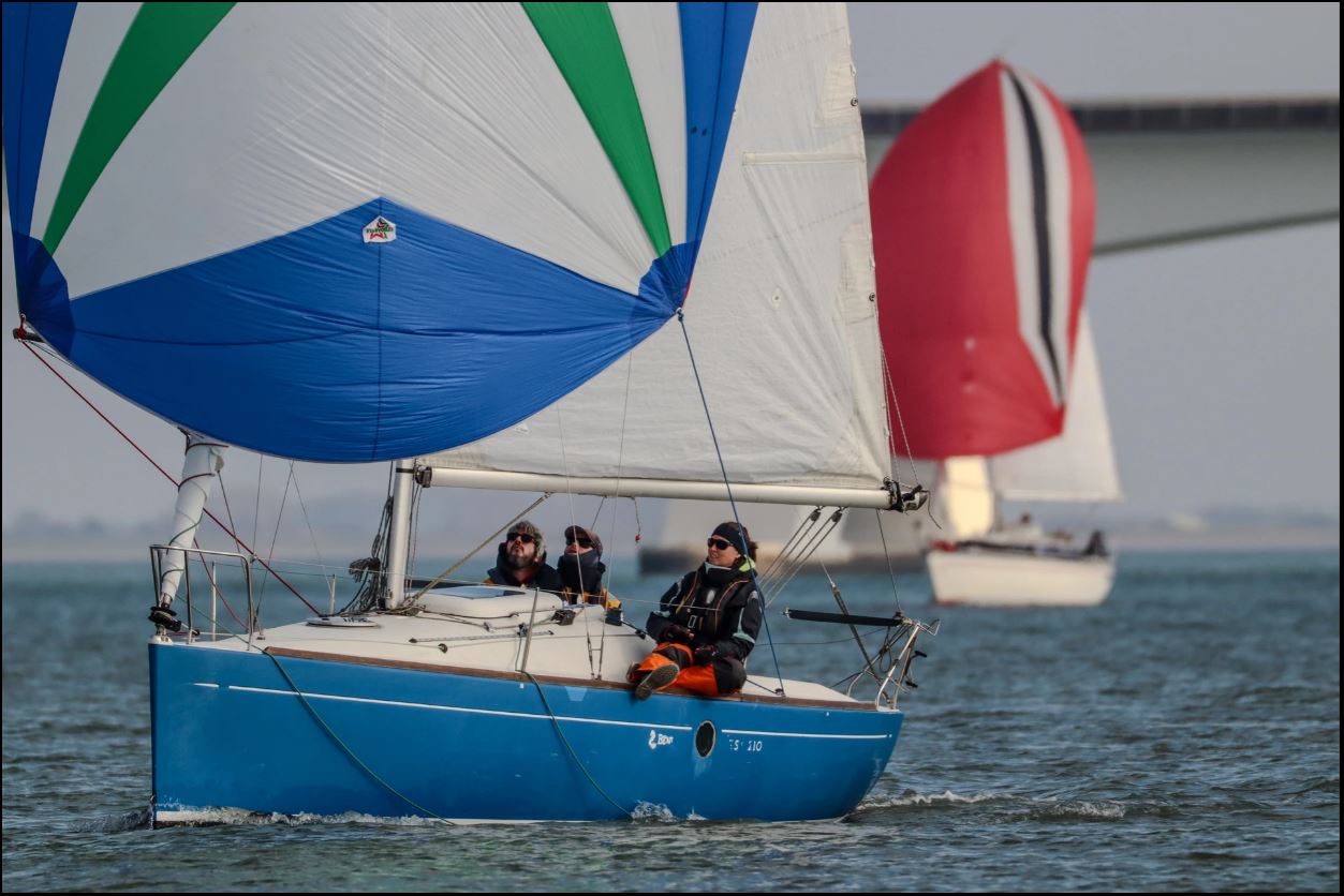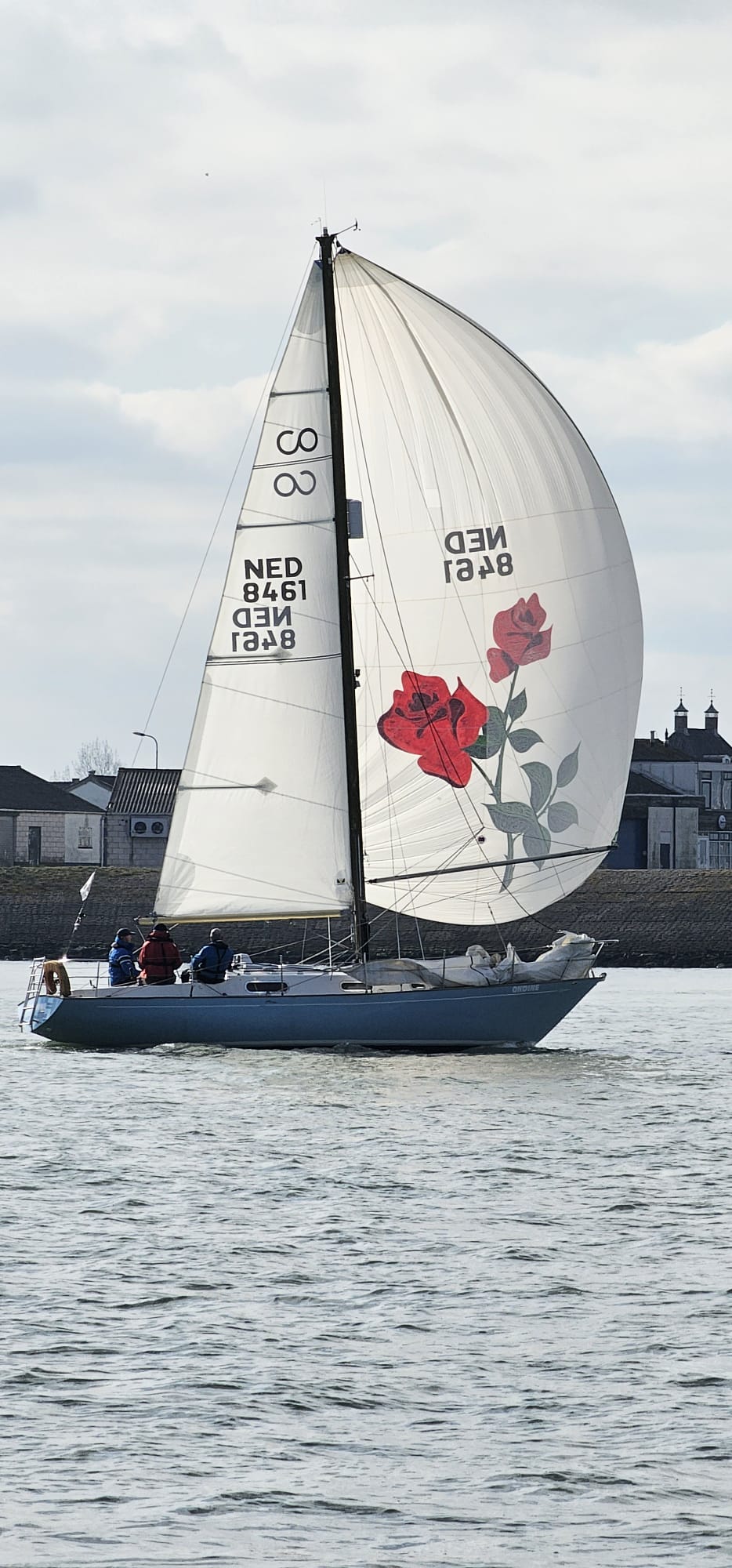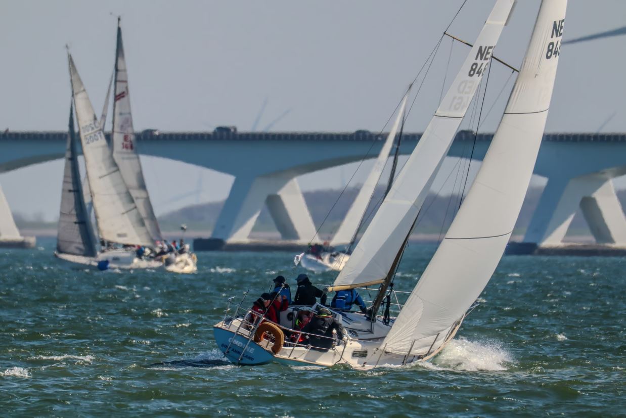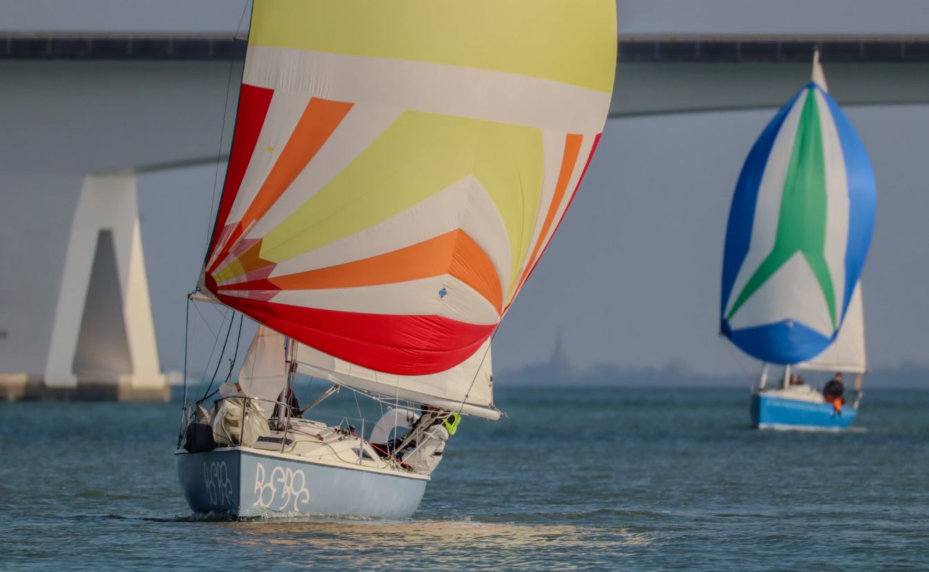 Zaterdag 1 April 2023. Zoals altijd de gehele week de weersverwachting nauwlettend in de gaten gehouden. Wij moeten voldoende wind hebben om ons te kunnen meten met de concurrentie. Deze laatste wedstrijd is extra spannend omdat we nog klans maken 2e te worden in het algemeen klassement. We moeten daartoe Victoire 933 “Spindrift” achter ons houden in de uitslag van vandaag. Marieholm “Spotgaai” is met al haar 1e plaatsen al verzekerd van de eindoverwinning, maar wij staan exact gelijk met “Spindrift” volgens onze berekeningen. Het weer is druilerig, maar de windverwachting is goed, 14-18Kn NW, draaiend naar N. We hebben een lange baan, start naar het westen tot SvC 8, aan de wind, tegen stroom en dan terug oostwaarts voor een rondje plaat. Onze start is goed, maar bij een poging een langer rak stuurboord uit naar de plaat moeten we overstag in een bakboord/stuurboord situatie met “Spindrift” we worden daardoor gedwongen wat langer in het midden te blijven (dieper water dus meer stroom tegen) “Spotgaai”, “Boeboe”en “Spindrift” zijn daardoor iets eerder bij de ScV8. Daar kan de spi erop en zetten we de achtervolging in. Bij de SvC14/OZ5 liggen we kort achter “Spotgaai”. We nemen alle risico’s en droppen de spi zo laat mogelijk. Dat gaat goed en kort na de boei lopen de “Spotgaai” voorbij. Bij R29/OZ2 ligt “Spindrift” nog maar 45 sec. voor. Nu aan de wind via Roompot en Groot Vuilbaard richting R15 SvC2. We komen nu ook in de baan van de andere klassen, dus het is zaak zo veel mogelijk vrije wind te houden. Het lijkt erop dat “Spindrift” iets is uitgelopen als we bij R15/SvC2 aankomen, maar niet veel. De Spi kan weer op. Het is inmiddels afgaand water. Zij kiezen voor het midden/stuurboord zijde van het vaarwater. Wij kiezen voor de bakboord zijde. Iets langer, maar mogelijk minder stroom tegen.