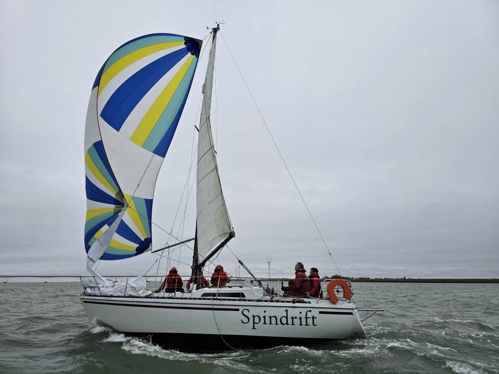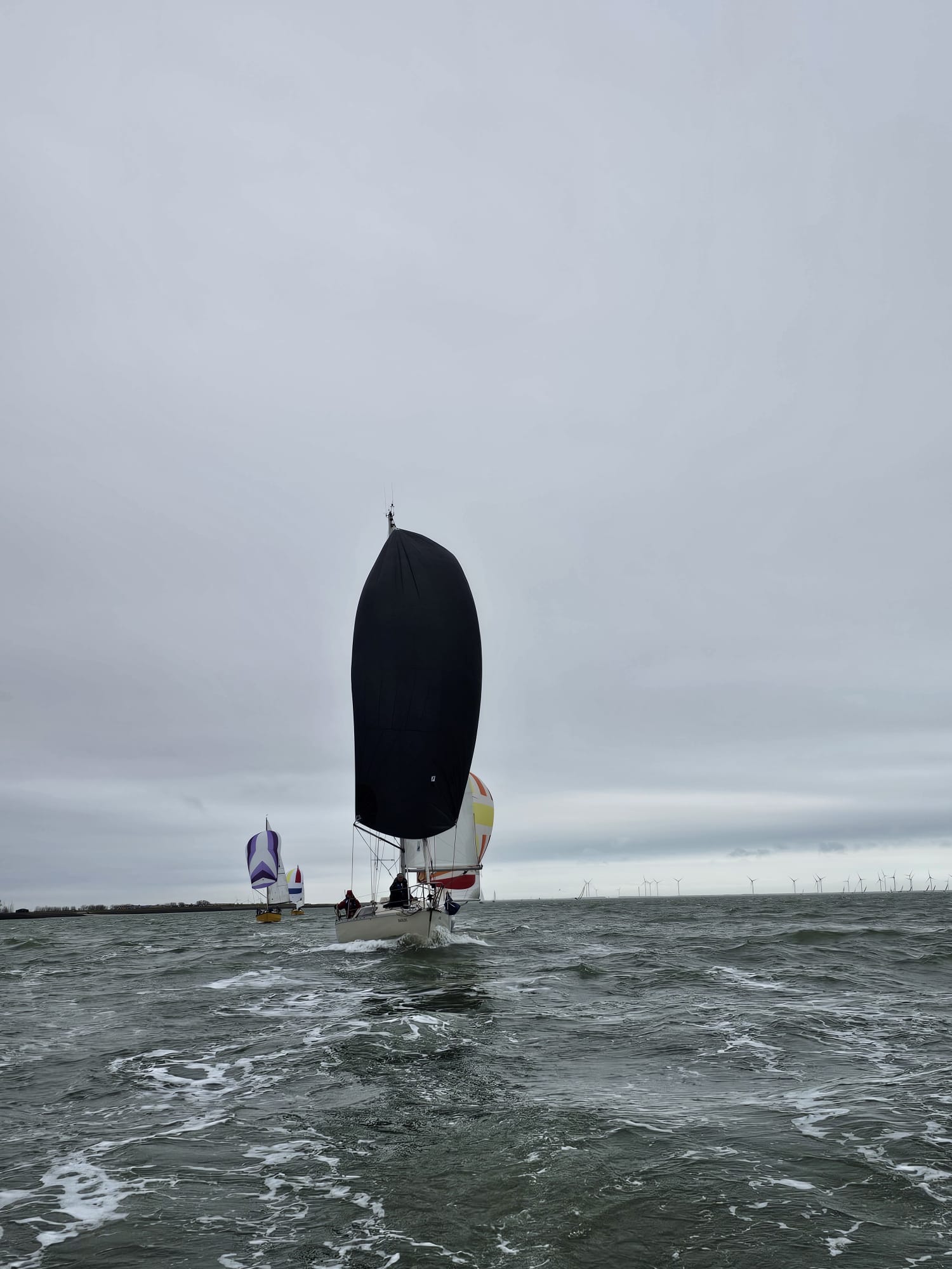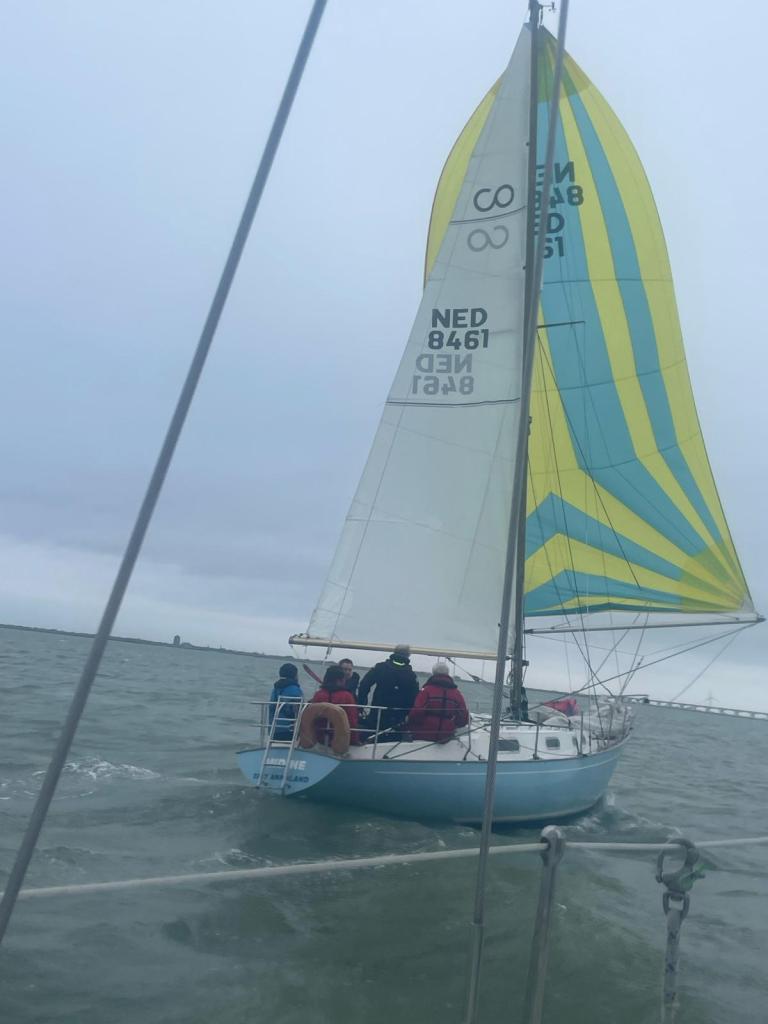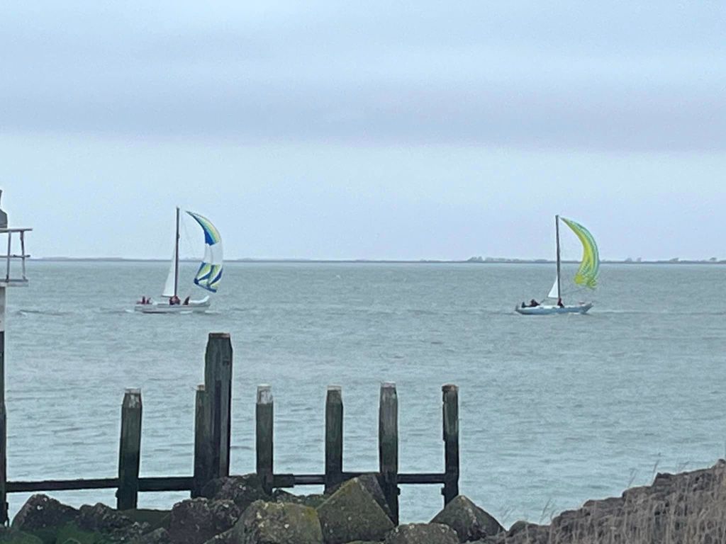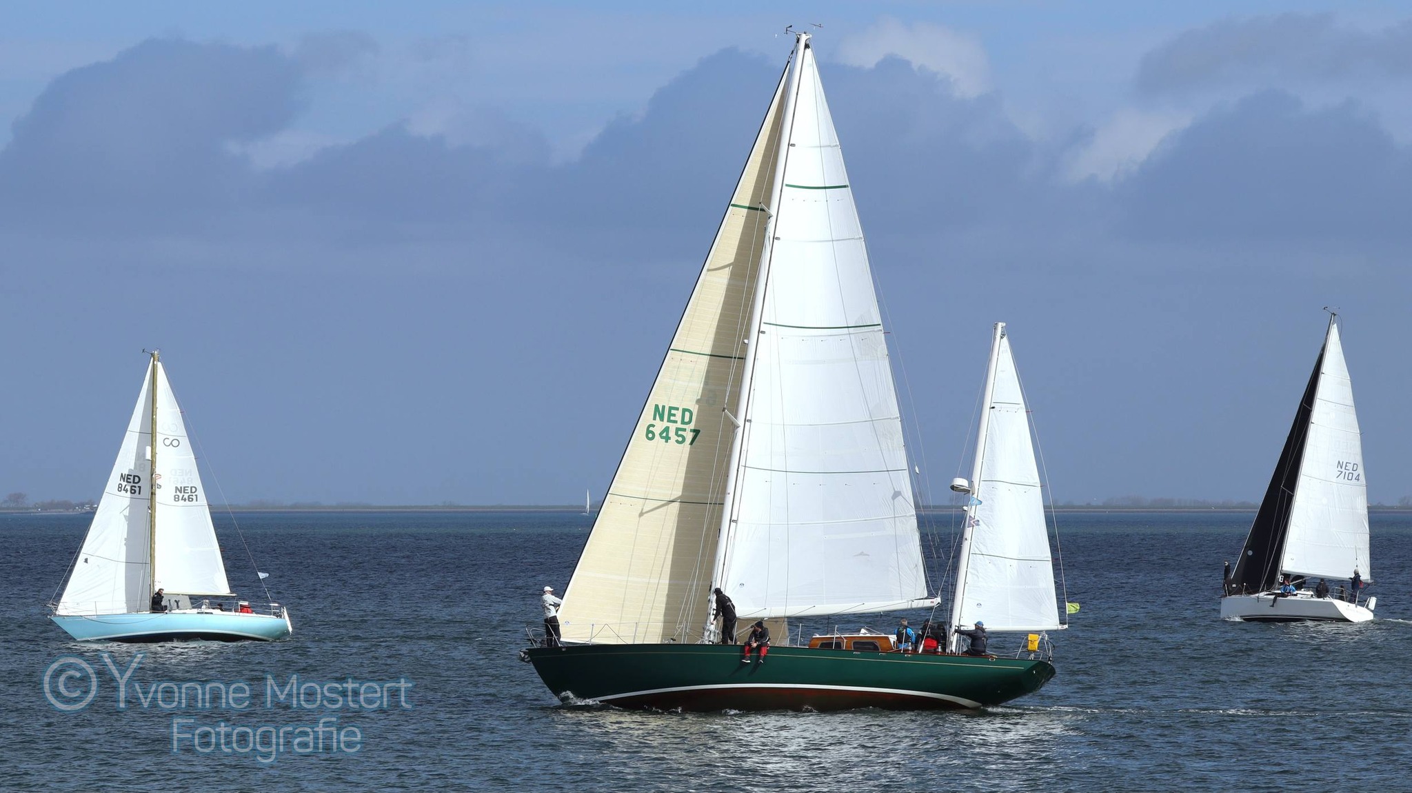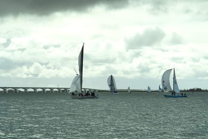 Zaterdag 6 april 2024, de laatste wedstrijd van dit seizoen. Windverwachting 17-18Kn ZZO, met stevige vlagen. Droog, temp. >18 gr. C. Wij staan momenteel 3e in het klassement, Spotgaai ver voor ons, Spindrift 2 punten en Boeboe 1 punt achter ons. Wij missen vandaag Alexander, dus met 5 aan boord. Boeboe verschijnt niet aan de start. Om te stijgen in het klassement is het dus zaak Spindrift zo ver mogelijk achter ons te houden. Er zijn in totaal 7 schepen aan de start. Inderdaad 17kKn wind, zoals verwacht. Vol grootzeil en Genua 2. 12:20 uur. Onze start is goed, als eerste over de lijn. Spindrift ligt ver voor ons, niet omdat ze te vroeg zijn gestart, maar omdat ze denken dat de start om 12:30u is, zoals in het verleden. Ze zijn zich nog aan het positioneren voor dat tijdstip. Ze worden teruggeroepen door de wedstrijdleiding, keren snel om en starten dus veel later dan de rest.