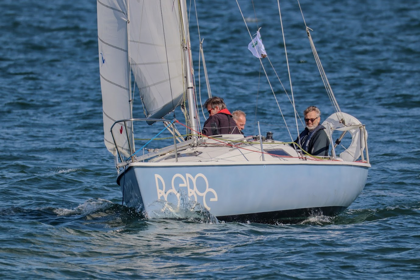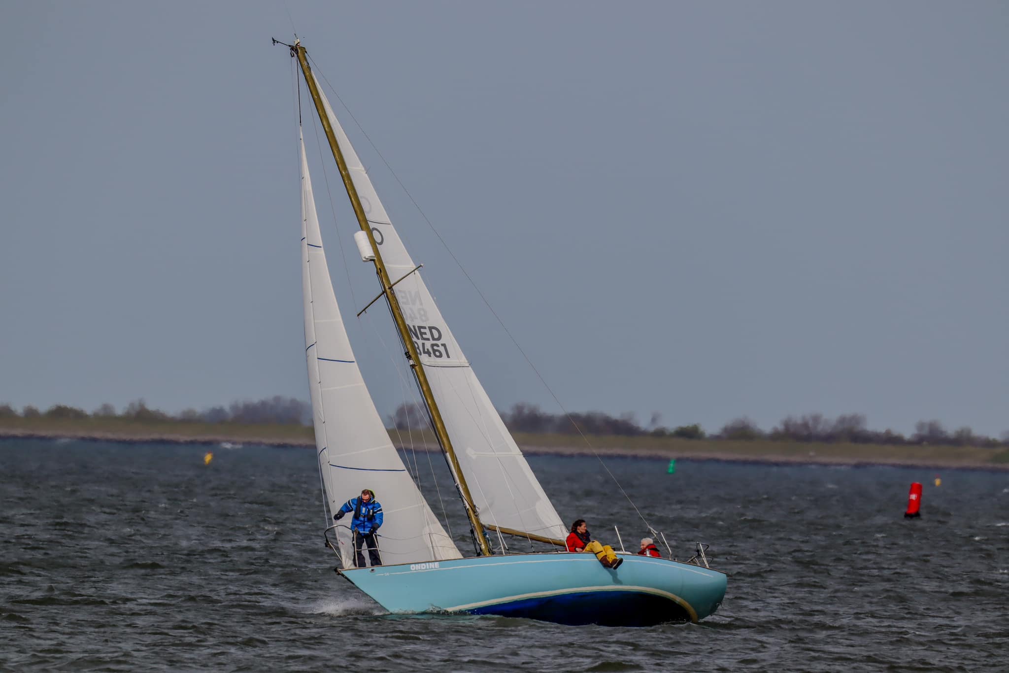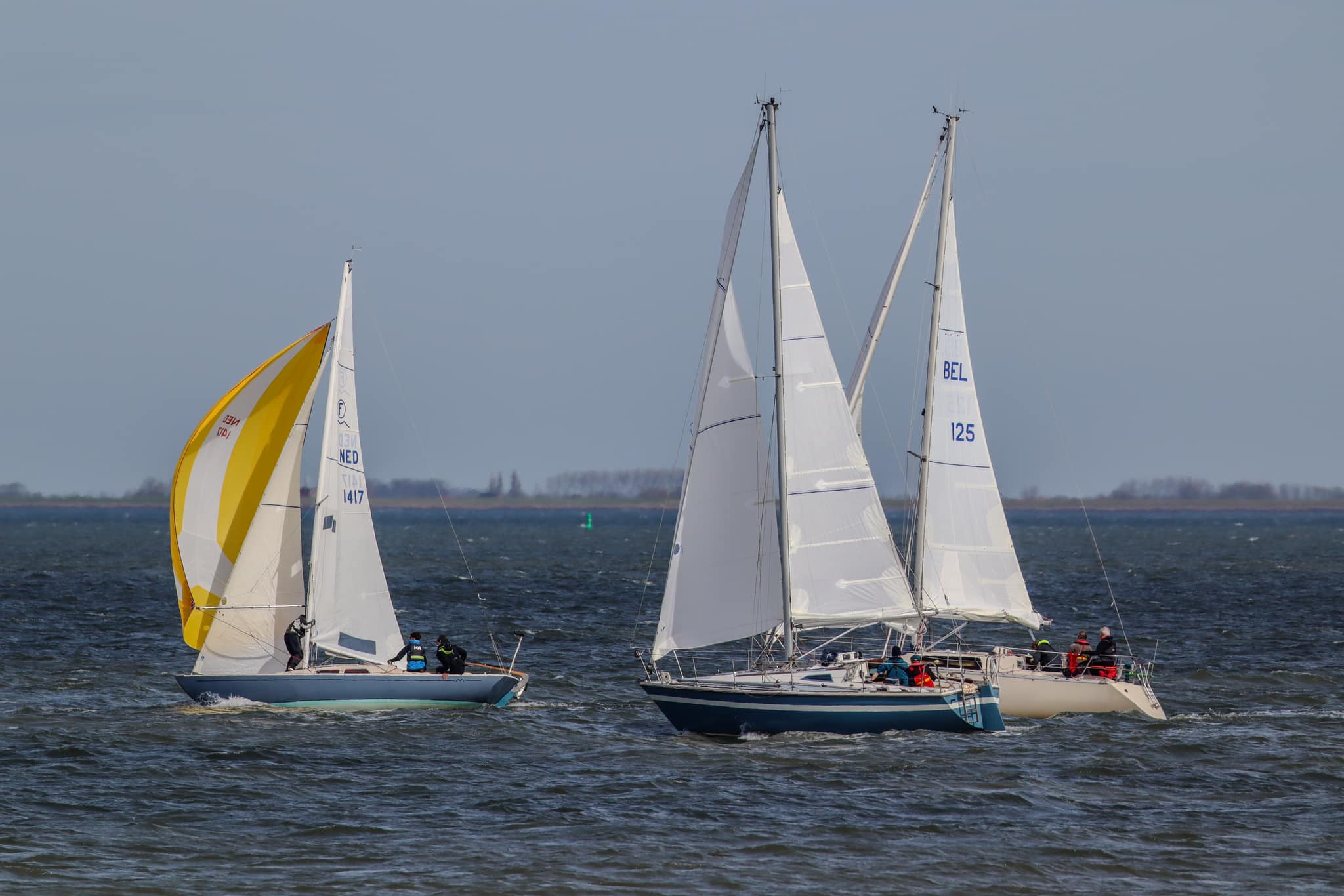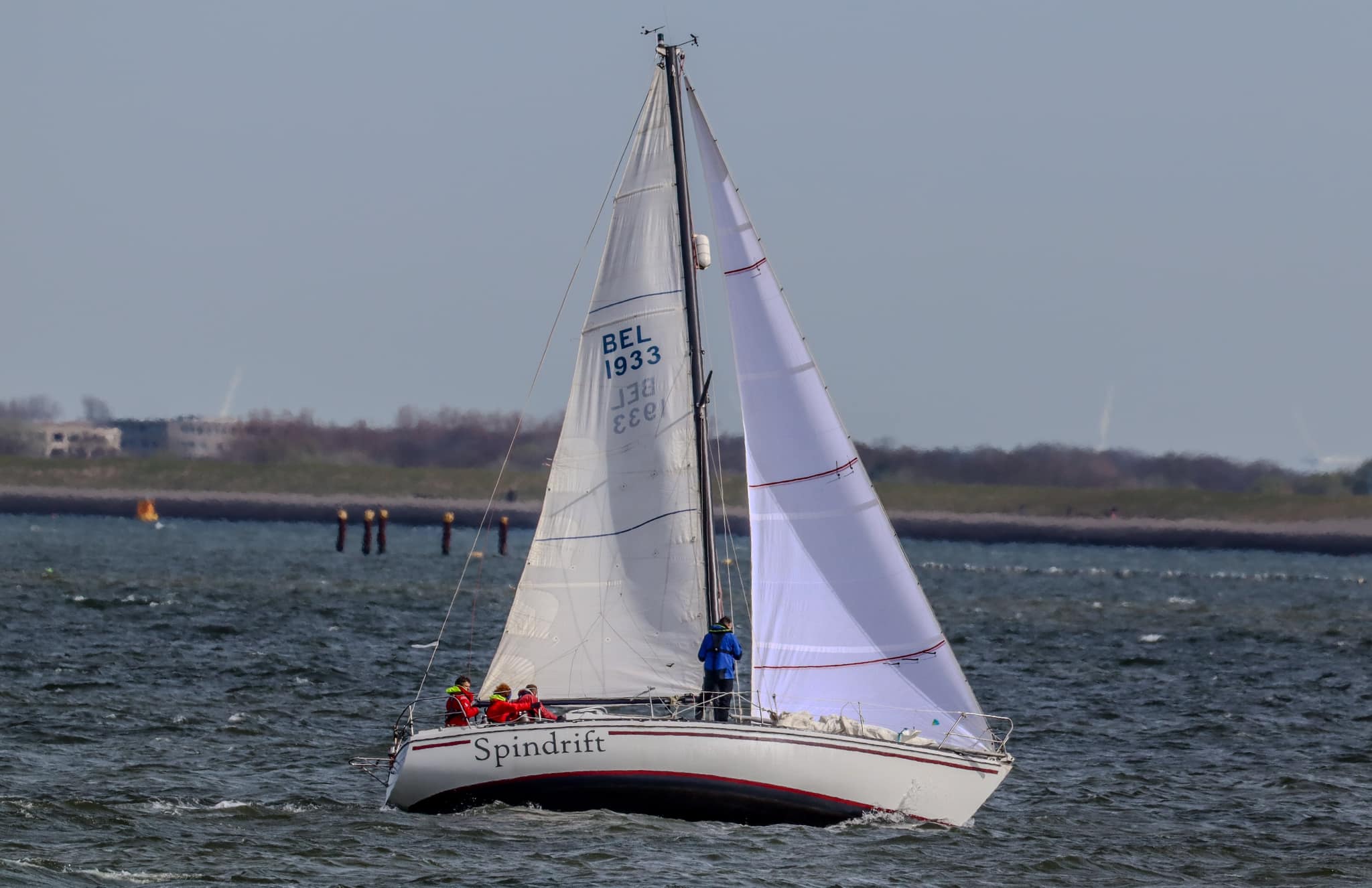Zaterdag 6 april 2024, de laatste wedstrijd van dit seizoen. Windverwachting 17-18Kn ZZO, met stevige vlagen. Droog, temp. >18 gr. C. Wij staan momenteel 3e in het klassement, Spotgaai ver voor ons, Spindrift 2 punten en Boeboe 1 punt achter ons. Wij missen vandaag Alexander, dus met 5 aan boord. Boeboe verschijnt niet aan de start. Om te stijgen in het klassement is het dus zaak Spindrift zo ver mogelijk achter ons te houden. Er zijn in totaal 7 schepen aan de start. Inderdaad 17kKn wind, zoals verwacht. Vol grootzeil en Genua 2. 12:20 uur. Onze start is goed, als eerste over de lijn. Spindrift ligt ver voor ons, niet omdat ze te vroeg zijn gestart, maar omdat ze denken dat de start om 12:30u is, zoals in het verleden. Ze zijn zich nog aan het positioneren voor dat tijdstip. Ze worden teruggeroepen door de wedstrijdleiding, keren snel om en starten dus veel later dan de rest.