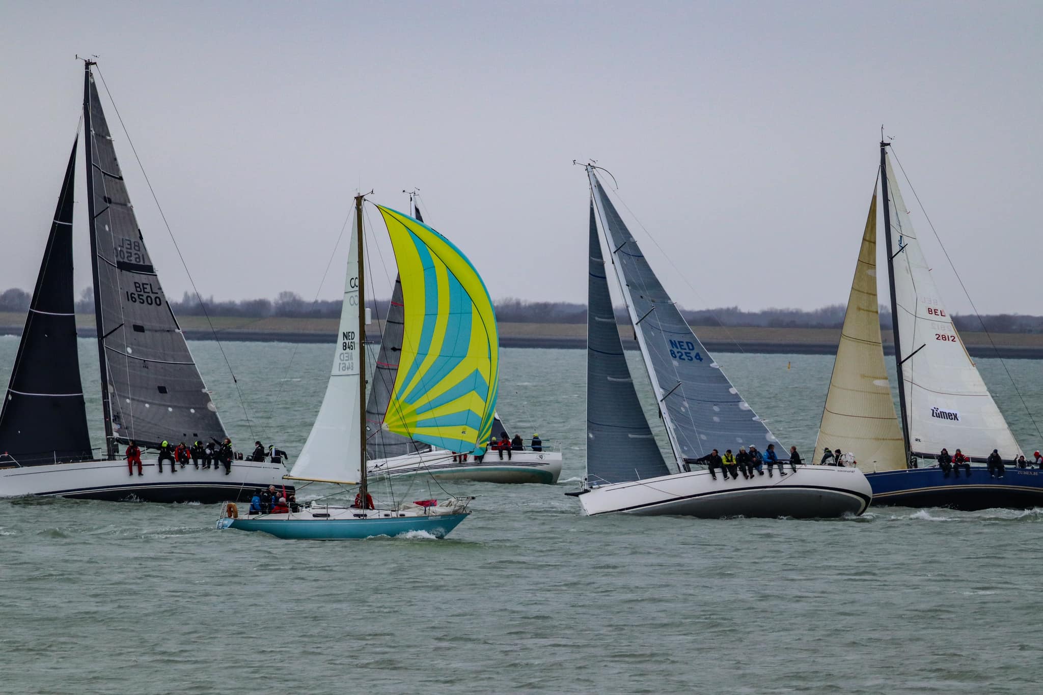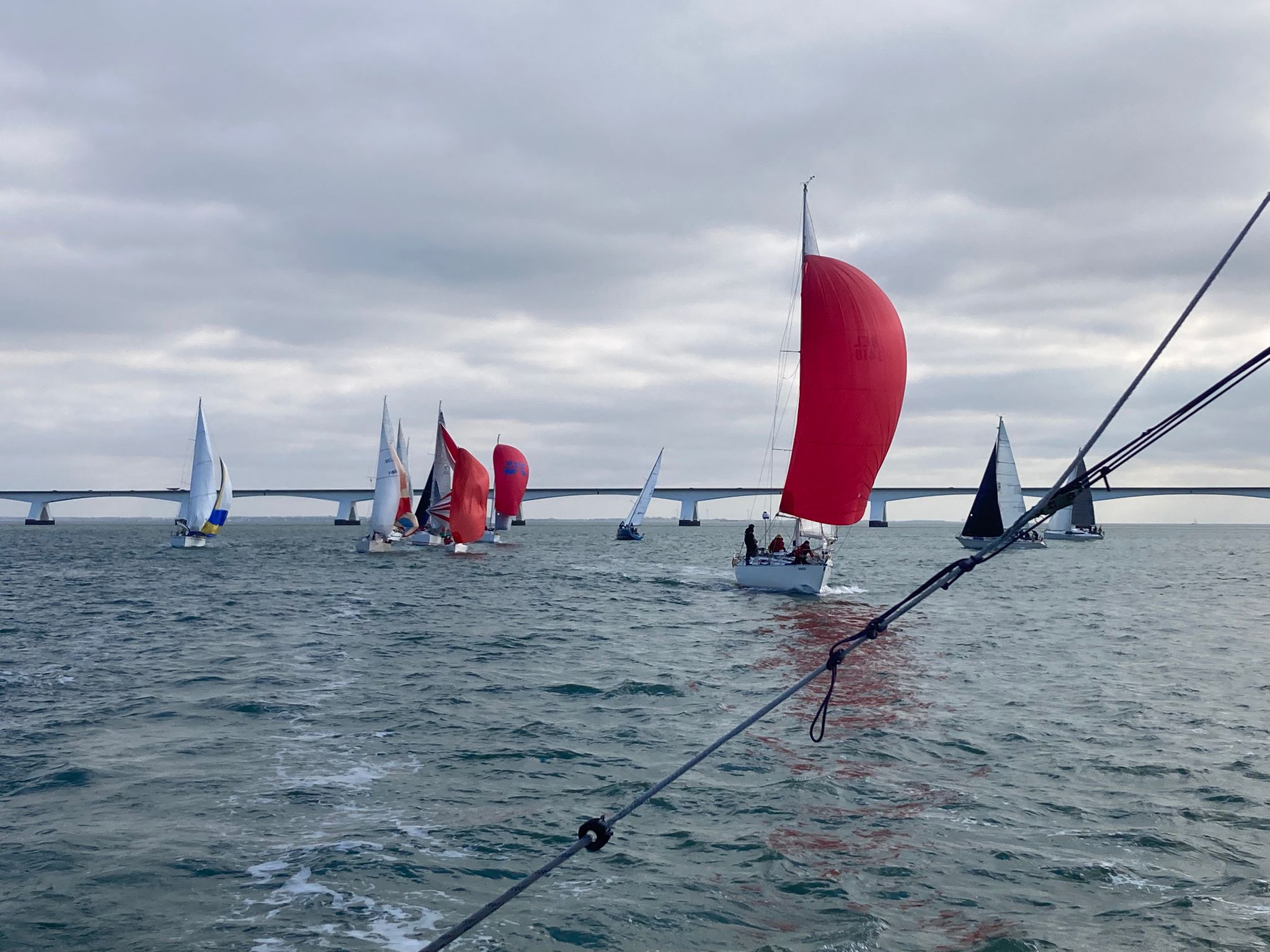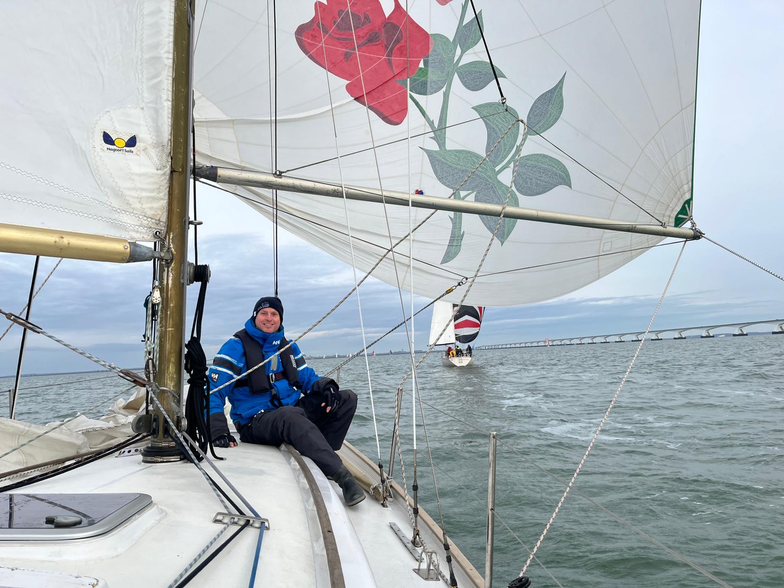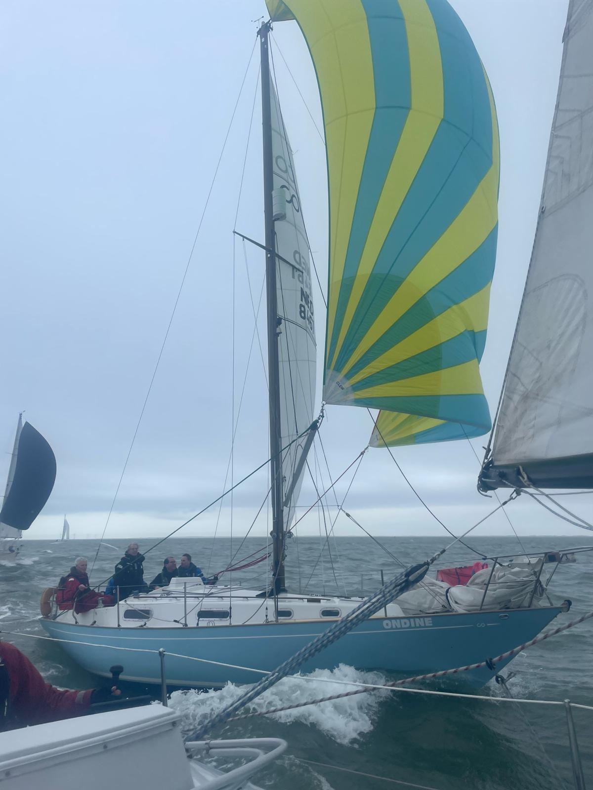 Bij de start is er een zwakke oosten wind, tij tegen, dus reeds voor het startsein trekken we de spi.