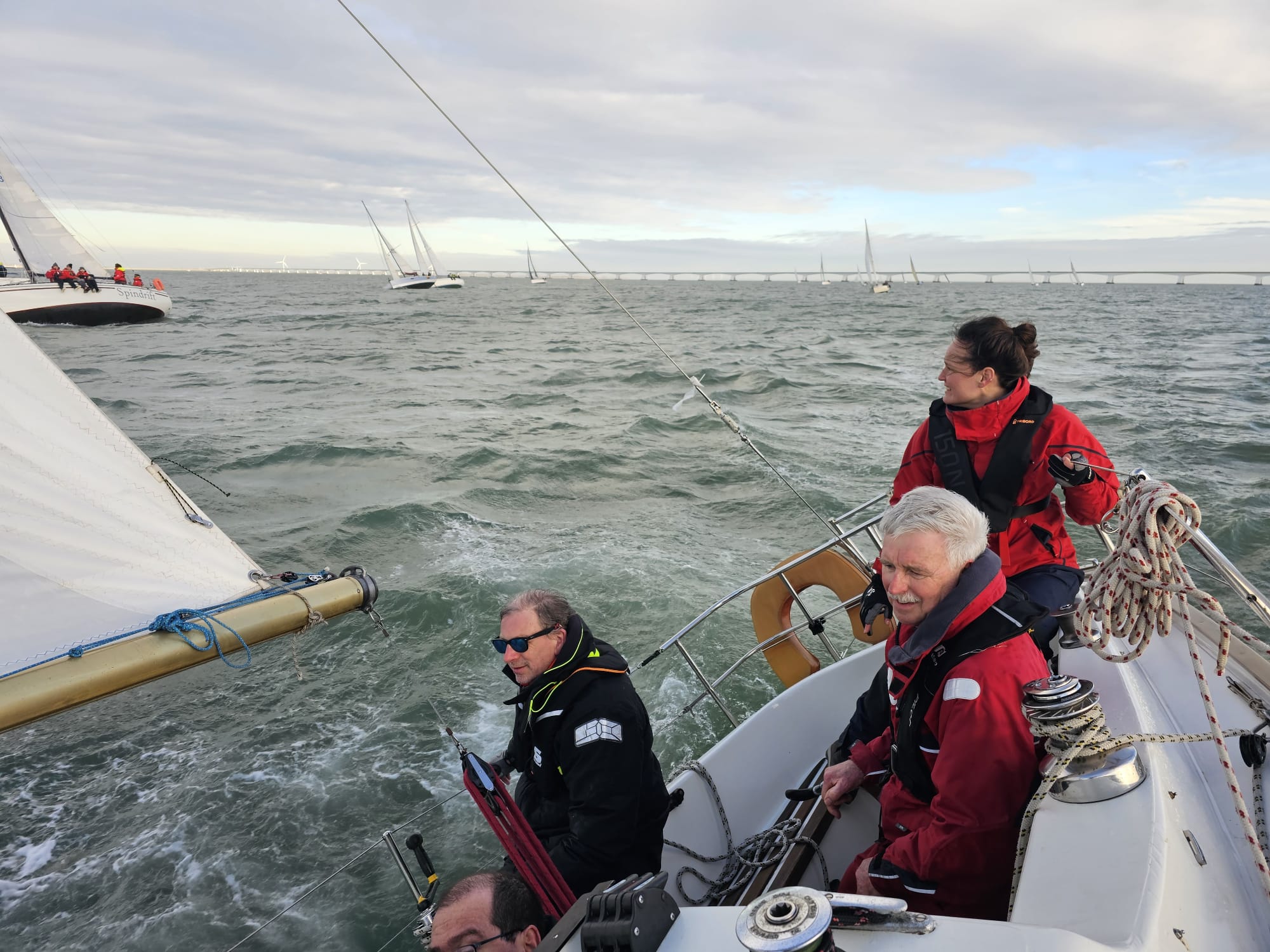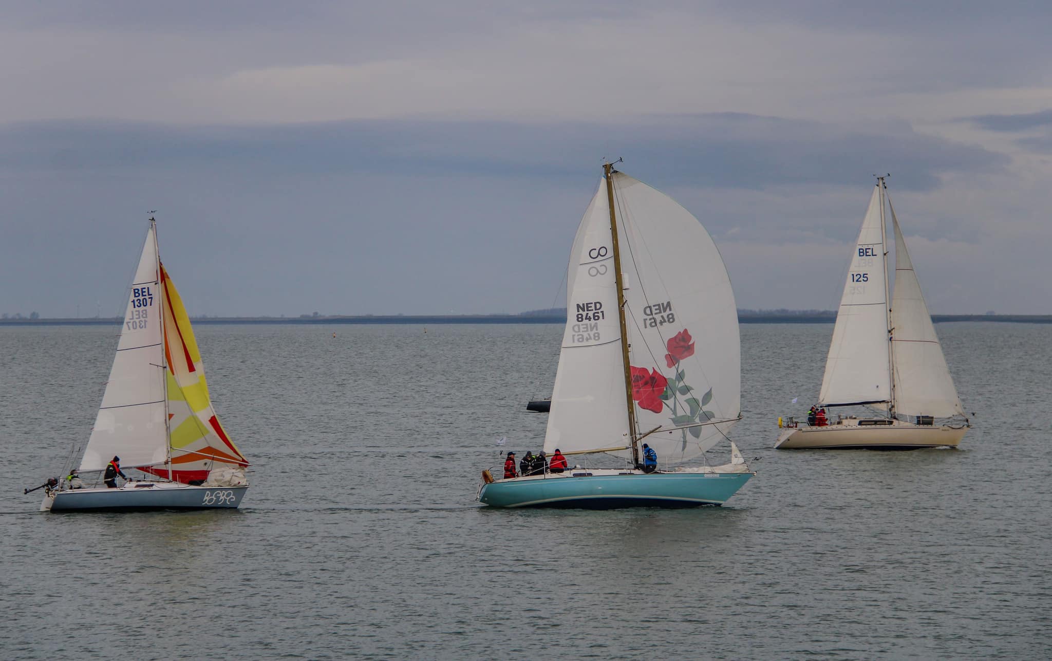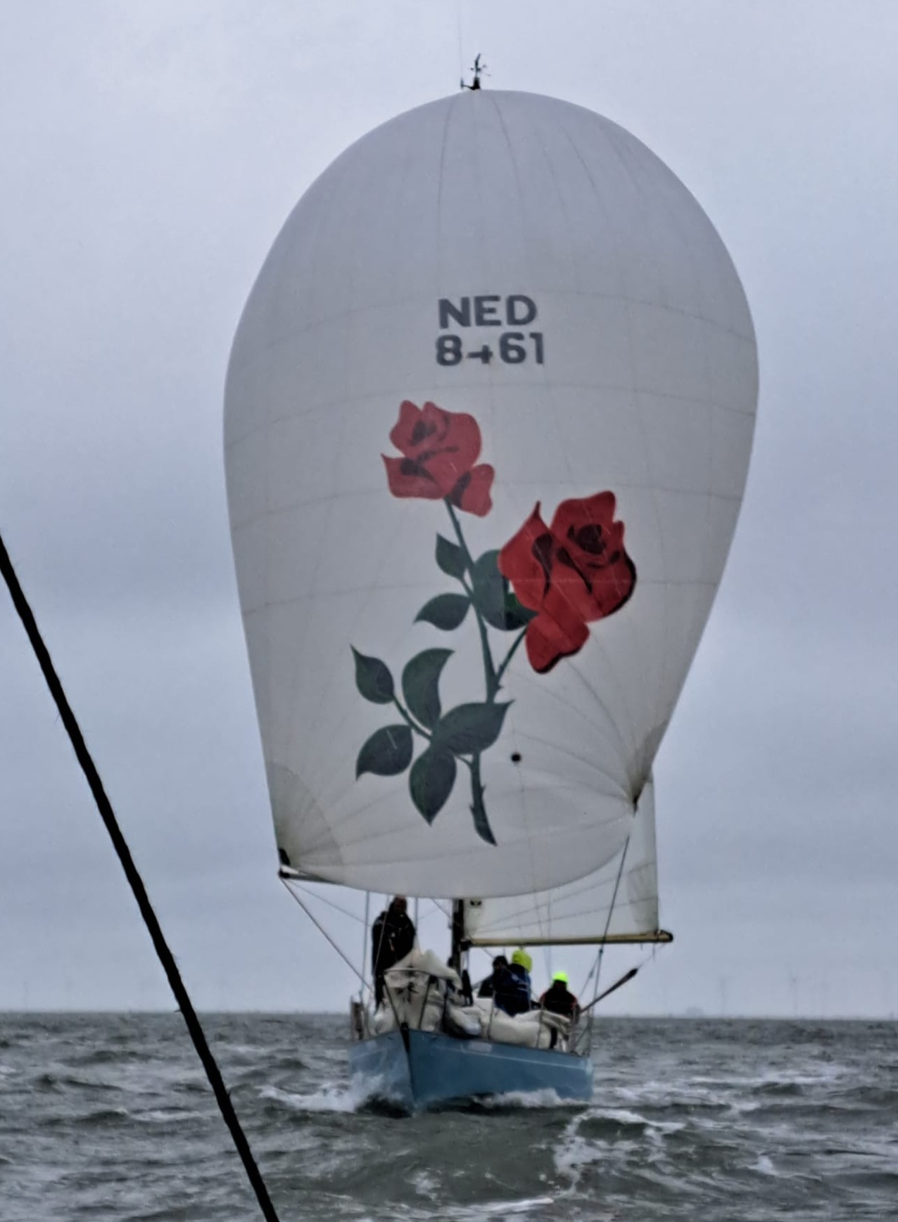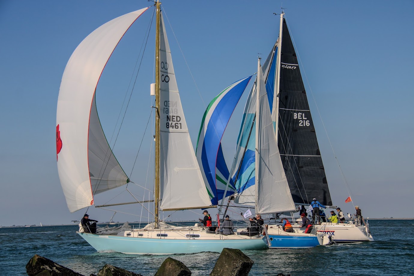 Bij de start is er een zwakke oosten wind, tij tegen, dus reeds voor het startsein trekken we de spi.