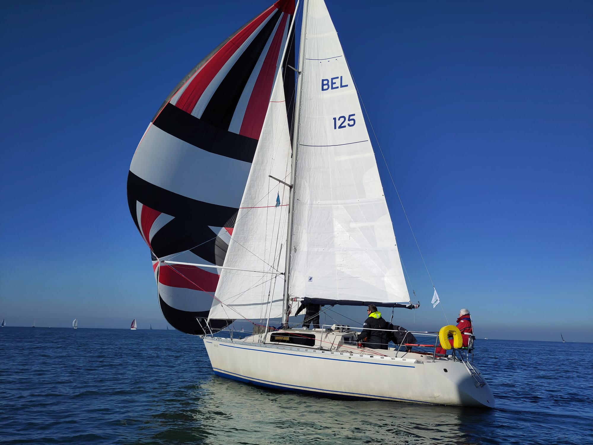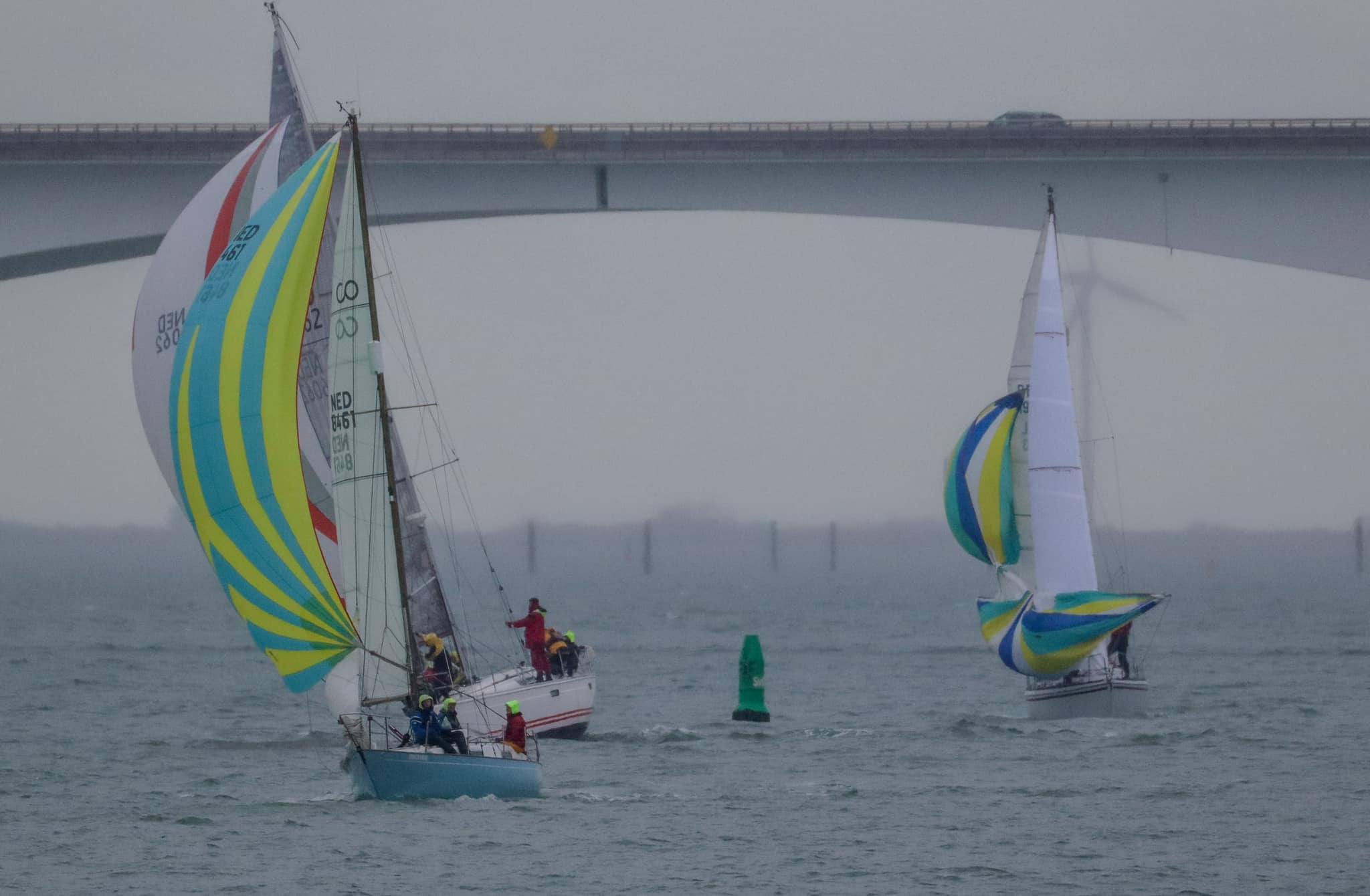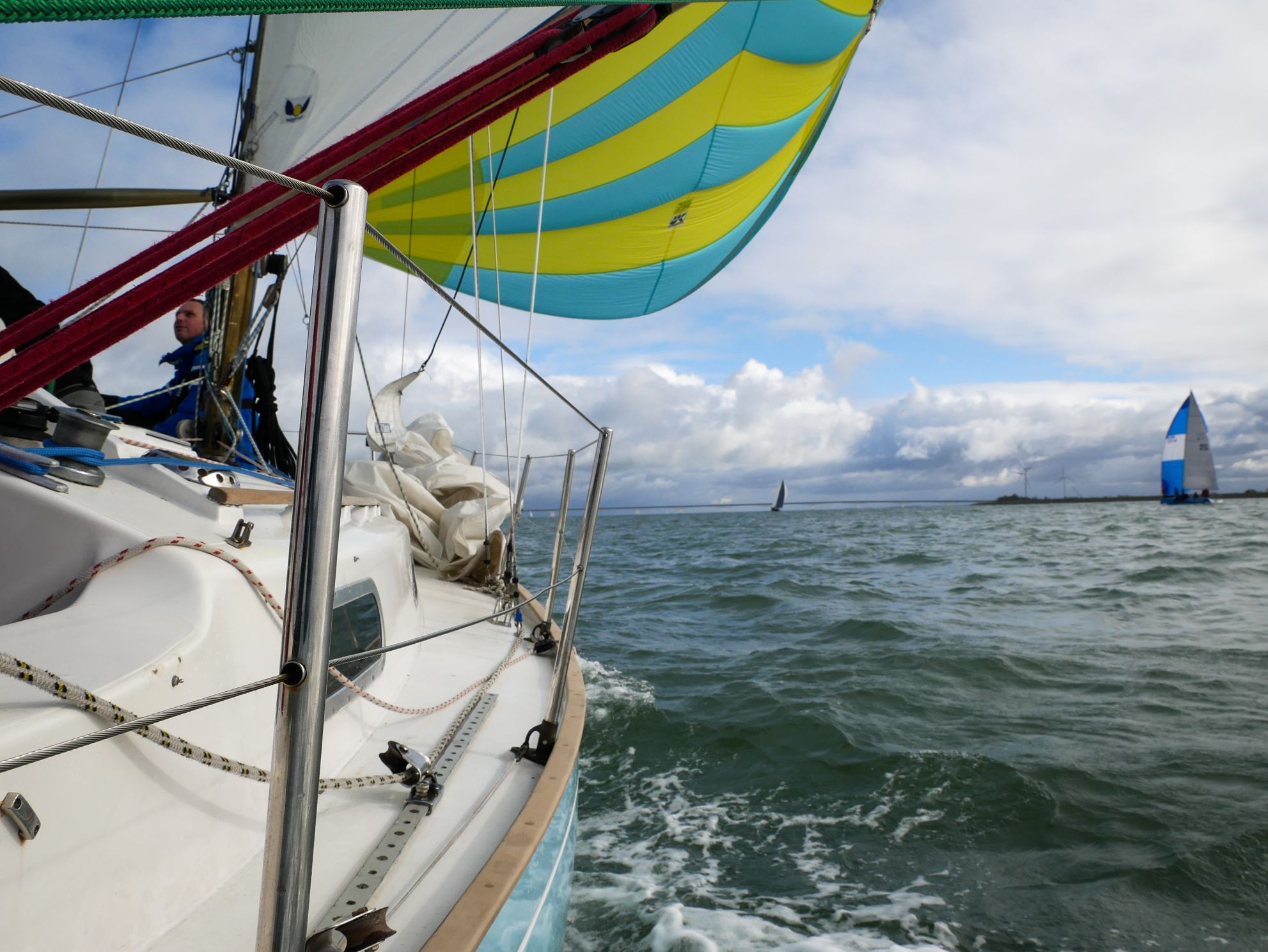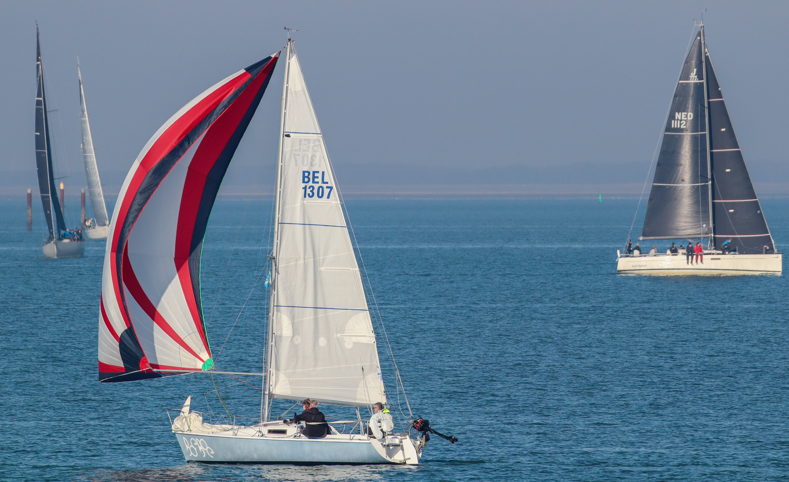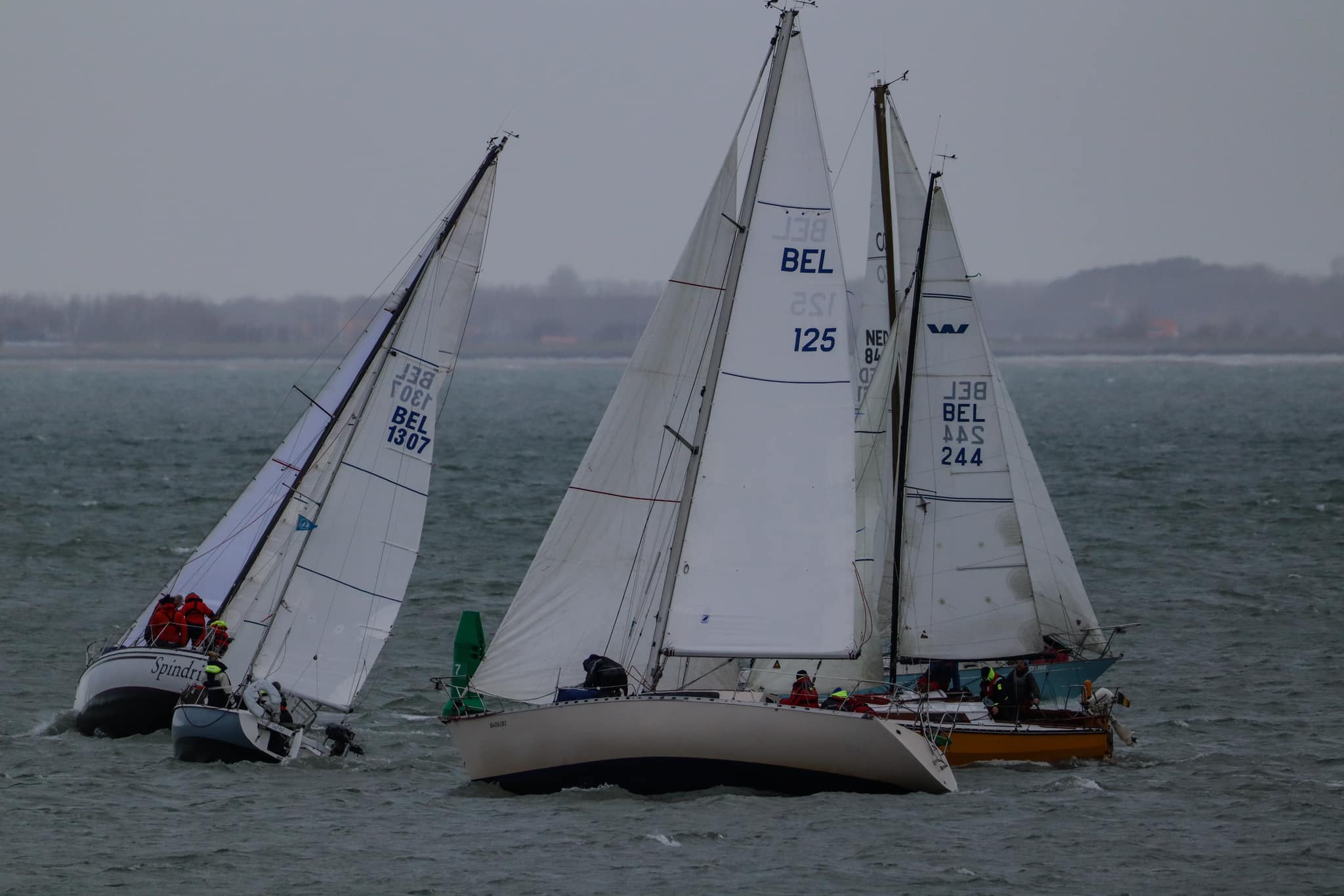 Bij de start is er een zwakke oosten wind, tij tegen, dus reeds voor het startsein trekken we de spi.