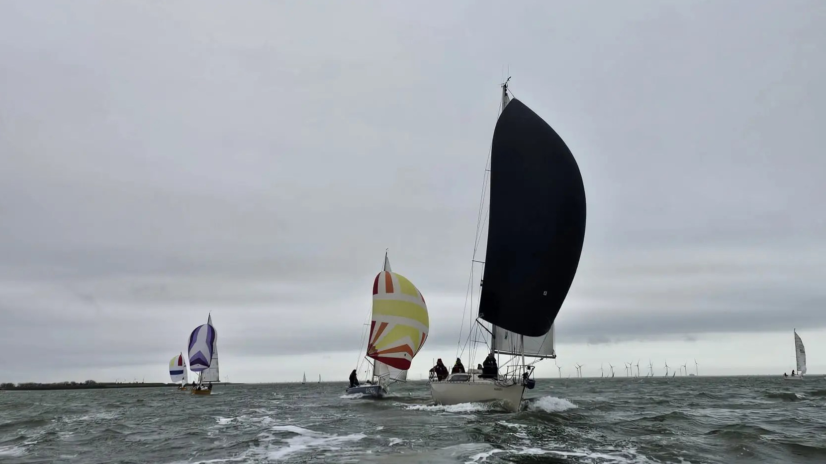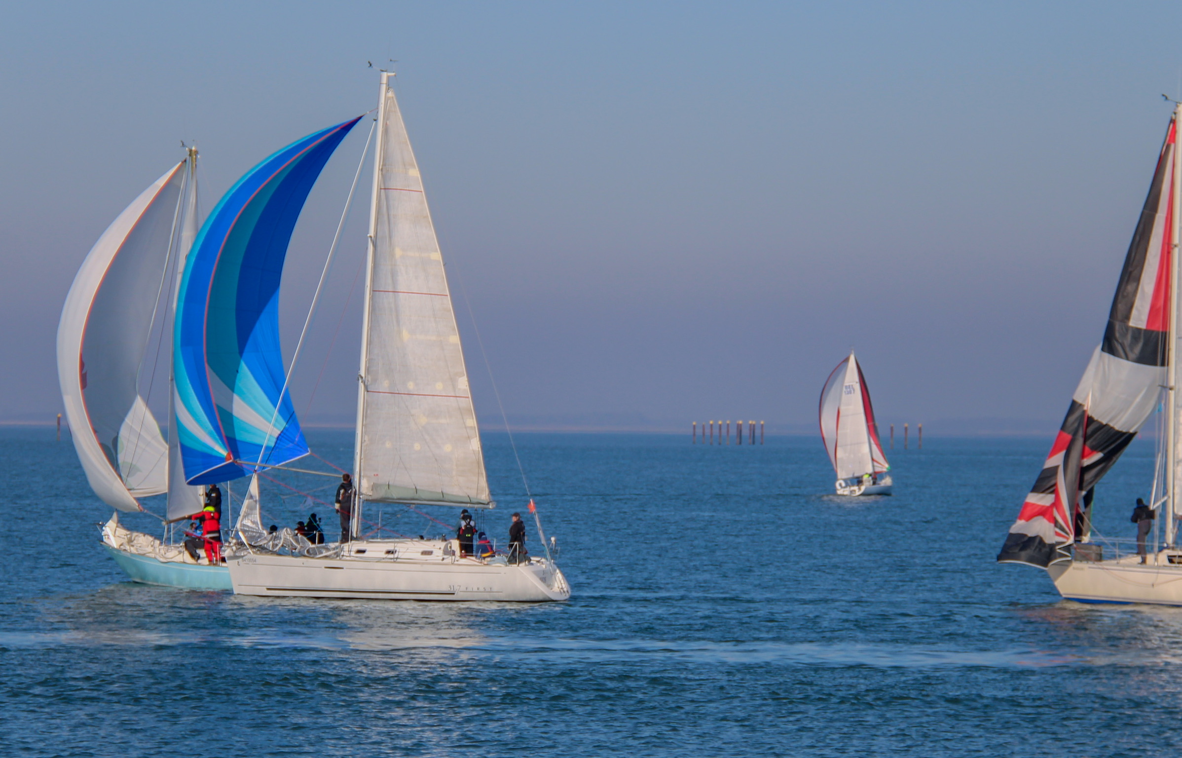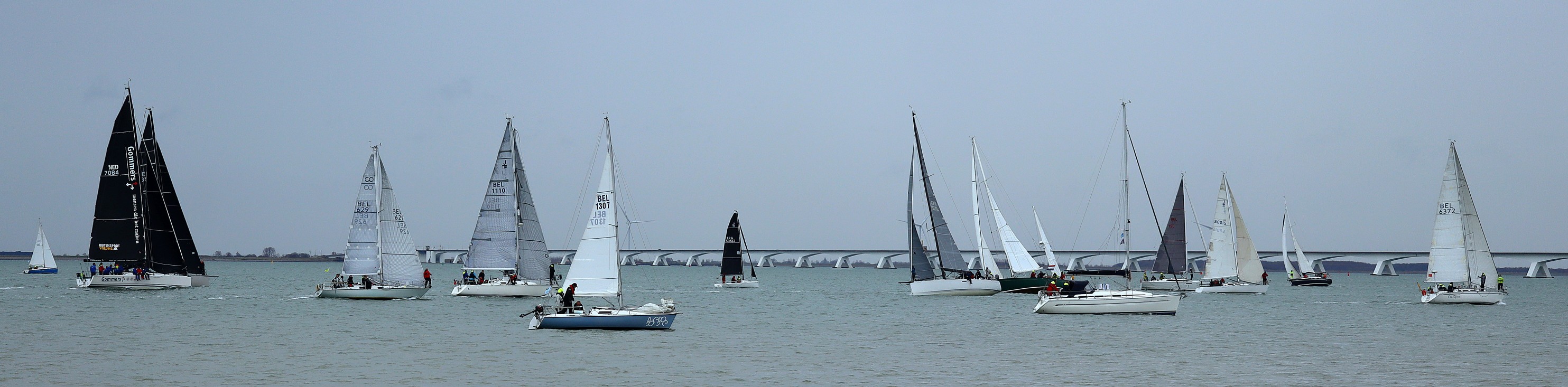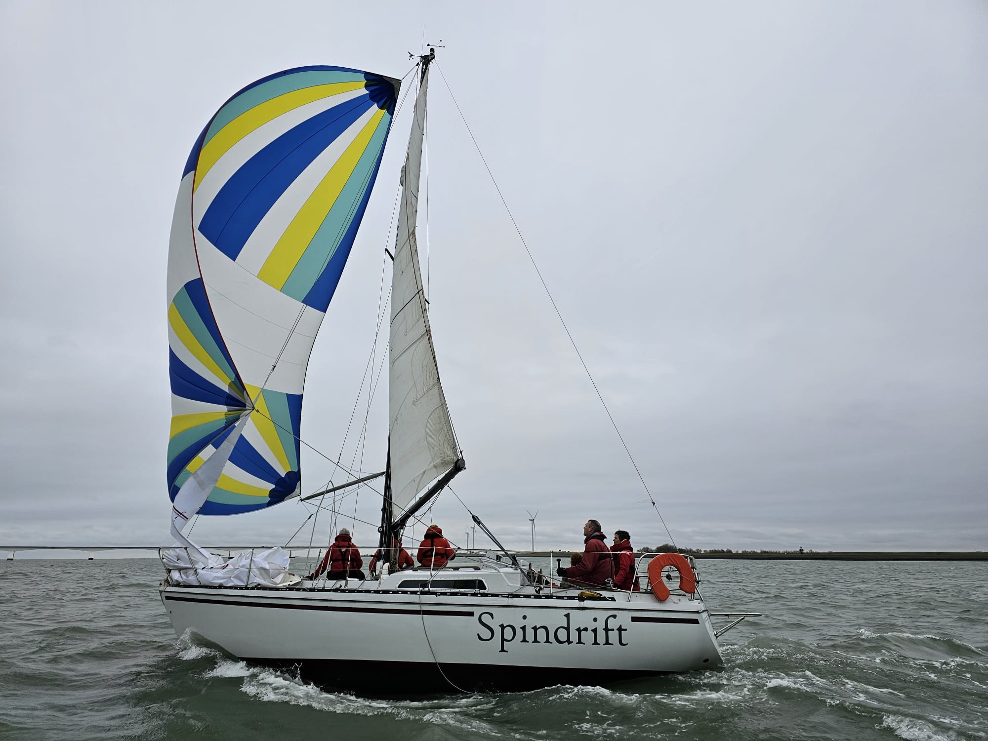 Bij de start is er een zwakke oosten wind, tij tegen, dus reeds voor het startsein trekken we de spi.