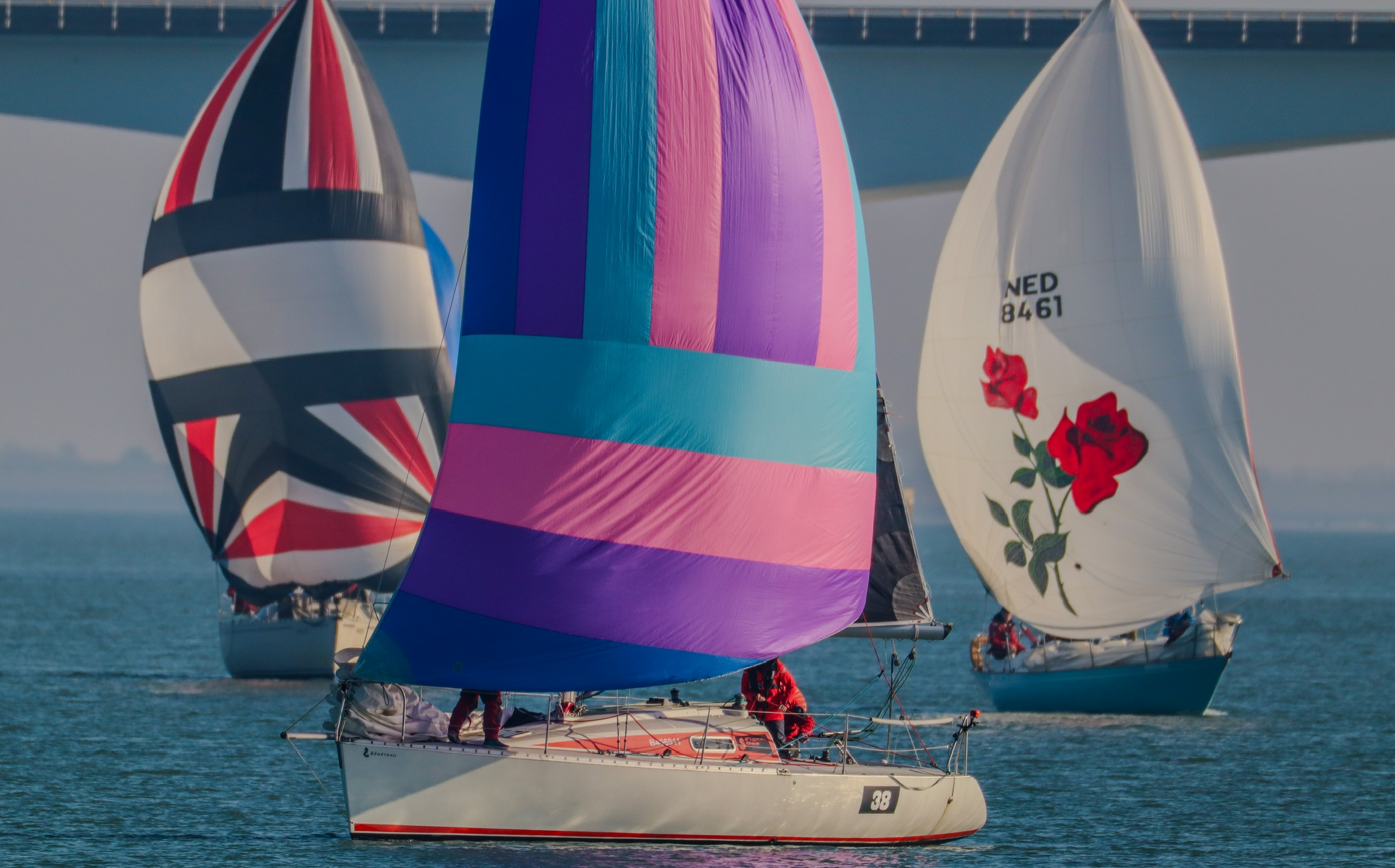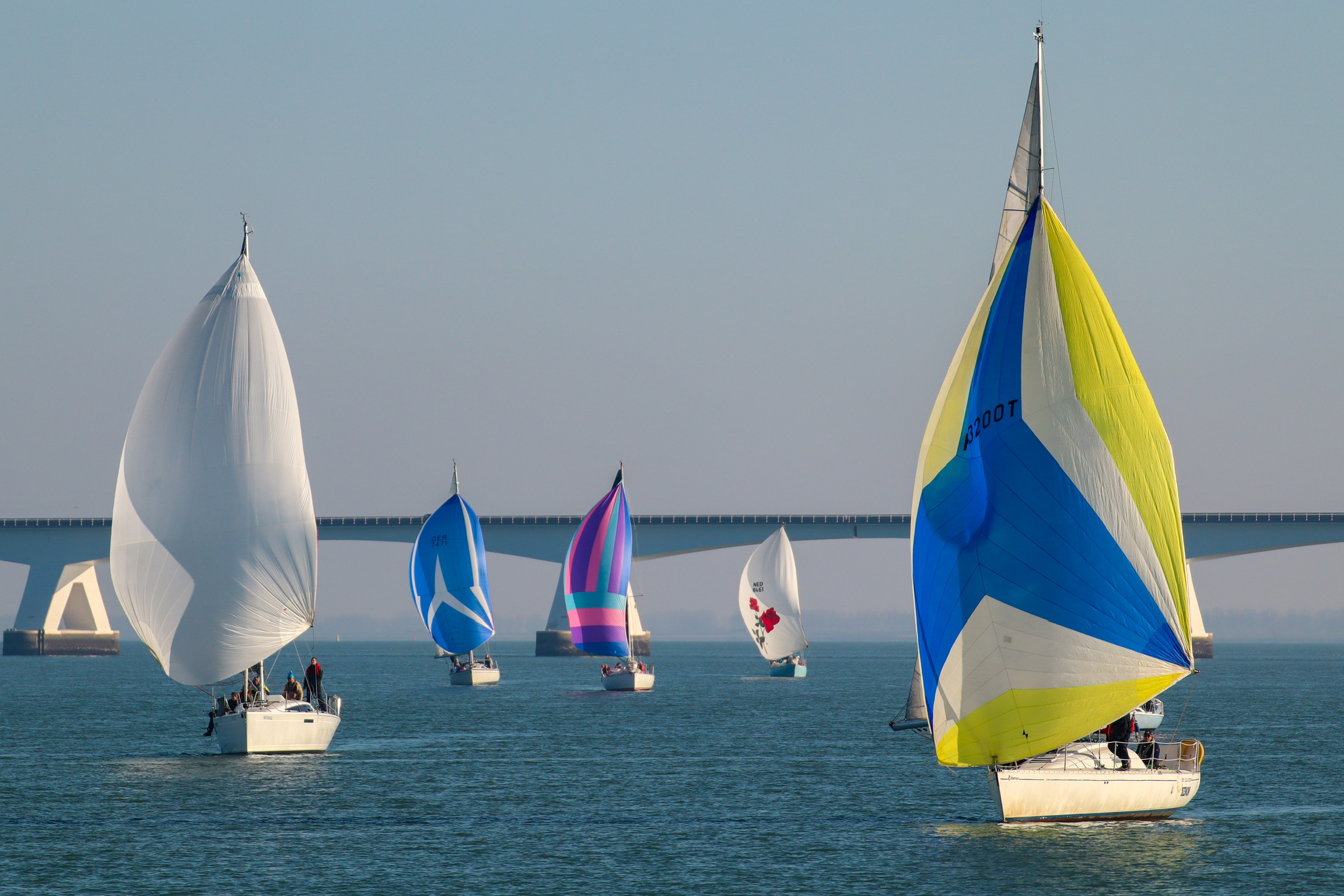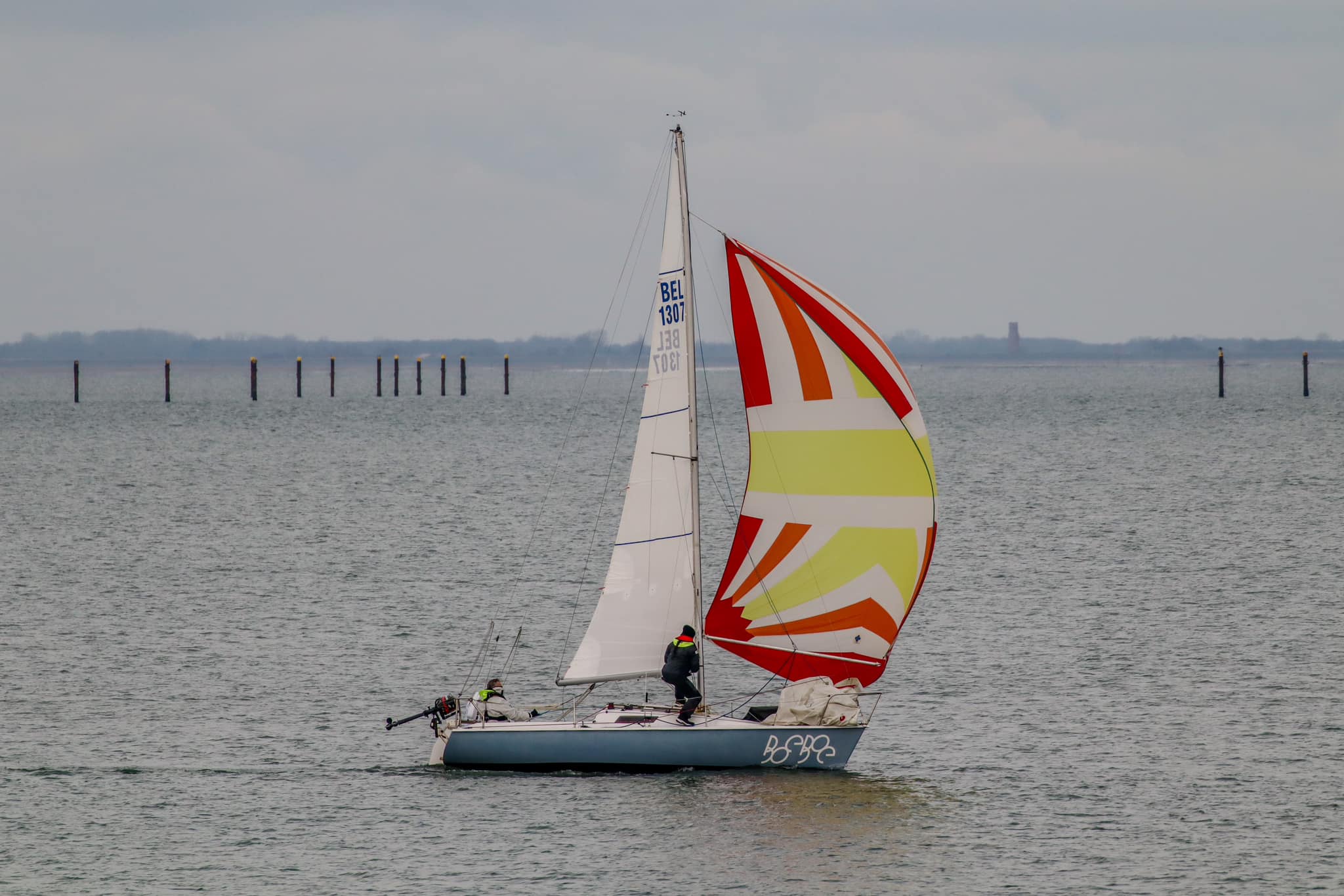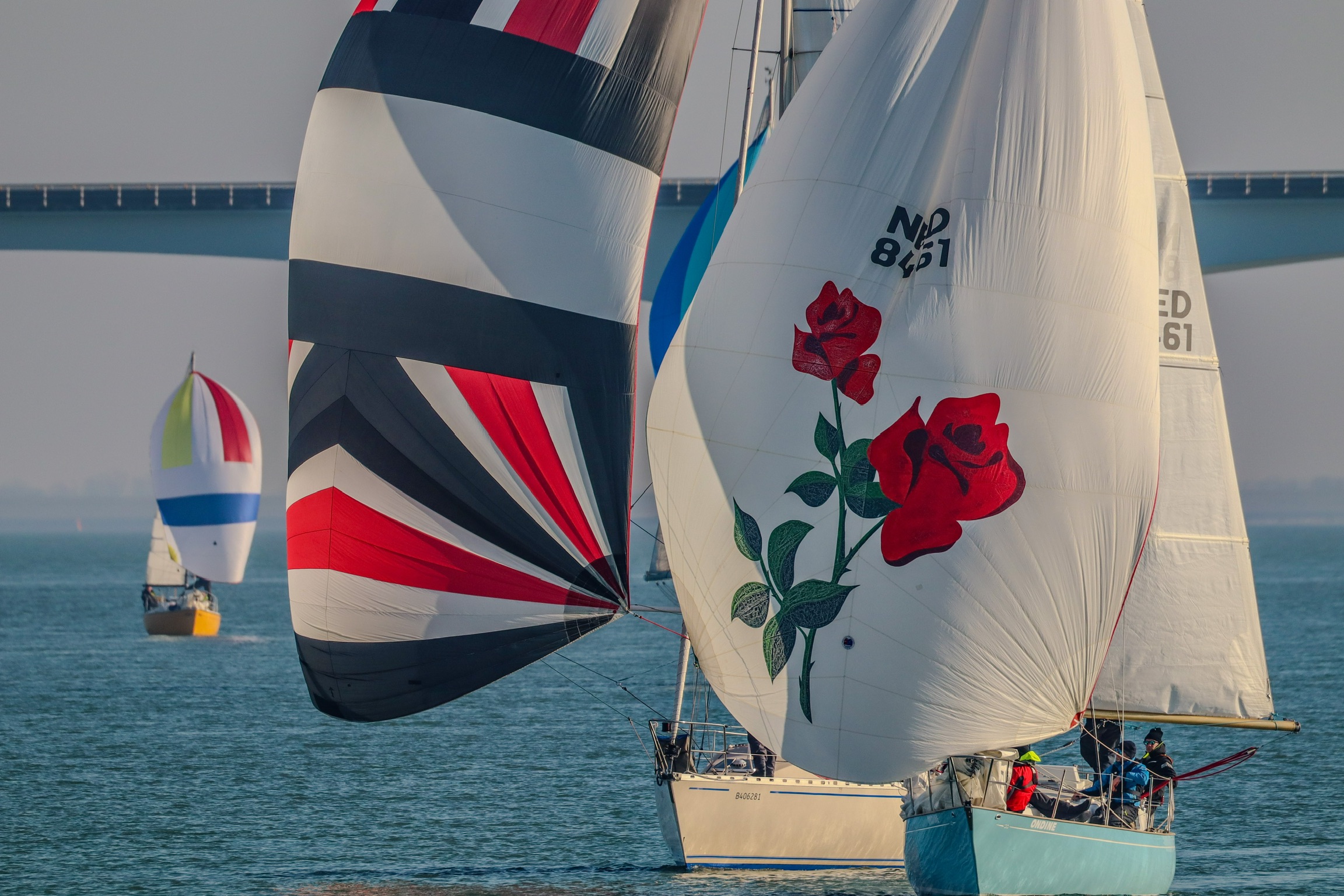 Bij de start is er een zwakke oosten wind, tij tegen, dus reeds voor het startsein trekken we de spi.