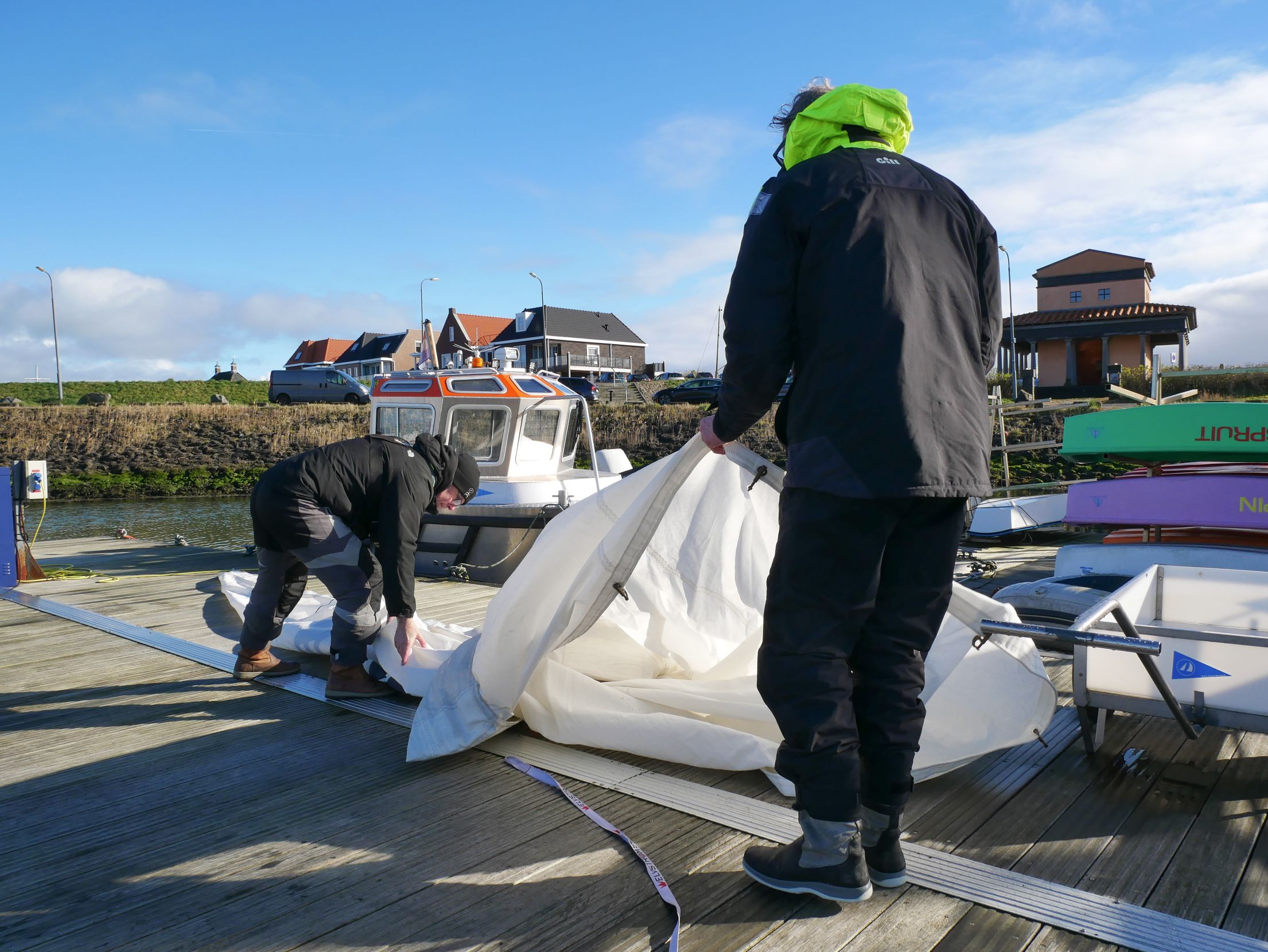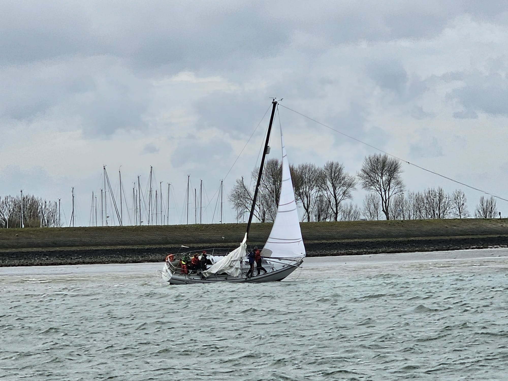Na vele weken met vrijwel elke dag regen was de verwachting dat er vandaag eindelijk een droge periode zou aanbreken. Op de heenweg in de auto is de weg nog nat en moeten de ruitenwissers af en toe nog even aan. Maar zodra we op de haven zijn wordt het droog. De temperatuur is rond de 4 gr. C. De windverwachting voor vandaag: Noord, 15 Kn toenemend in de loop van de middag naar 17/18 Kn.