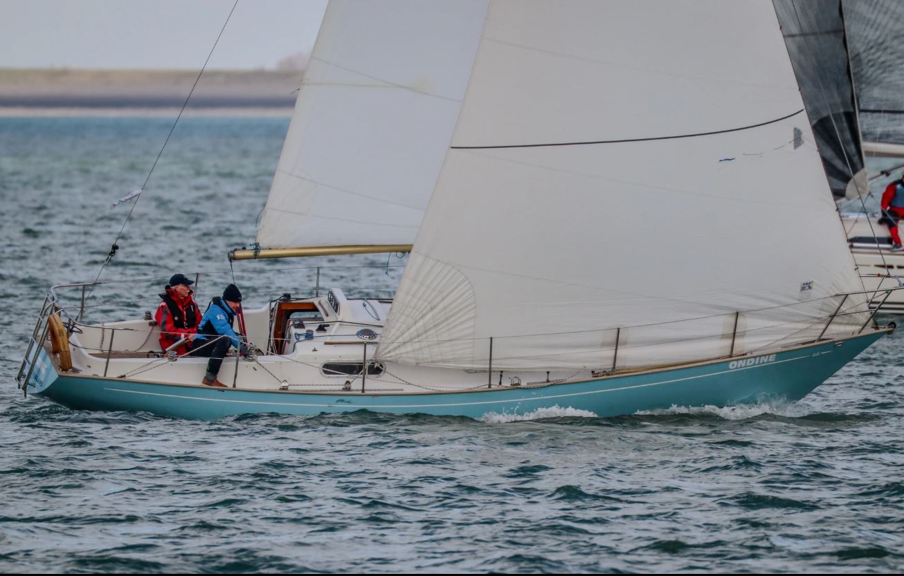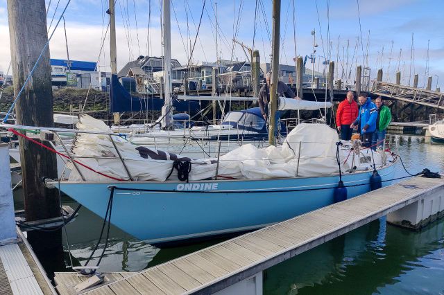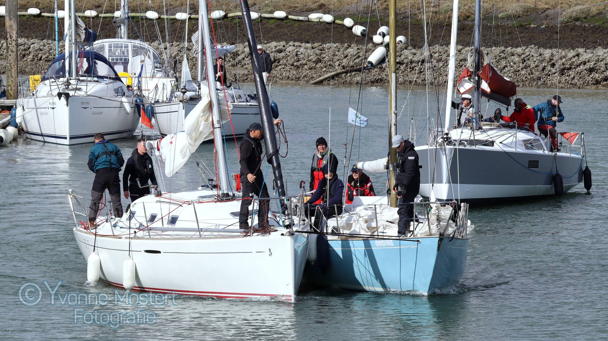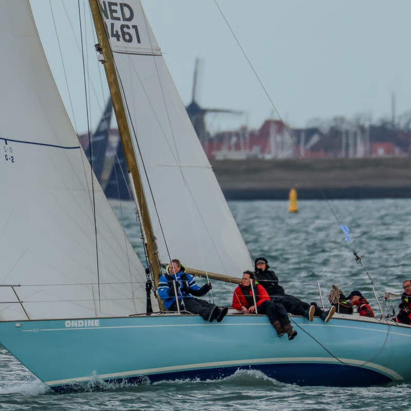 Als we rond 09:30 op de haven aankomen is de temperatuur nog net onder nul. De steigers en de dek van de Ondine zijn spiegelglad. Voorzichtig lopen op de steiger. We gooien snel een paar emmers zeewater over het dek en het kajuitdak. We zijn benieuwd wat de dag ons gaat brengen. Voorspelde wind 4 a 5bft ZZO. Temperatuur 5 a 6 gr, zonnig. Laag water om 11.30 dus de gehele middag opkomend tij. Eva is op wintersport, Michiel is haar vervanger. Alexander is ook weer van de partij en verder de vaste crew, Koert, Joost, Johan en ondergetekende. Bij de inschrijving vernemen we dat de geplande baan (die sinds de coronatijd vooraf wordt uitgeprint) te lang lijkt te zijn. Er is een nieuwe gemaakt, die wordt verdeeld via de groepsapp. Precies bij laagwater, vandaag toevallig extra laag, verlaten wij onze box. Aan het einde van de E steiger lopen we vast in de modder. Door enigszins een helling te maken en met de motor op extra vermogen lukt het om lost te komen. Eenmaal buiten blijkt er inderdaad de voorspelde windsterkte te staan. Onze start is om 12:20 naar het westen, dus wind van achter en stroom tegen. Dit keer 6 schepen aan de start in onze klasse, waaronder de twee licht boten, en onze grootste concurrenten, Boeboe en Shamrock. We besluiten het net te doen als vorige maand; spinaker hijsen kort voor de start, zonder afscherming van de genua. We zouden starten met de boom aan bakboord, maar omdat de meeste schepen in de andere klassen kiezen voor stuurboord besluiten wij dat op het laatste moment ook te doen. Op dat moment is er bovendien duidelijk ook nog wat wat minder wind. Gevolg is dat de spinaker zich niet direct vult en we vrijwel stil liggen. Ondanks dat we kort voor de startlijn liggen duurt het toch bijna twee minuten voordat we deze passeren. De les? Altijd je eigen plan trekken. Daarna direct de spinaker gegijpt. Boeboe is al gevlogen, maar alle andere deelnemers in onze klasse liggen achter ons. Eerst boei om te ronden is de SvC 7. Met wat extra gewicht op het voordek lukt het ons ca 2,2 Kn over de grond te behalen. Boeboe loop niet verder uit en het lukt ons zelfs een First 31.7 in te halen uit de voor ons gestarte klasse. Kort boor de boei nogmaals gegijpt en stuurboord uit richting SvC10. Ca 70-80 gr aan de wind, gaat prima onder spi met deze windkracht. Daar droppen we de spi en moeten we kruisen richting SvC 12. We behouden onze 2e plaats in onze klasse. Omdat we nu tij mee hebben gaat het vrij rap. Na het ronden van de SvC 12 nog twee slagen tot SvC11. Daar gaat de spinaker er weer op en sturen we zo ver mogelijk naar de dijk, waar de minste tegenstroom staat. Shamrock (First 210 Spirit) en Vintage(First 32) liggen niet ver achter ons en door ons iets uit de wind te zetten lukt het Vintage ons net voor de finish in te halen. Onder handicap geen probleem. Boeboe is dan al lang gefinshed en besluit nog een extra rondje te varen. Ze melden ons later die dag dat ze niet helemaal uit Brussel zijn komen rijden om 1 ¼ uur te zeilen. Shamrock finished ca 1 minuut na ons Dat zou op een wedstrijd van 1 ¼ uur 2 minuten moeten zijn. Einduitslag vandaag 1. Boeboe, 2 Shamrock, 3 Ondine. Hopelijk volgende maand eindelijk weer een “Contessa”weer, > 12Kn of meer.