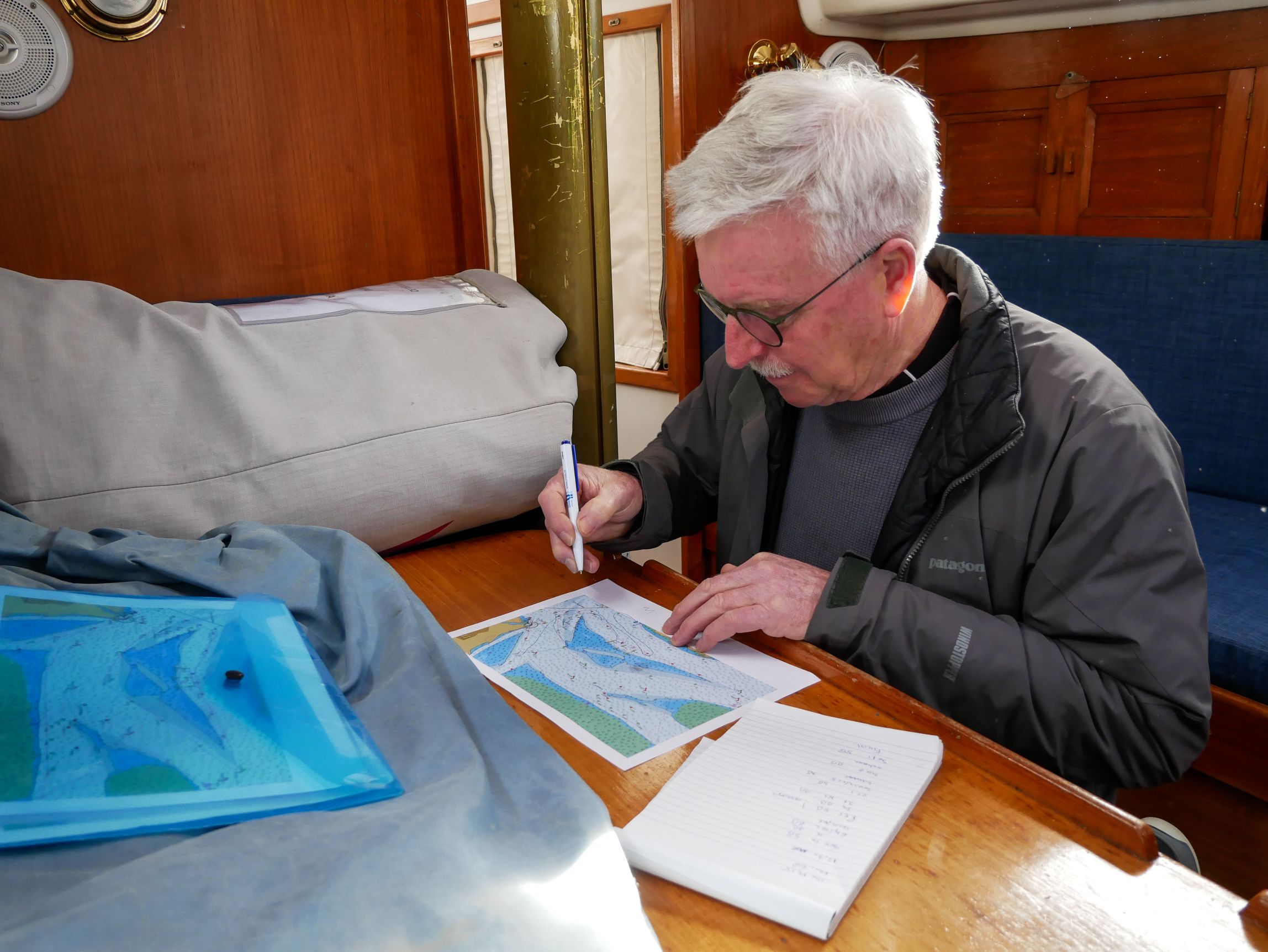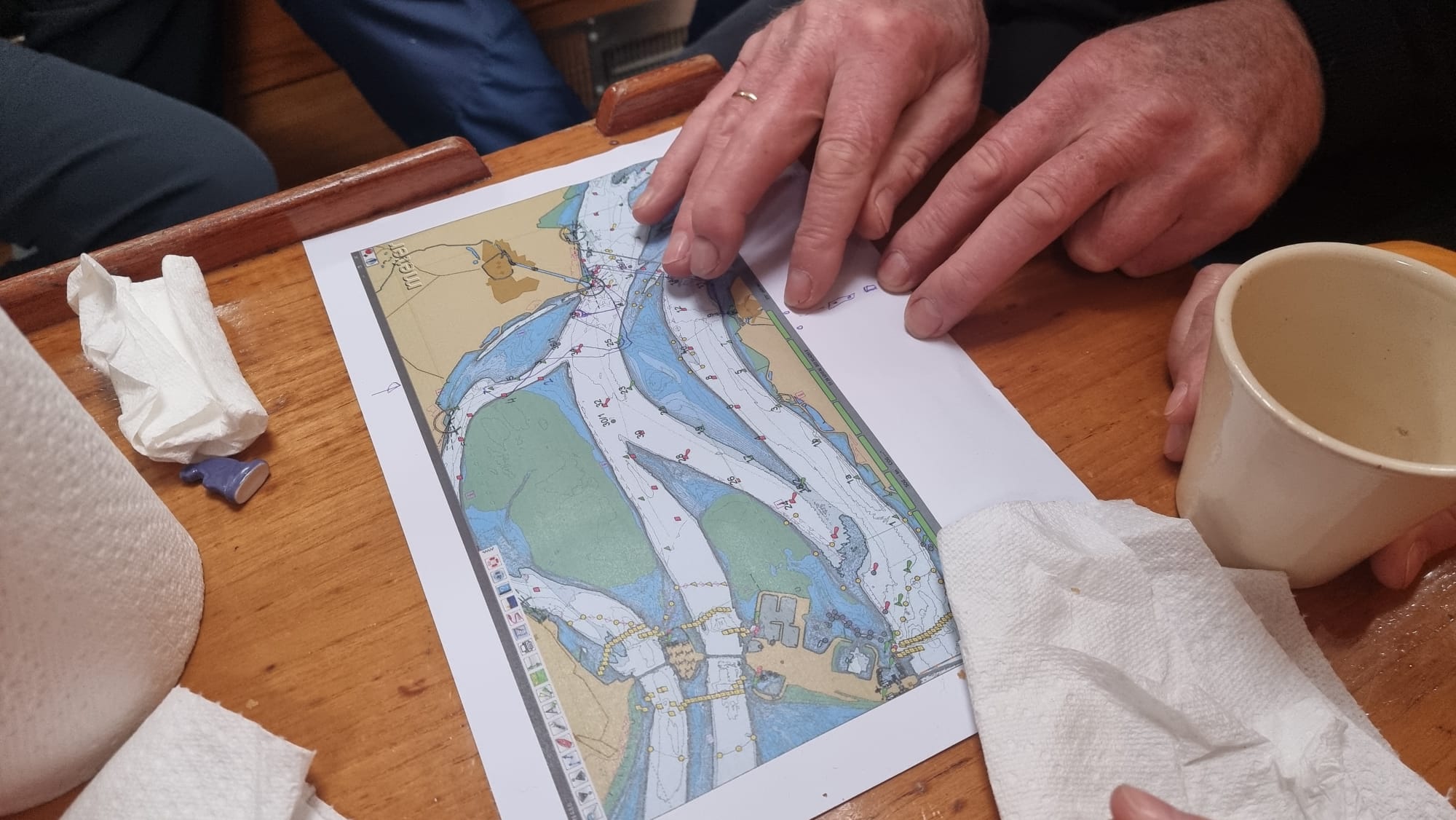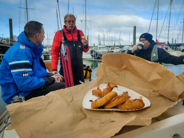 Drie zeilers van ons vaste team kunnen er vandaag om uiteenlopende redenen niet bij zijn. Als vervangers hebben Eric (van de CO32 Puffin) en Bas & Christina (van de CO32 Skylark) zich bereid getoond vandaag mee te varen. Omdat de start een half uur is vervroegd i.v.m. laag water rond 16:00 uur krijgen wij bij het inschrijven al de baan schriftelijk uitgereikt. De gebruikelijke breefing om 11:00 vervalt niet, maar bijwonen is niet verplicht/noodzakelijk. Wij blijven aan boord voor de voorbespreking, koffie en het nuttigen van een 3-koningen taart.