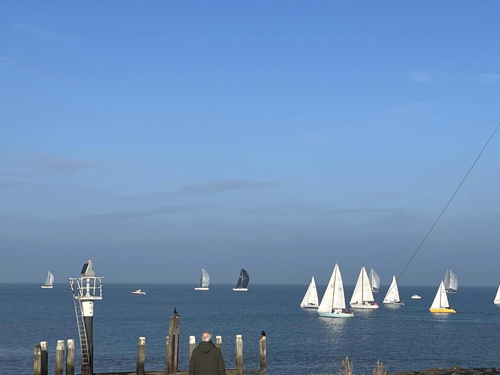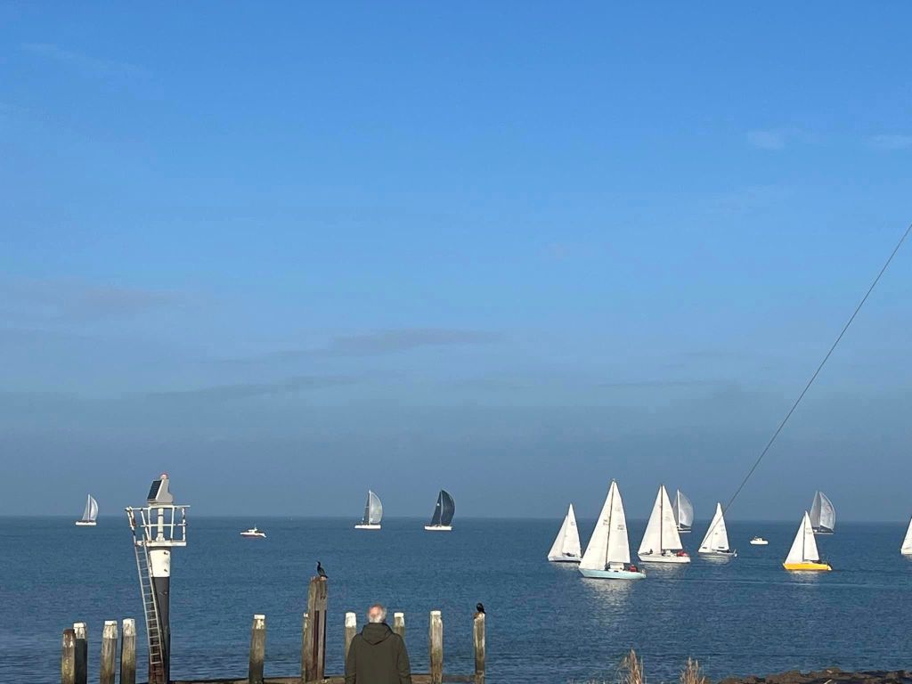 Gisteren, 20 december, hebben we Dé Kerstrace gevaren in Colijnsplaat. Hierbij vertrekken we allemaal op handicap, met de bedoeling om allemaal samen over de finish te gaan. Maar het blijft een race natuurlijk, dus eerst is eerst. We hadden onze start om 12:13:15u. De wind zuid 4-5dft verwacht, maar in de praktijk iets minder. Droog, temperatuur 11-13 gr!Bijou (CO26) mocht exact 0m 12:00u als eerste over de lijn varen. De starttijd van de laatste is een beetje aan ons voorbij gegaan. De route: het klassieke rondje plaat, start naar het westen. We hadden een goede start met 4-tal boten voor ons. Het doel was duidelijk : die 4 inhalen en zelf niet ingehaald worden. Na de start was boatspeed de bepalende factor tijdens een bijna halve-winds-rak. Groot Vuilbaard was een reachrak waar we extra snelheid konden halen onder spi. Net toen we planden om de spi te droppen, schoot hij uit de bek van de spiboom. Gelukkig konden we hem nog vlotjes en zonder brokken binnen halen. Bijou slaagde er in om tot aan de Overloop van Zierikzee eerst te blijven. Daar werd het kruisen en lagen wij eindelijk voorop. De rekenmeester had zijn job goed gedaan en iedereen kwam dichter bij. Tijdens het kruisen konden we onze eerste plek houden, we kwamen netjes uit aan de SvK11 en konden, met Andiamo als achtervolger naar de finish mikken. Het leek nog even te gaan spannen, op 0.2 nM van de lijn waren we er echter gerust in.Toch wel eens een fijne belevenis, zo als eerste over de lijn gaan. En een mooie afsluiter van het jaar.