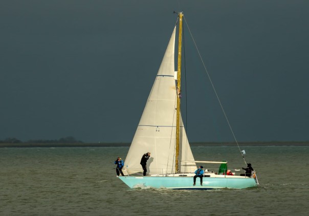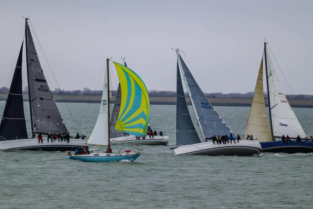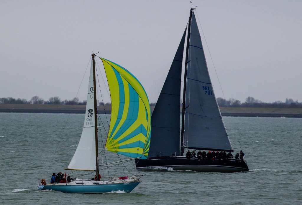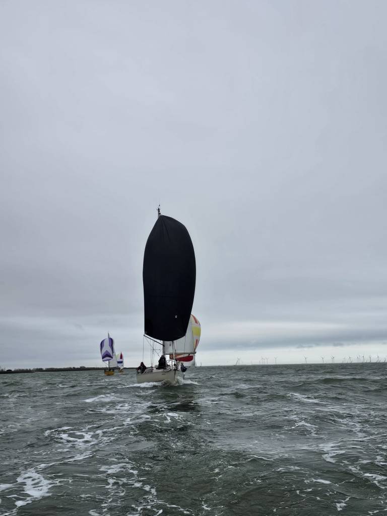 Zaterdag 4 maart. Het is de gehele week weer spannend of er deze dag weer voldoende wind zou zijn. De allerlaatste verwachting die ochtend is 8kn Noord oplopend naar 13kn, dat moet voldoende zijn. Eva en Sophie zijn vandaag afwezig i.v.m. resp. een navigatiecursus en de voorbereidingen voor een verbouwing. We hebben een vervanging gevonden in de persoon van Riemer. Ook eigenaar van een Contessa 32 “Murphy”, maar die is nog volop in een intensieve refit. Start om 12:30u zoals gebruikelijk. Het is heel erg druk aan de hoge kant van de startlijn. Spindrift, Boeboe en Spotgaai verdringen elkaar en liggen zij aan zij, tegen wind, tegen tij. Wij besluiten ons daar niet in te mengen en maken snelheid en gaan er onderdoor. Helaas valt de wind dan enige onder de 7kn. Zij lopen dan iets sneller en hoger. Bijkomend voordeel is dat zij dan ook dichter op de plaat varen en dan iets minder stroom tegen hebben. Bij de bovenboei, SvC8 liggen zij dan ook al een flink stuk voor.