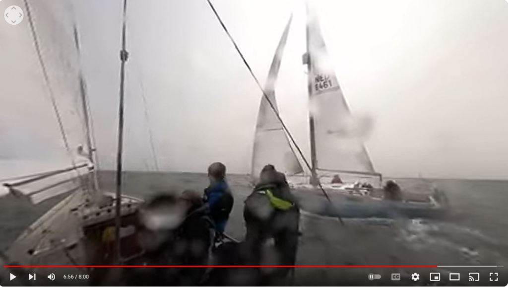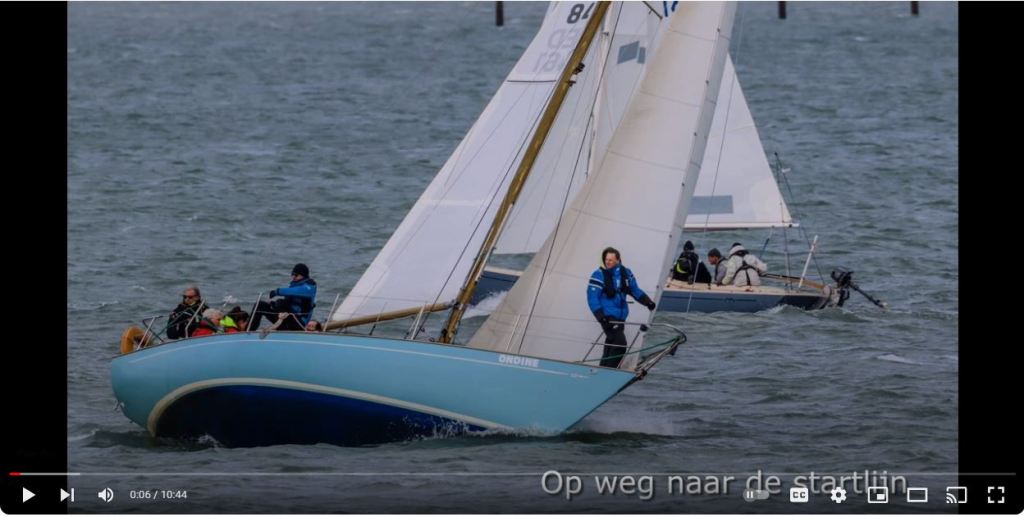 Het is slechts 0,8Nm tot de eerste boei, SvC10. Ruime wind, Spotgaai is de enige die de spi trekt. Zij zijn daardoor net iets eerder bij de boei. Gijpen, knal, de bevestiging van de grootschoot breekt van de giek. Snel een noodreparatie met een lijntje. We verlijeren naar de plaat. Nadat we weer op snelheid zijn hebben we 2 plaatsen verloren en ligt Spotgaai flink voor. Door het verlijeren moeten wij ook iets scherper varen om de SvC16 te kunnen halen. Daar bakboord uit en spi omhoog. We lopen Vintage voorbij. Voor R40 tijdig droppen, er is daar weinig ruimte tussen de boei en de wal. Bakboord uit, ca 60 gr. Aan de wind, naar R27. Stuurboord uit richting Hammen. Spi omhoog (deze was in recordtempo gevouwen door Eva) en we lopen Hygieia voorbij. Spotgaai ligt nog vrij ver voor. We passeren R34, en vervolgen onze weg door de Hammen zonder te gijpen. De wind neemt tijdelijk iets af in kracht en we besluiten na de H5 te reachen naar de laatste te ronden boei in de Hammen. Spotgaai doet dit niet, dropt de spi, waardoor wij nu snel op hen inlopen. Na het ronden van de boei liggen we kort achter hen. Nu terugkruisen naar R25. Soms kruisen we achter hen langs, soms ervoor. Zij ronden de R25 als eerste, wij kort daarachter. Ze sturen vervolgens een te ruime koers waardoor ze iets terrein verliezen. Onze navigator stuurt ons met de juiste koers naar de volgende boei (OZ1) en nu lopen wij ze voorbij. Tot de laatste boei voor de finish (SvC16) lukt het ze niet ons te passeren. Daar aangekomen (wij over BB, zij over SB) denken ze ons nog te kunnen passeren. Dat bleek dus niet te kunnen, wij snel door de wind, zij ook, maar toch raken we elkaar net. We kunnen beiden onze weg vervolgen en wij gaan als eerste over de finishlijn. Na de wedstrijd trekt Spotgaai zich terug uit de uitslag, Spindrift heeft zich in de loop van de midddag ook teruggetrokken, doordat ze een schoot in de schroef kregen. Gevolg van dit alles, wij P1 van de dag en P1 in het algemeen klassement. Vandaag zelf geen fimpje kunnen maken. Adri van de Spotgaai wel met zijn mooie 360gr Gopro. Ondine is te zien van1:00 tot 1:45 (de start) en van 5:30 tot 5:50 (wel even de camera naar achter draaien) en van 6:50 tot 7:10