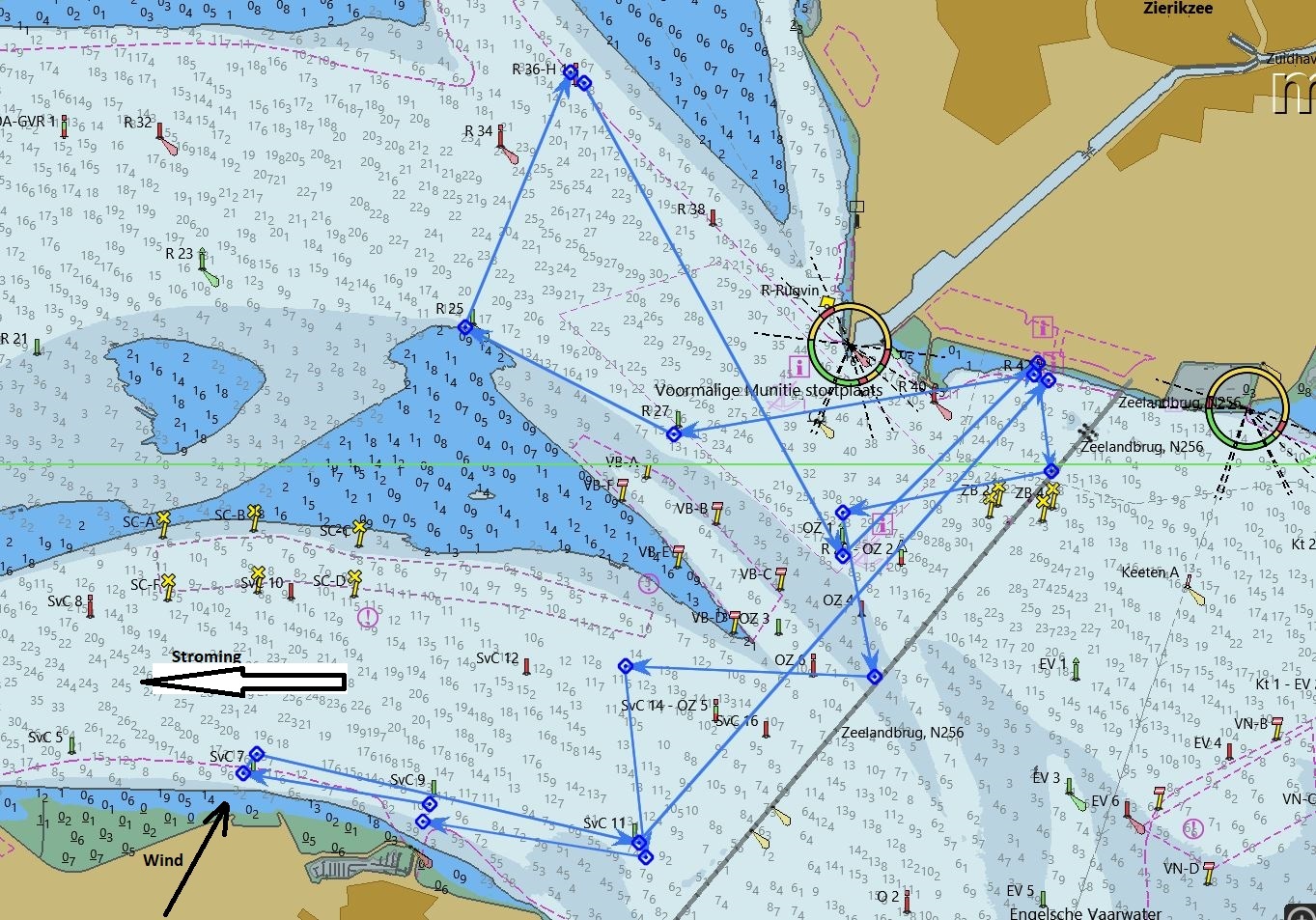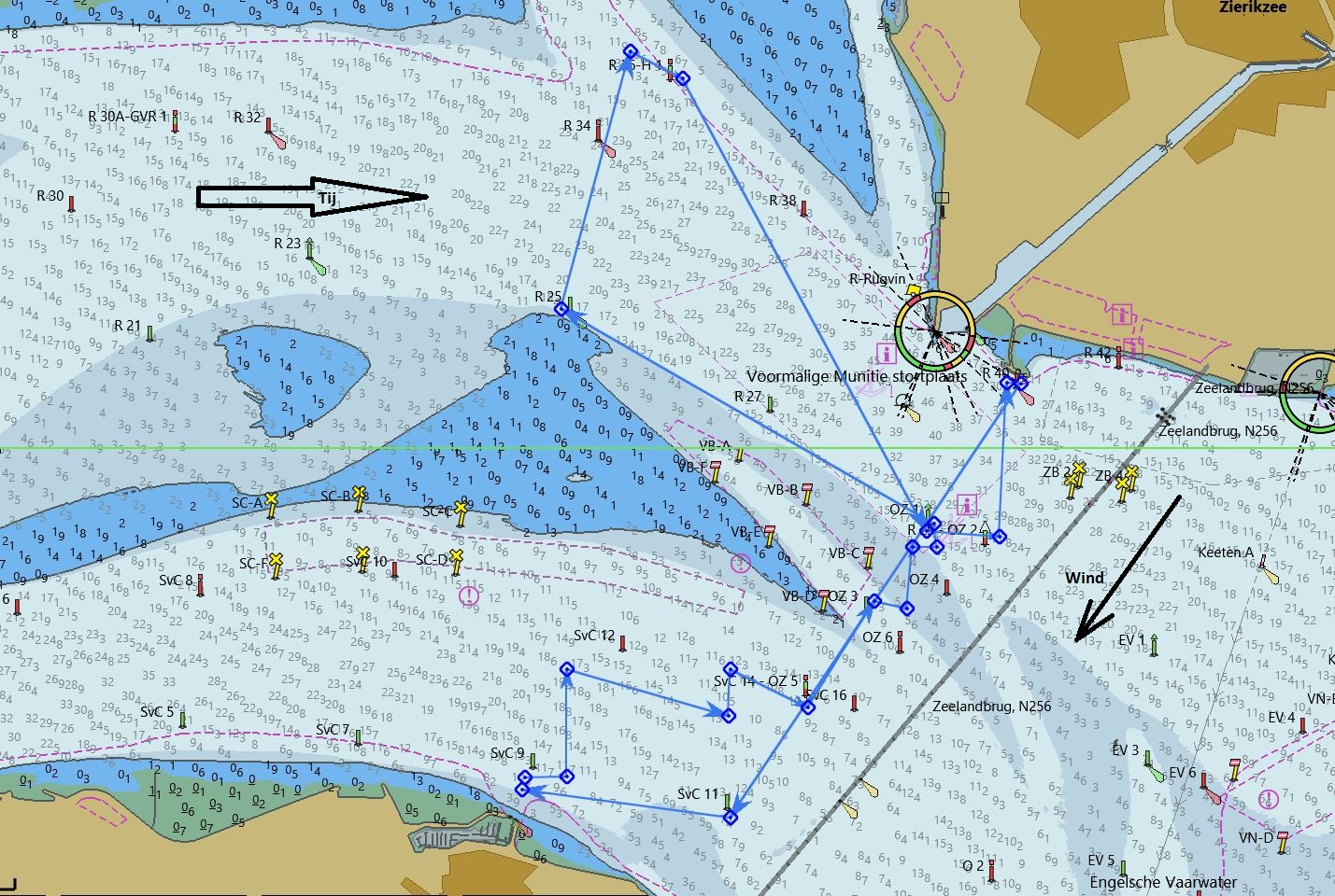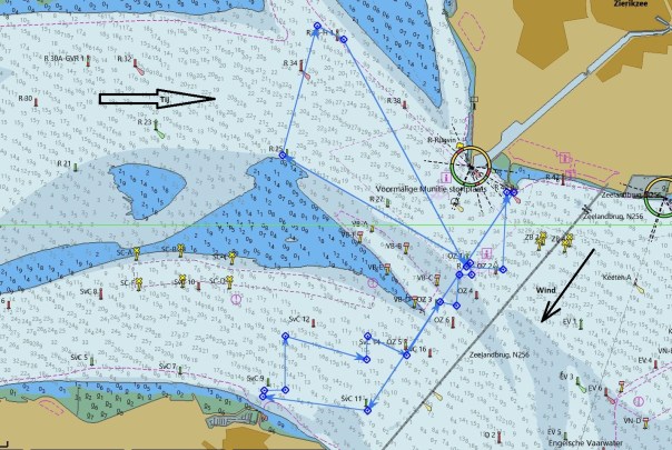 Na SvC8 bakboord uit, aan de wind. Dan volgen er meer en zo snel het kan gaan wij overstag om vrije wind te houden. Kort voor SvC1b (die bijna niet te zien is, omdat hij onder water wordt getrokken door de sterke stroming) worden wij bijgelopen door Vintage. Eén van de concurrenten in onze klasse, die volgens de rating sneller moet zijn dan wij. Daar gaan we weer stuurboord uit en met ruime wind naar SvC4. Vervolgens door naar SvC8, SvC5, SvC10, steeds ruime-, halve- of aan de wind. Geen enkele keer is het mogelijk onder spinaker te varen. De windmeter geeft soms meer dan 20Kn wind aan, met sterke vlagen.