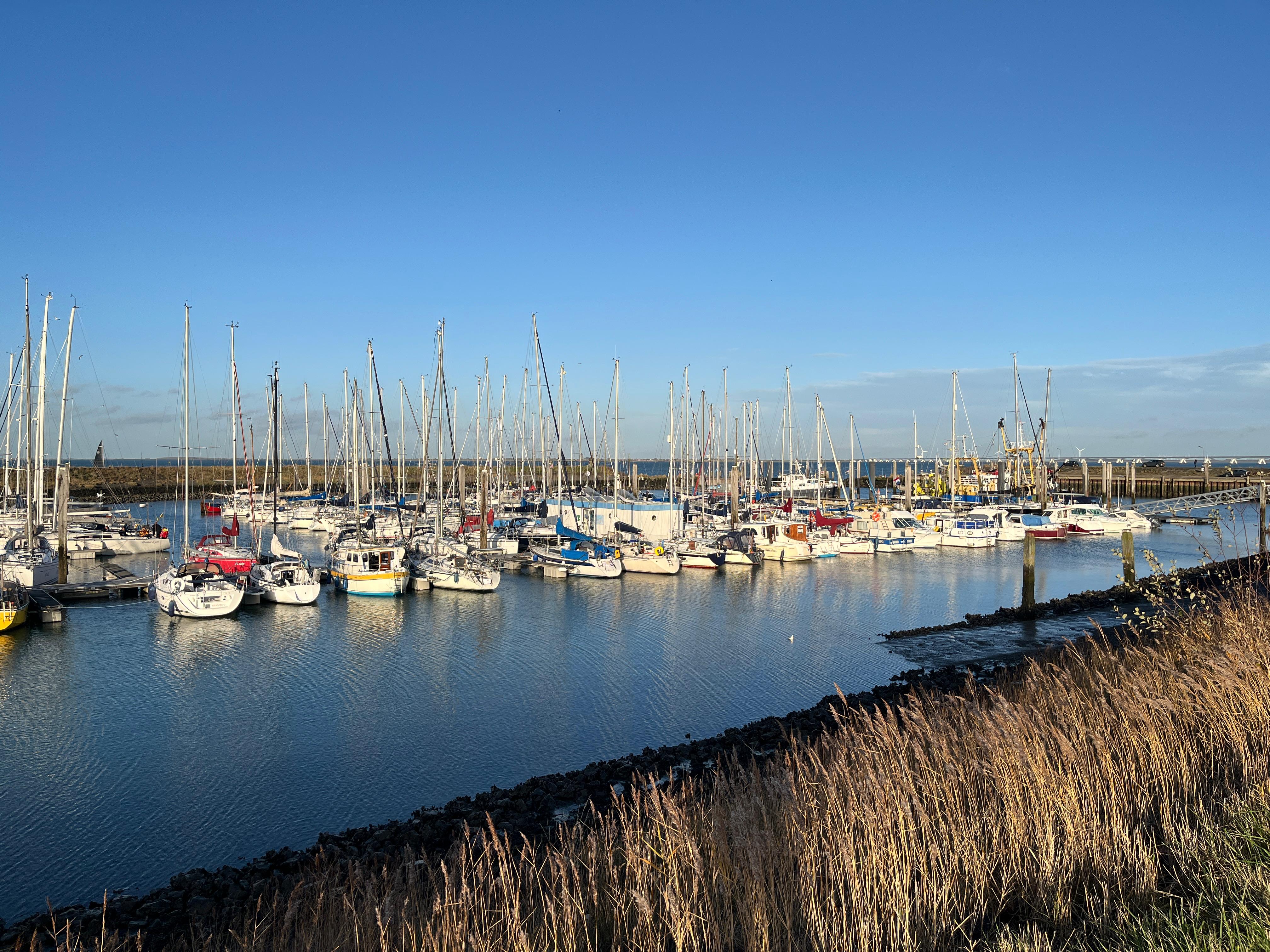Windverwachting 10Kn ZZO, temperatuur +3 gr C. Geen neerslag. Bij aankomst zijn de steiger en het dek nog glad van de nachtvorst.