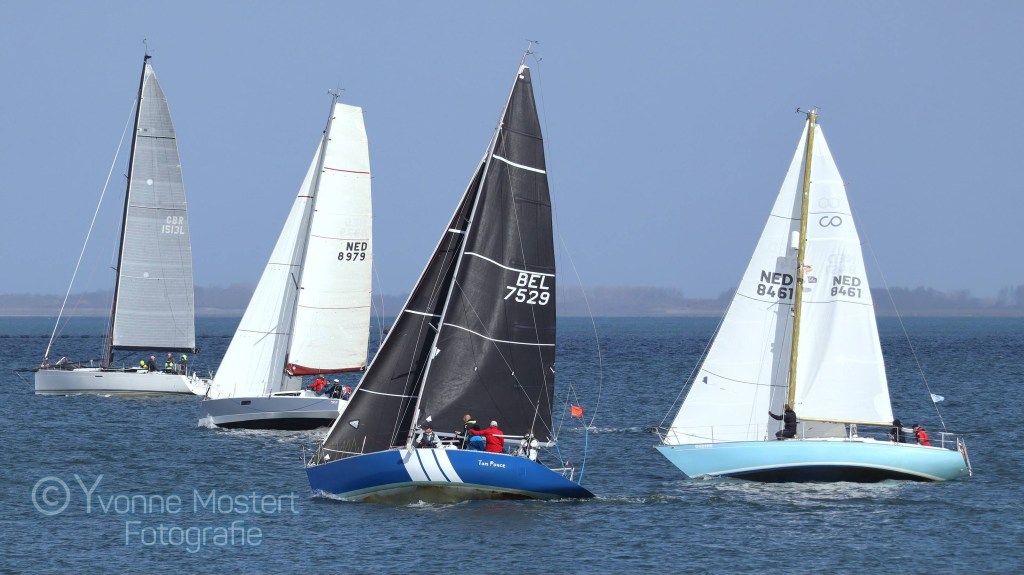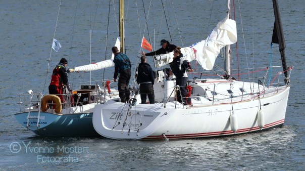 Op het water is het zicht erg slecht, maar we te doen. Windkracht 5-6kn NNO. Onze start (naar het oosten)12:20u wordt 1 minuut uitgesteld, 20:21u. We gaan samen met Shamrock als eerste over de lijn, maar passeren haar al vrij snel, richting SvC16. We lopen uit op onze achtervolgers. Voor de brug gaan we twee keer overstag. Dan is OZ1 te bezeilen en verder richting R38. Ook die is te bezeilen en we kunnen alles goed voorbereiden om daarna de spinaker snel te kunnen hijsen. Omdat er nog steeds weinig wind is besluiten we iets af te kruisen, dus 2x gijpen, voordat we R27 bereiken. Daar droppen we de spi en maken een slag over SB richting R34. We liggen nog altijd ruim voor op met name Vintage en Boeboe. Richting R25 besluiten we weer iets af te kruisen onder spi. We zien dat we samen met Le Rayon Ver aan gaan komen bij deze boei. Het probleem is dat zij in een andere klasse varen en de boei aan SB moeten houden en wij aan BB. Zij varen over BB en wij over SB, dus wij moeten hen ruimte geven. Het is daar meteen erg ondiep achter de boei. Kort voor de boei maken wij onze laatste gijp en geven Le Rayon Ver ruimte Dan slaat het noodlot toe; een zandloper. Alle actie is gericht om dat te verhelpen en we verliezen de vaarrichting uit het oog. Gevolg: vast op de plaat. Snel de spi gedropt, de motor even gestart en we zijn vrij snel weer los. Vintage en Boeboe lopen ons nu voorbij. We hervatten ons koers, hijsen de spi en proberen er het beste van de maken. We zullen het melden aan de wedstrijdleiding en gaan ervaren hoe ze dit gaan beoordelen. We ronden R27 en OZ1 nog altijd onder spi. Nu met de vloedstroom dwars richting SvC11. De wind neemt af 3Kn of minder. Boeboe en Vintage lijken de stroming te onderschatten en drijven steeds verder af naar de brug. De wind lijkt nu helemaal weg te vallen en er komt een moment dat de motor moet worden gestart. Vintage doet dat op een gegeven moment en geeft dus op. Boeboe is inmiddels bijna bij de dijk om in het ondiepe water minder tegenstroom te hebben. Wij passeren toch nog SvC11, droppen de spi en hijsen de genua, maar het lukt niet tegen de 2kn stroming in te komen. Ook Boeboe maakt geen vorderingen richting Colijnsplaat. Wij verwachten dat uiteindelijk iedereen op zal geven en we varen op de motor terug naar de haven.