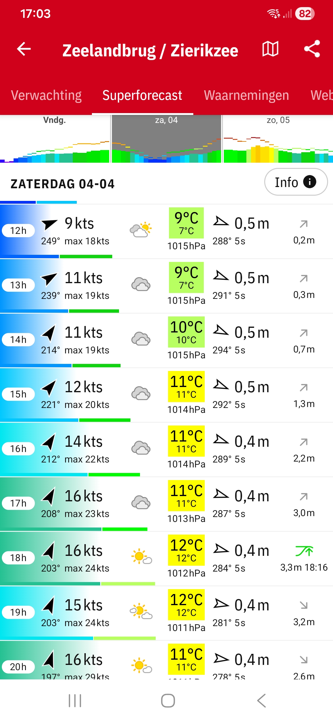 Zaterdagochtend is de verwachting nog altijd ZZW 13 Kn, in de loop van de middag ruimend naar ZW en 15-17kn.